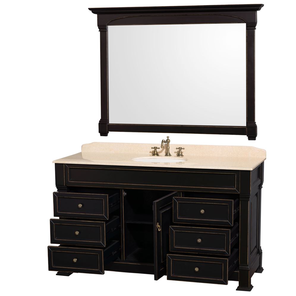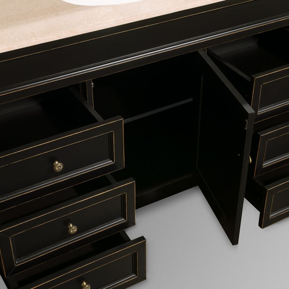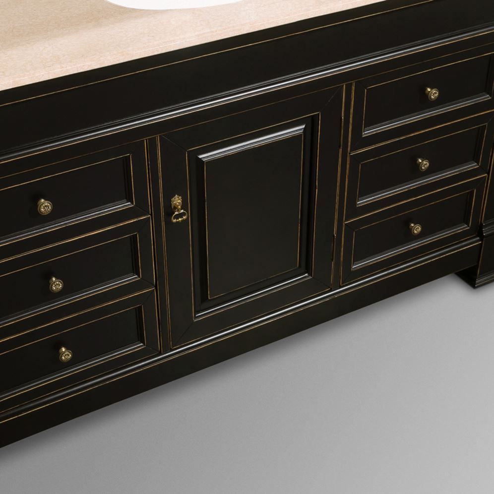 The vanity is hand carved and stained and comes in black, dark cherry and white finishes. Choose a natural stone countertop in White Carrara, Ivory Marble or Imperial Brown Granite cut with a beautiful beveled edge. Available in a range of single or double vanity sizes to fit any bathroom.