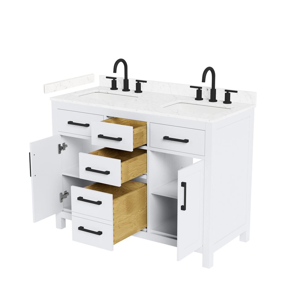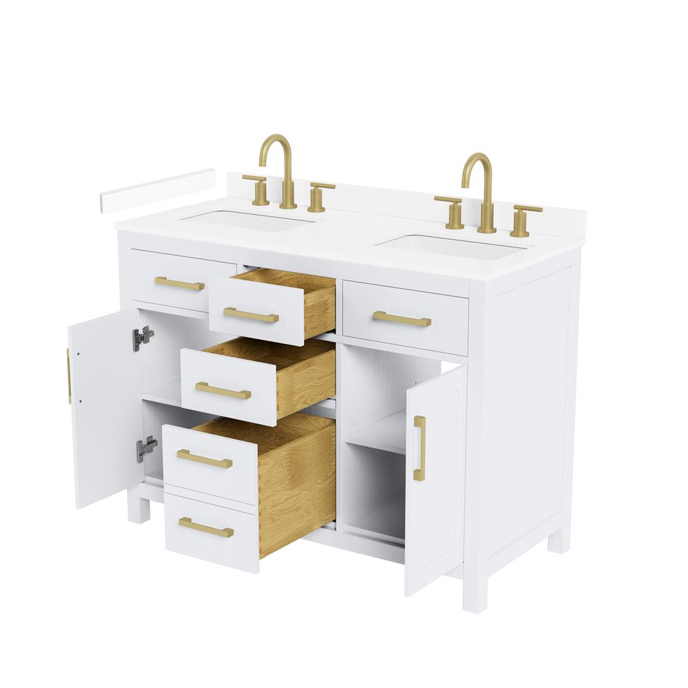 Fantastic value and classic design. The elegant Beckett vanity has it all, with quality touches like brushed nickel, brushed gold, or matte black accents, dove-tailed drawers, and soft-close doors and drawers. Ample storage and a double-depth lower drawer give you plenty of room for those bathroom necessities. Do your bathroom right, with the beautiful Beckett vanity series.