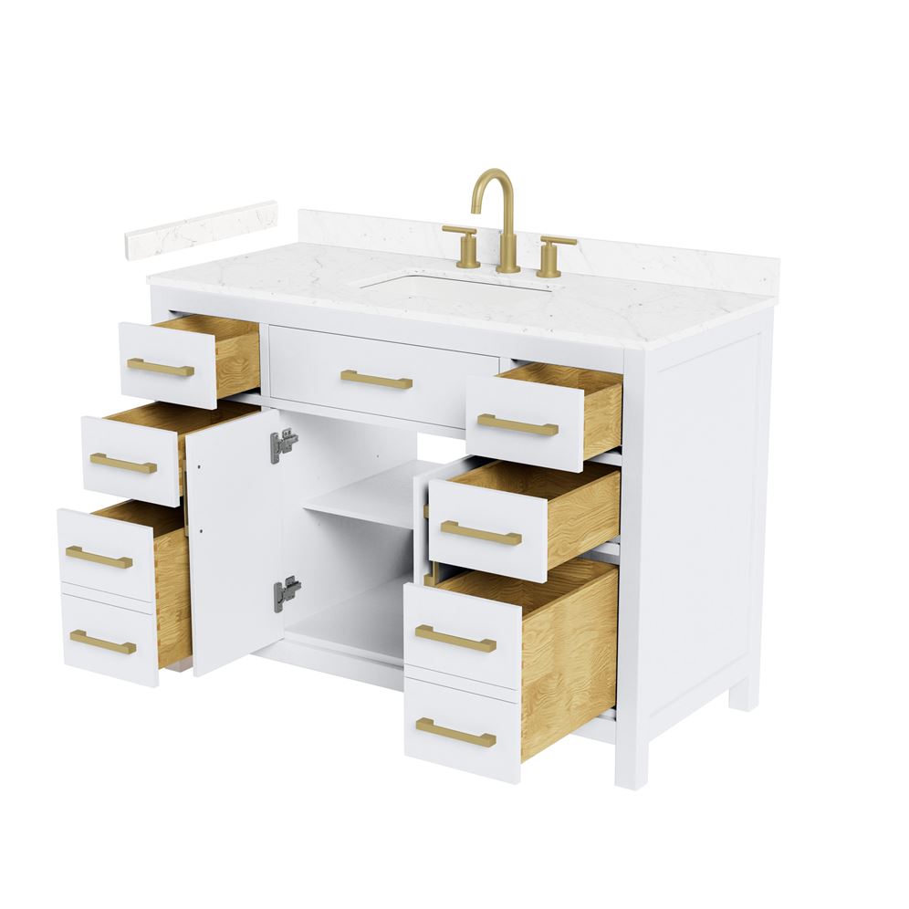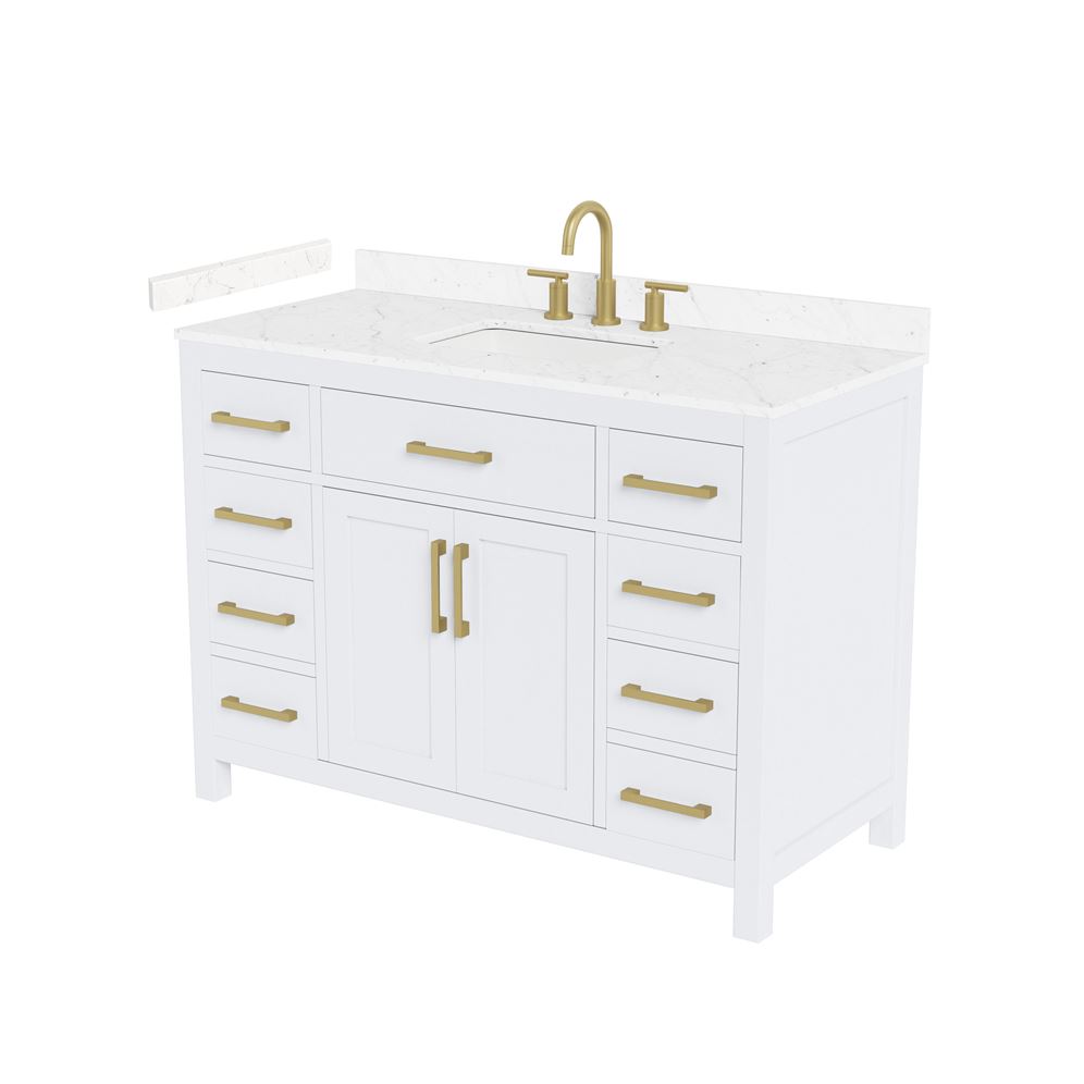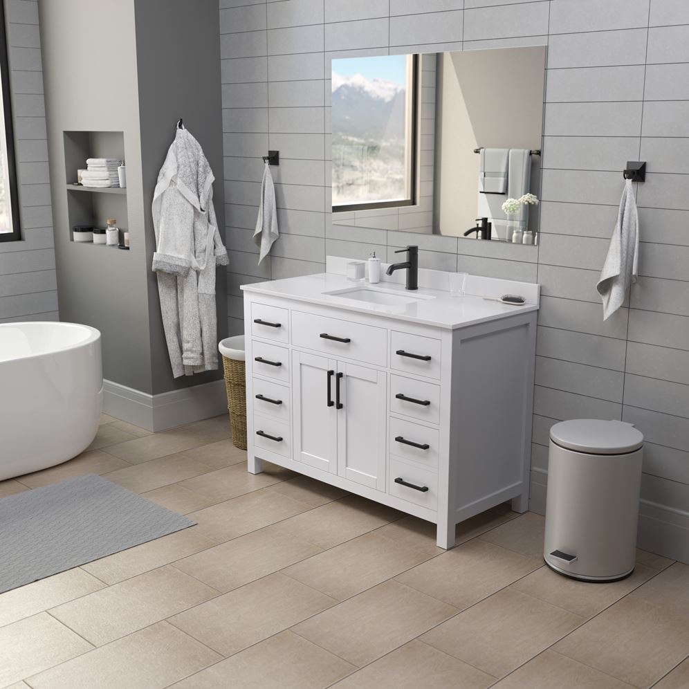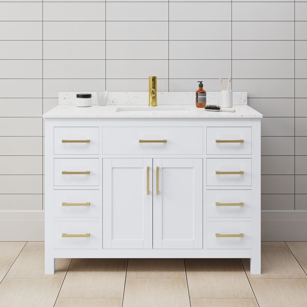 Fantastic value and classic design. The elegant Beckett vanity has it all, with quality touches like brushed nickel, brushed gold, or matte black accents, dove-tailed drawers, and soft-close doors and drawers. Ample storage and a double-depth lower drawer give you plenty of room for those bathroom necessities. Do your bathroom right, with the beautiful Beckett vanity series.