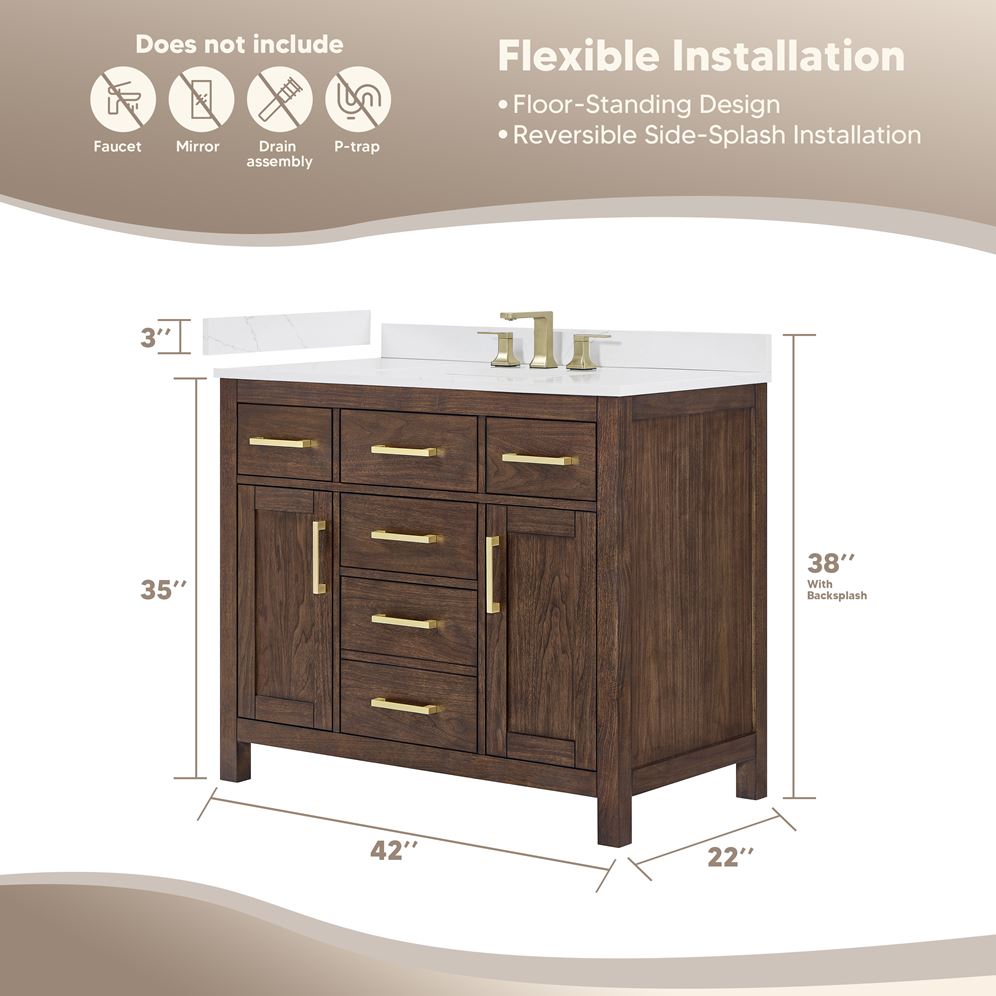 - Counter includes 3" backsplash and reversible side-splash