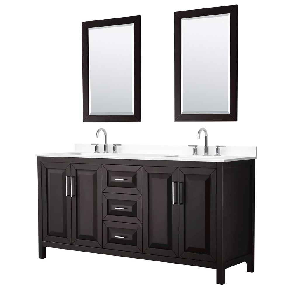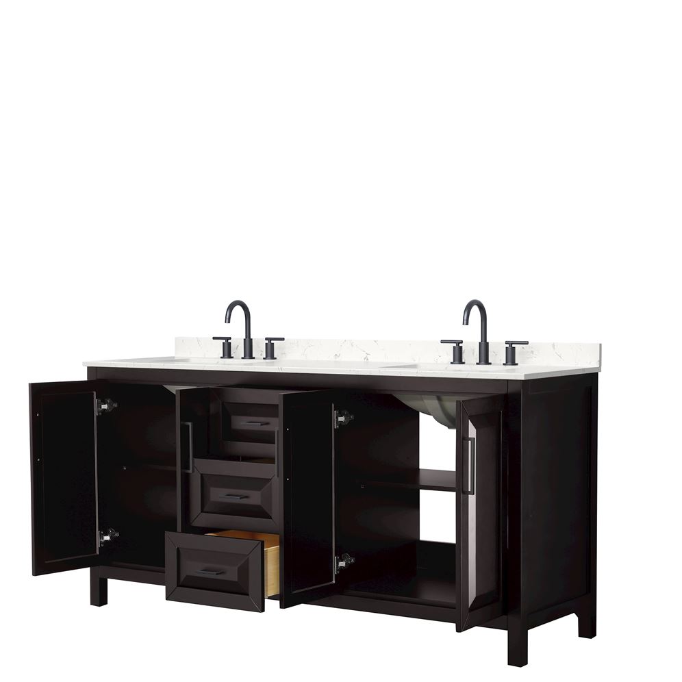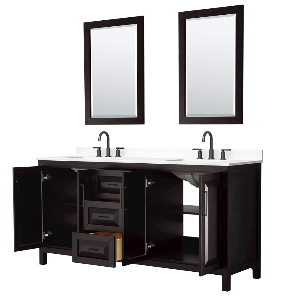 The beautiful Daria collection vanities stand out in any bathroom with strong, clean lines, raised panels and elegant counters with square sinks. There's plenty of cabinet space, the fully extending drawers are dovetail construction, and matte black or polished chrome finish detailing completes the look. Daria vanities deftly combine the function of today with a nod to the elegance of the past. It's the new modern - classic styling with a contemporary twist.
