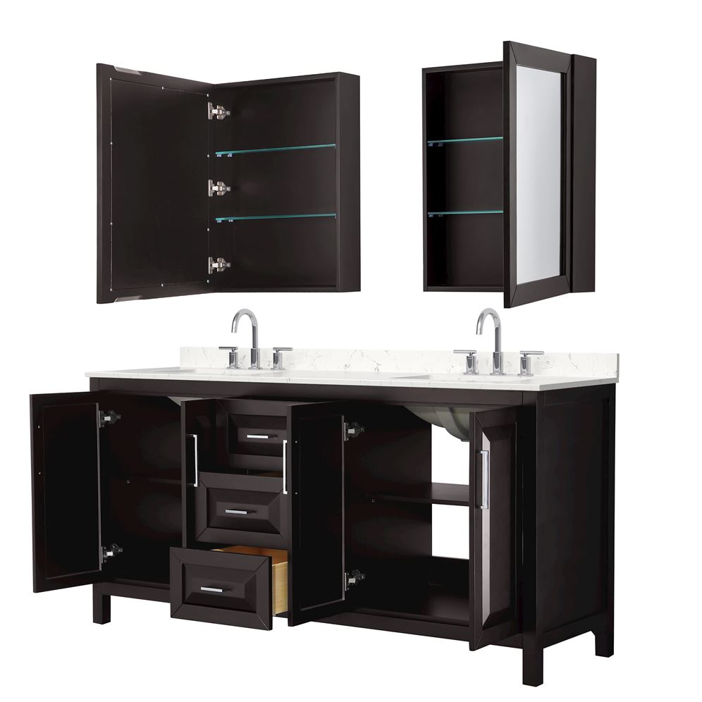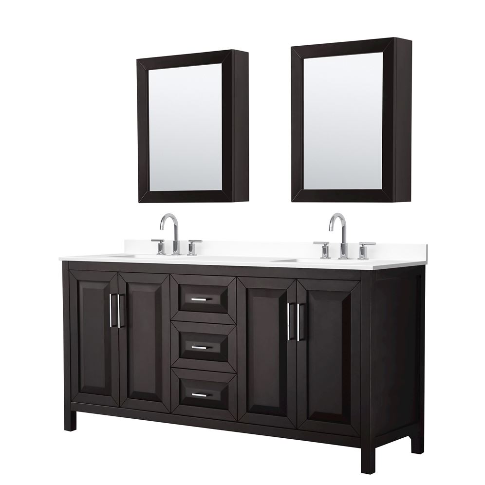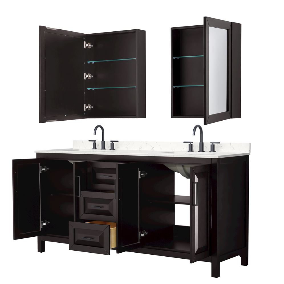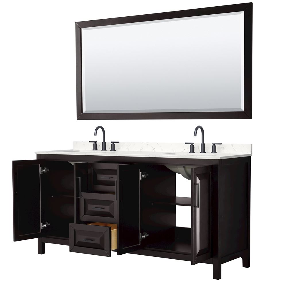 The beautiful Daria collection vanities stand out in any bathroom with strong, clean lines, raised panels and elegant counters with square sinks. There's plenty of cabinet space, the fully extending drawers are dovetail construction, and matte black or polished chrome finish detailing completes the look. Daria vanities deftly combine the function of today with a nod to the elegance of the past. It's the new modern - classic styling with a contemporary twist.