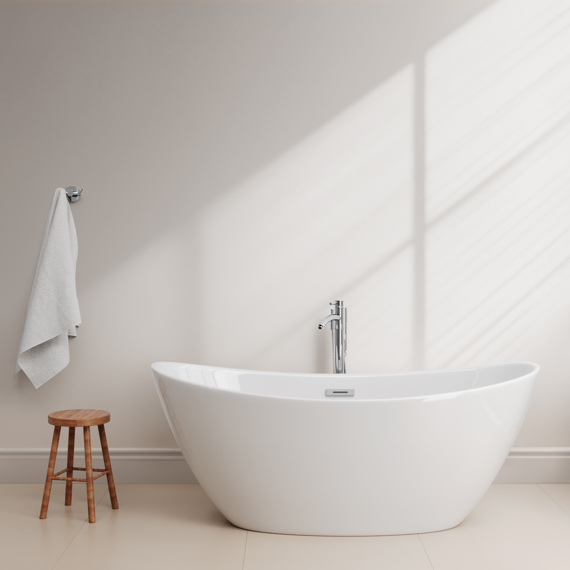 Transform your bathroom into a luxurious spa retreat with this beautiful white acrylic double slipper tub. Designed with gracefully sloped ends, this freestanding bathtub provides the ultimate comfort and support for a relaxing soak. The high-gloss acrylic finish not only adds a touch of elegance but also ensures durability, heat retention and easy maintenance, with a smooth, non-porous surface. Its lightweight yet sturdy construction makes installation simple. This tub is perfect for both classic and modern bathroom designs, making it the ideal centerpiece for unwinding after a long day. Available in 2 sizes and built for a more comfortable and generous bathing experience.