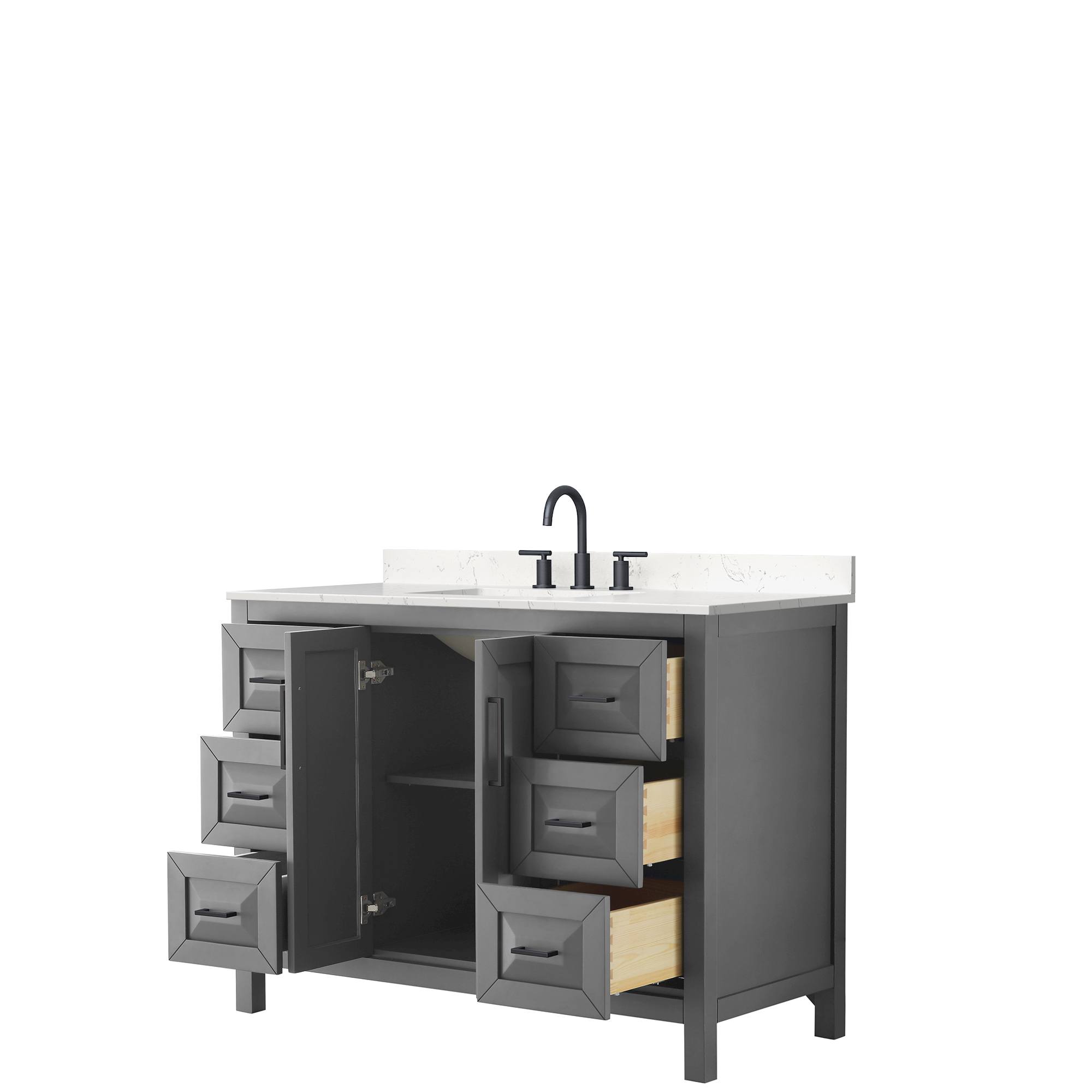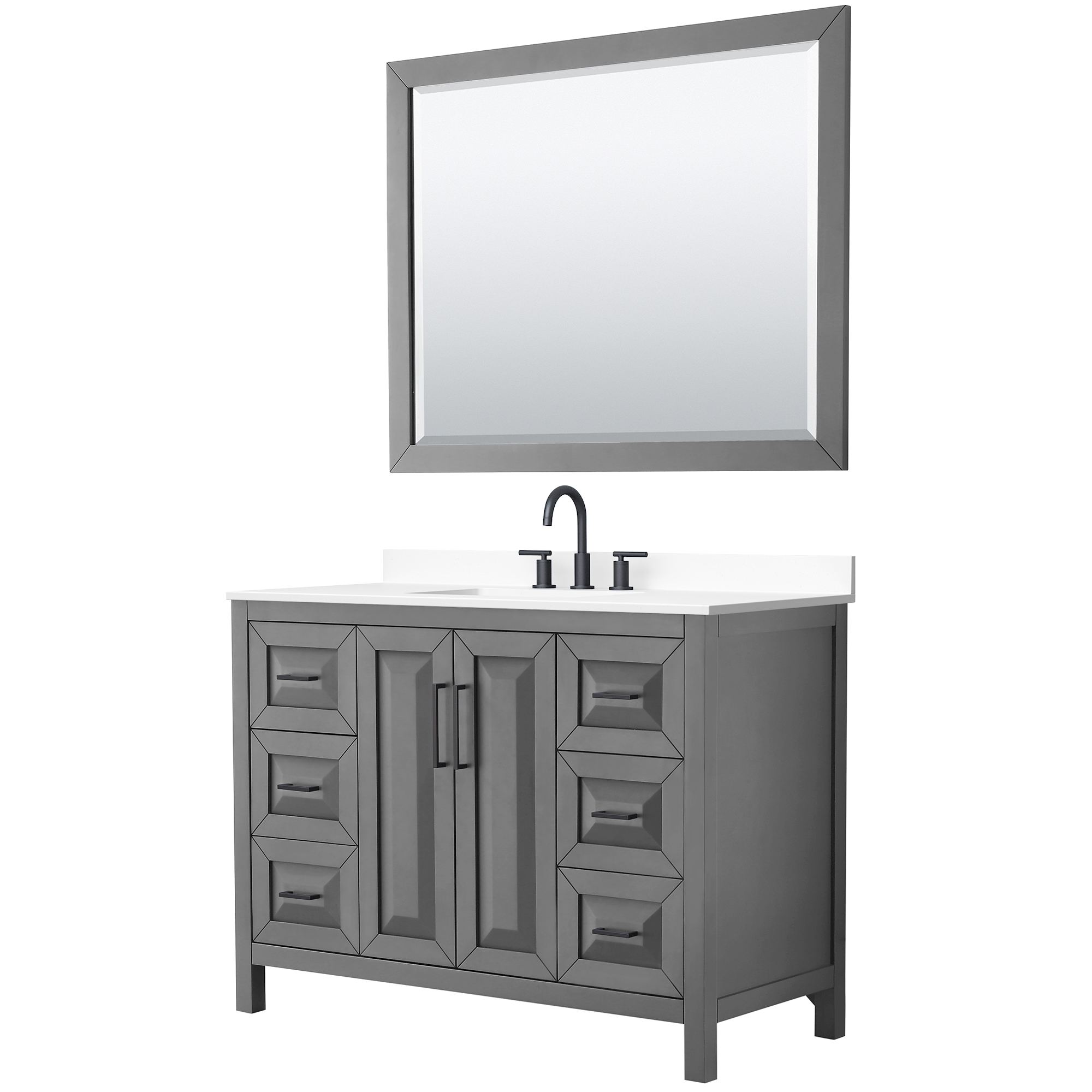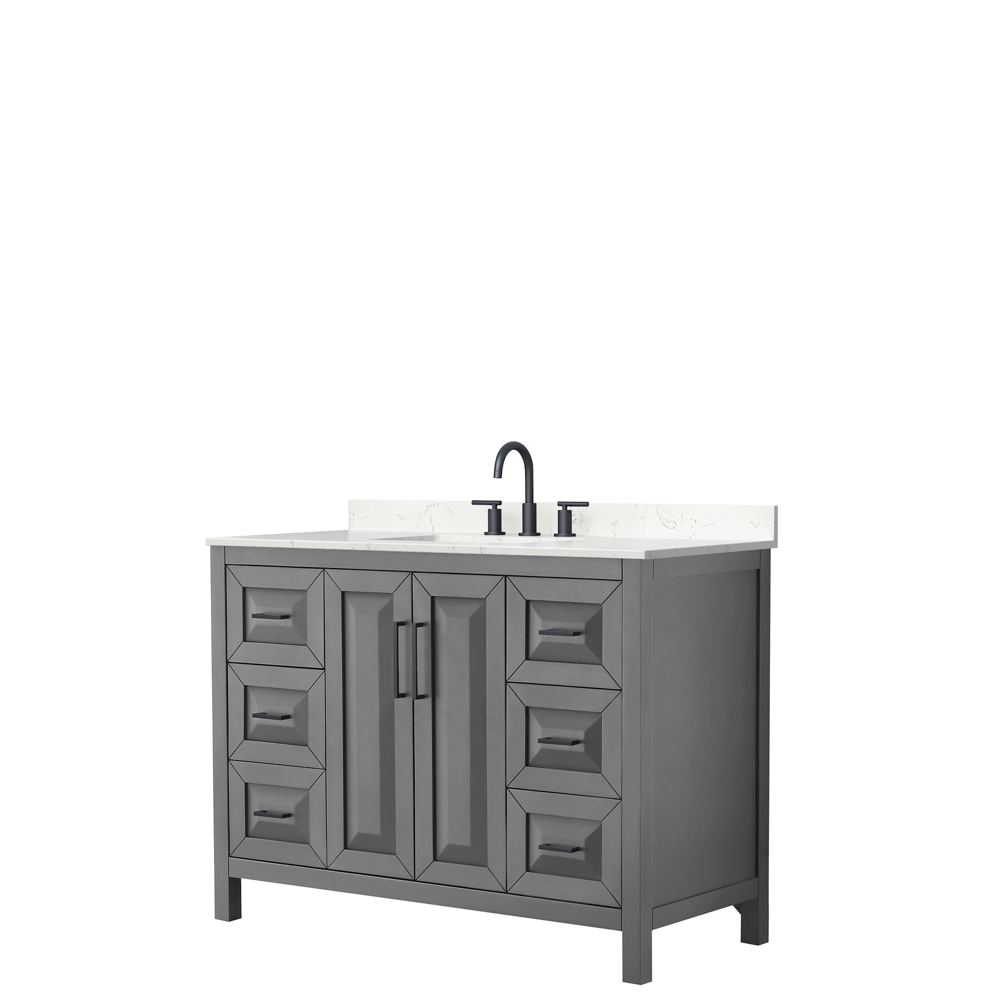 The beautiful Daria collection vanities stand out in any bathroom with strong, clean lines, raised panels and elegant counters with square sinks. There's plenty of cabinet space, the fully extending drawers are dovetail construction, and matte black or polished chrome finish detailing completes the look. Daria vanities deftly combine the function of today with a nod to the elegance of the past. It's the new modern - classic styling with a contemporary twist.