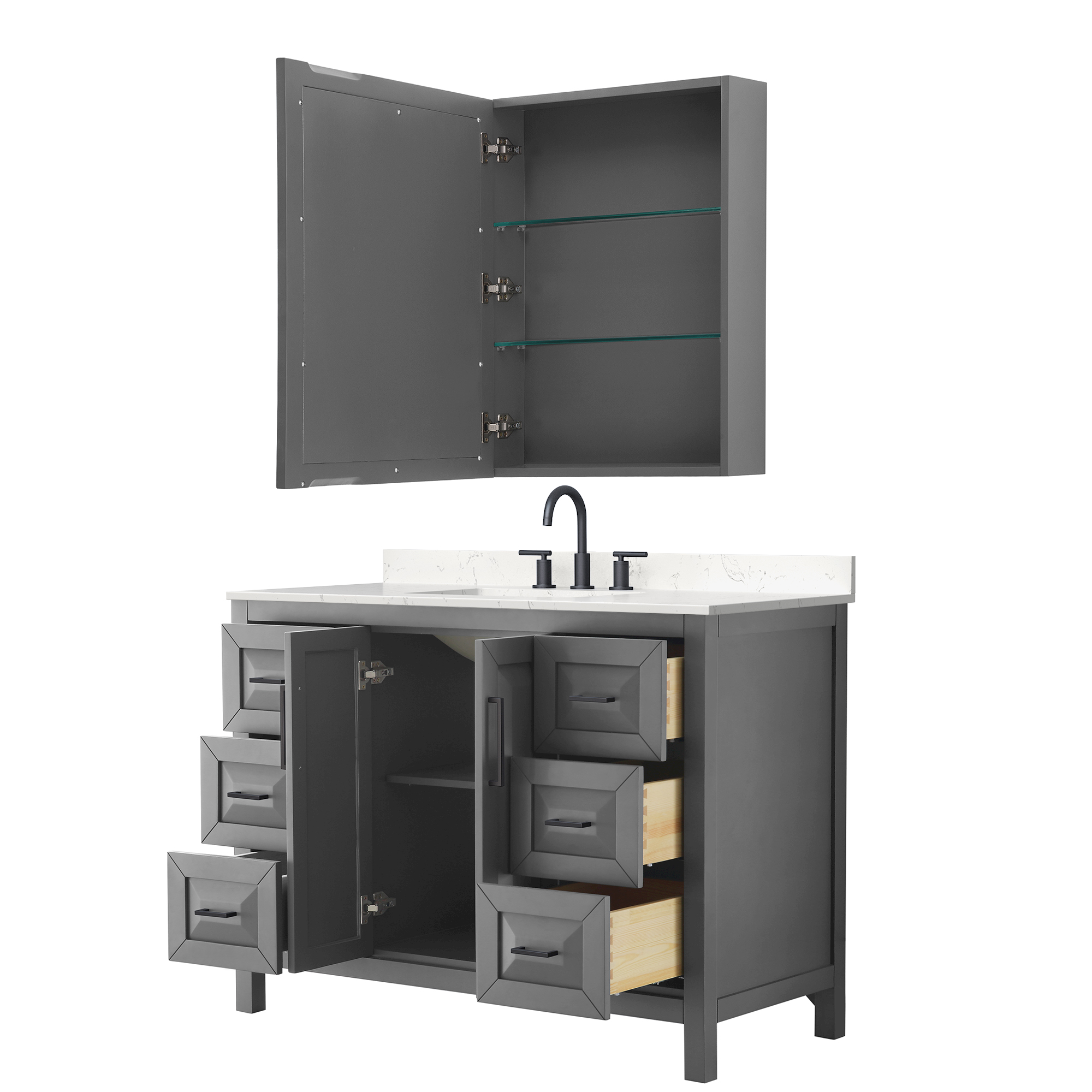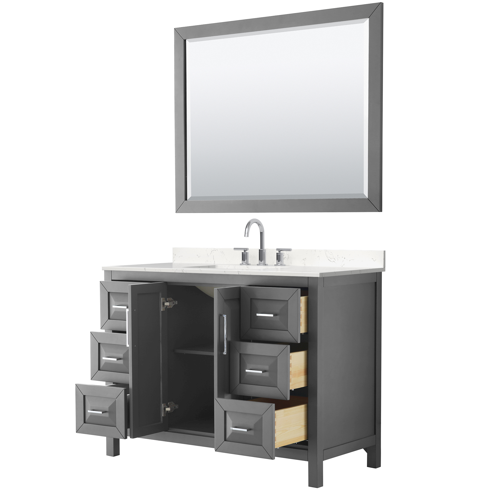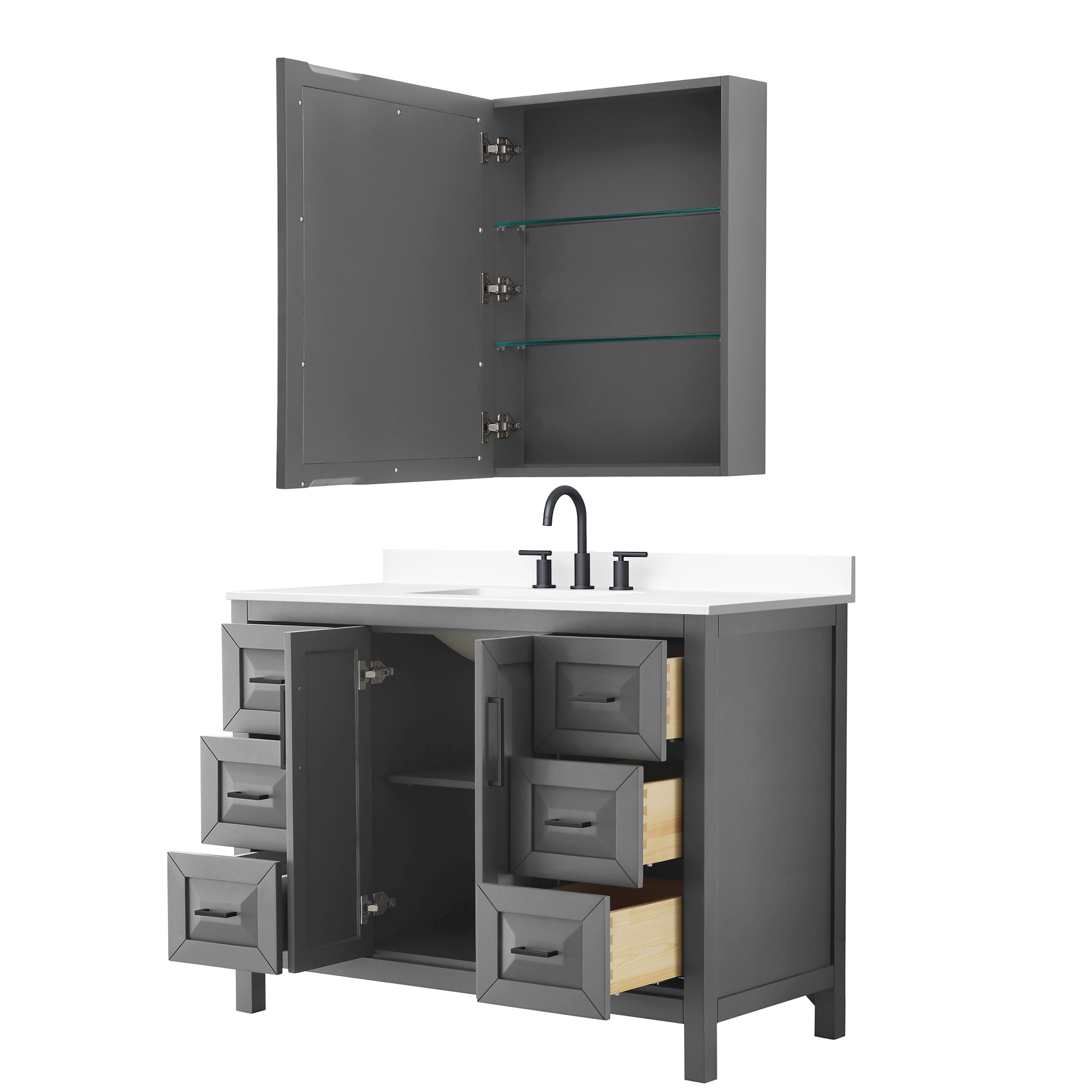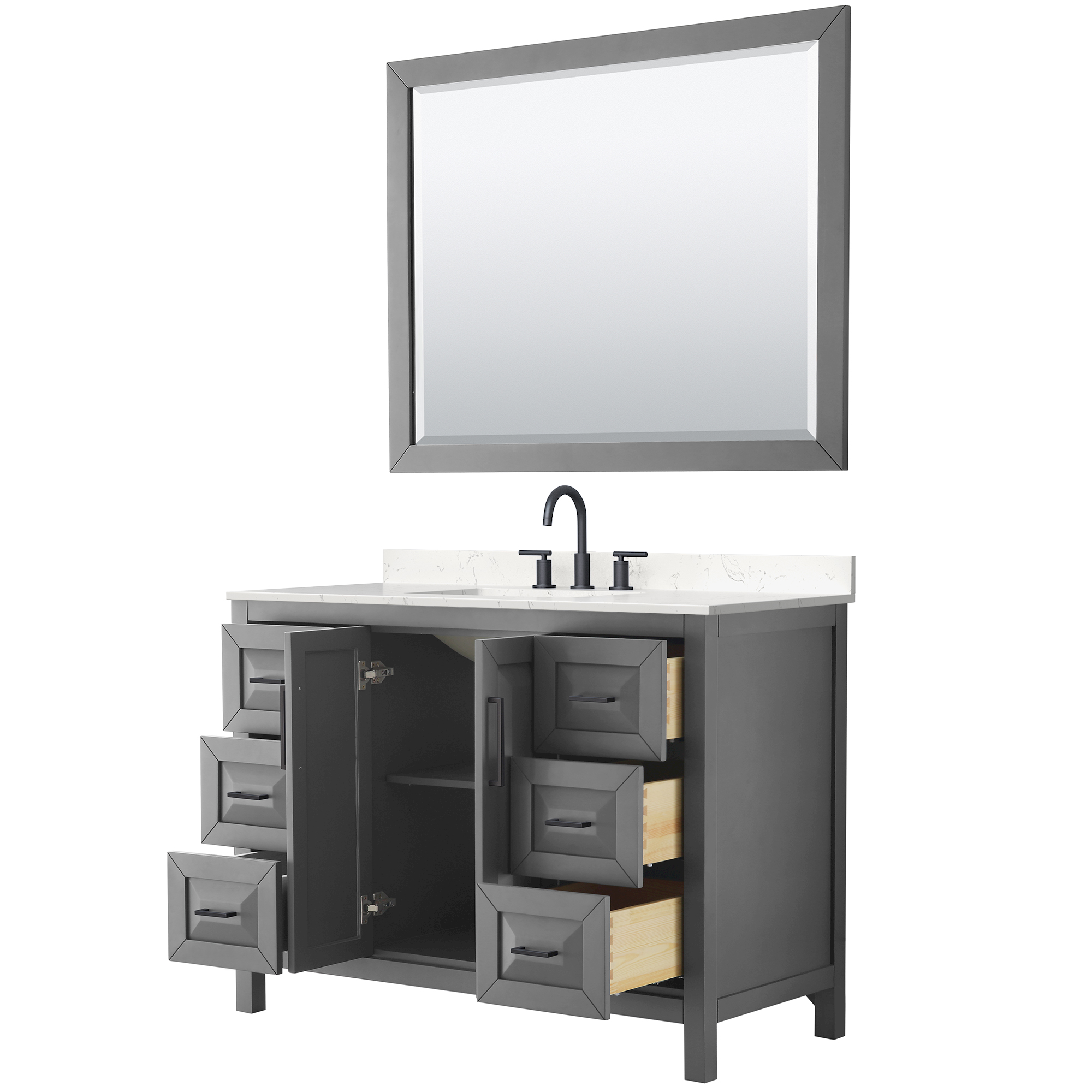 The beautiful Daria collection vanities stand out in any bathroom with strong, clean lines, raised panels and elegant counters with square sinks. There's plenty of cabinet space, the fully extending drawers are dovetail construction, and matte black or polished chrome finish detailing completes the look. Daria vanities deftly combine the function of today with a nod to the elegance of the past. It's the new modern - classic styling with a contemporary twist.