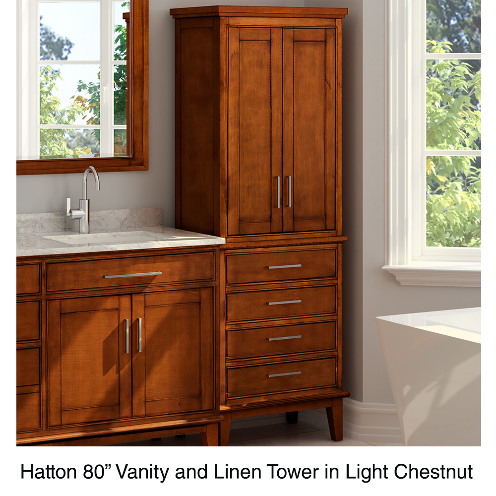 Bring a feeling of texture and depth to your bath with the gorgeous Hatton vanity series - hand finished in warm shades of Dark or Light Chestnut, with brushed chrome or optional antique bronze accents. A contemporary classic for the most discerning of customers.