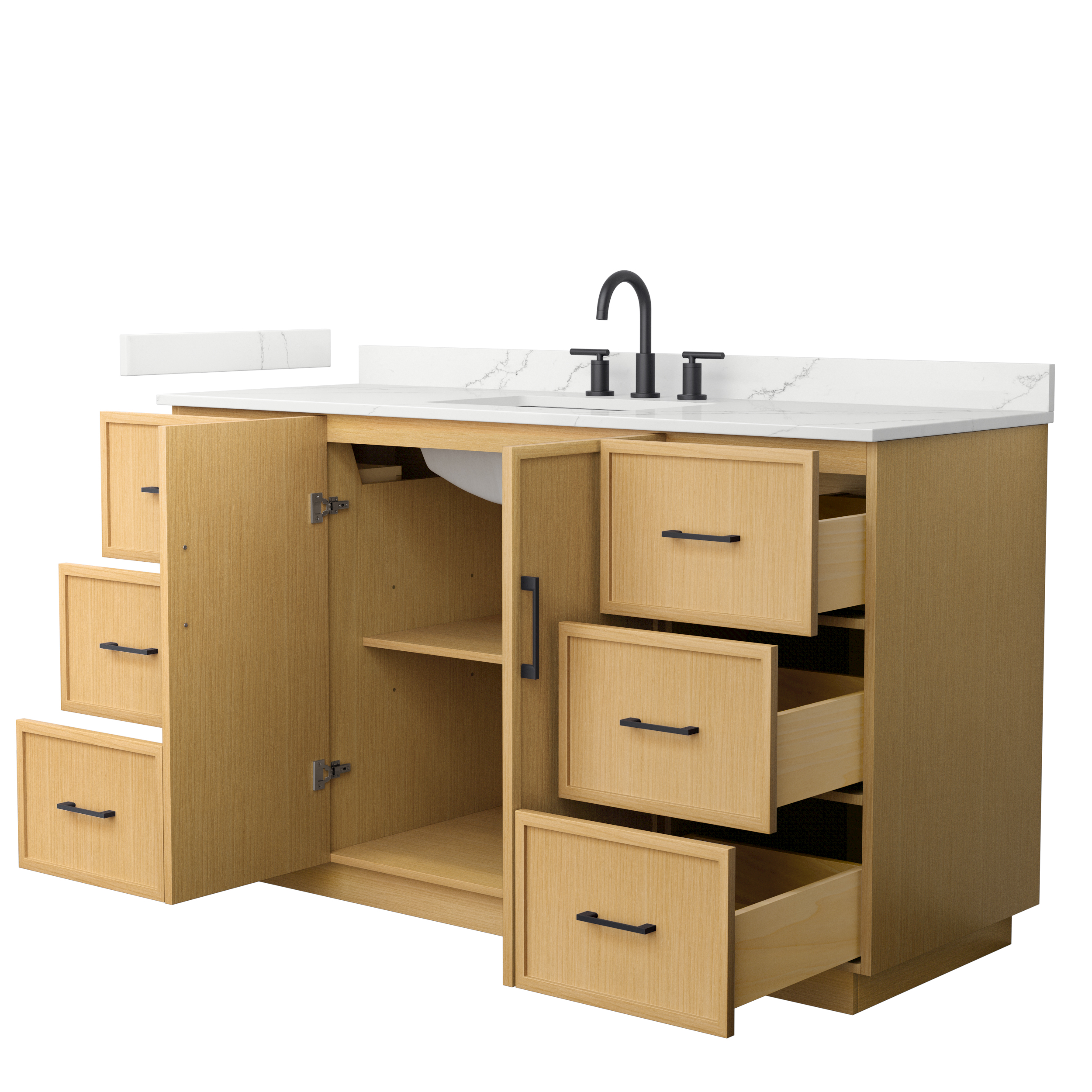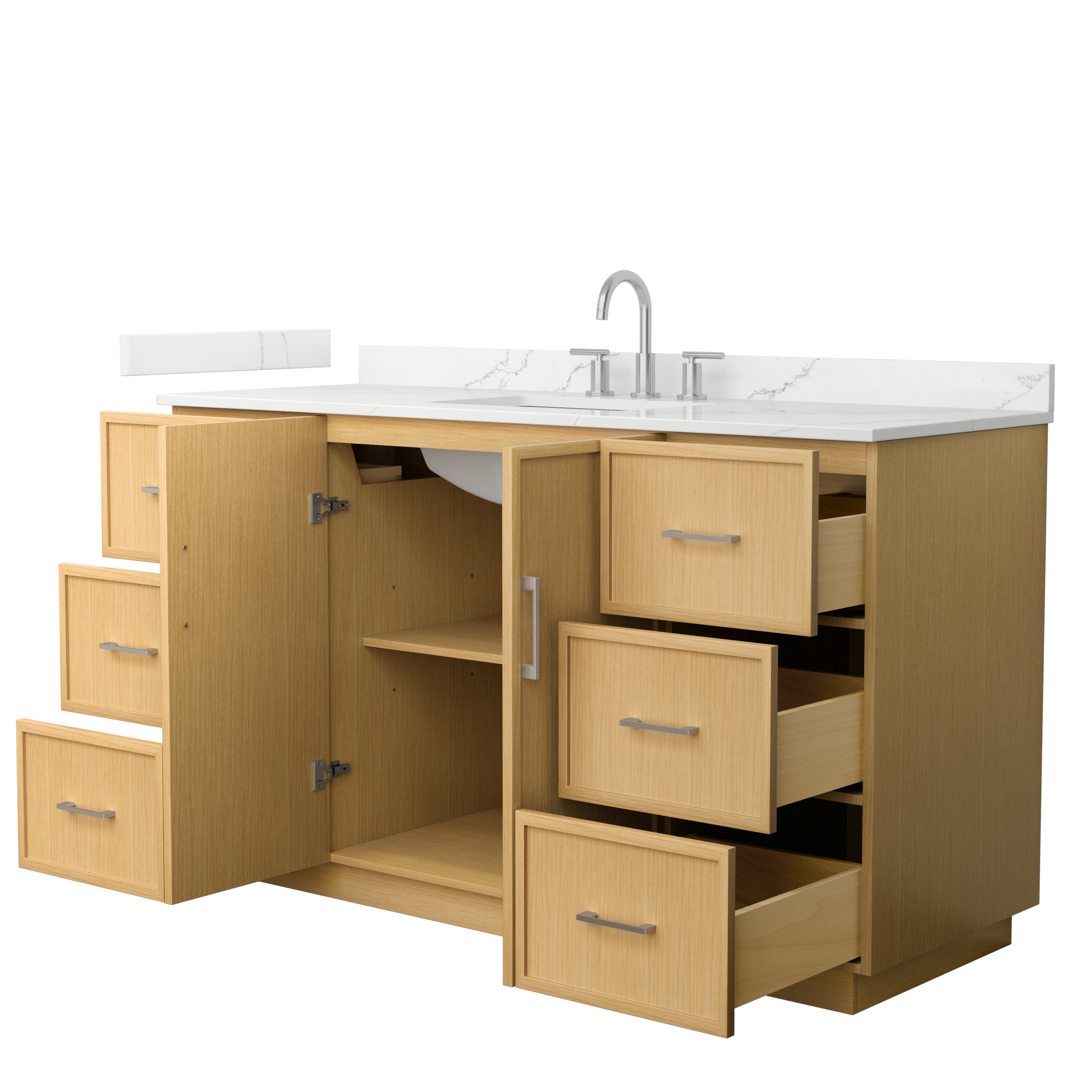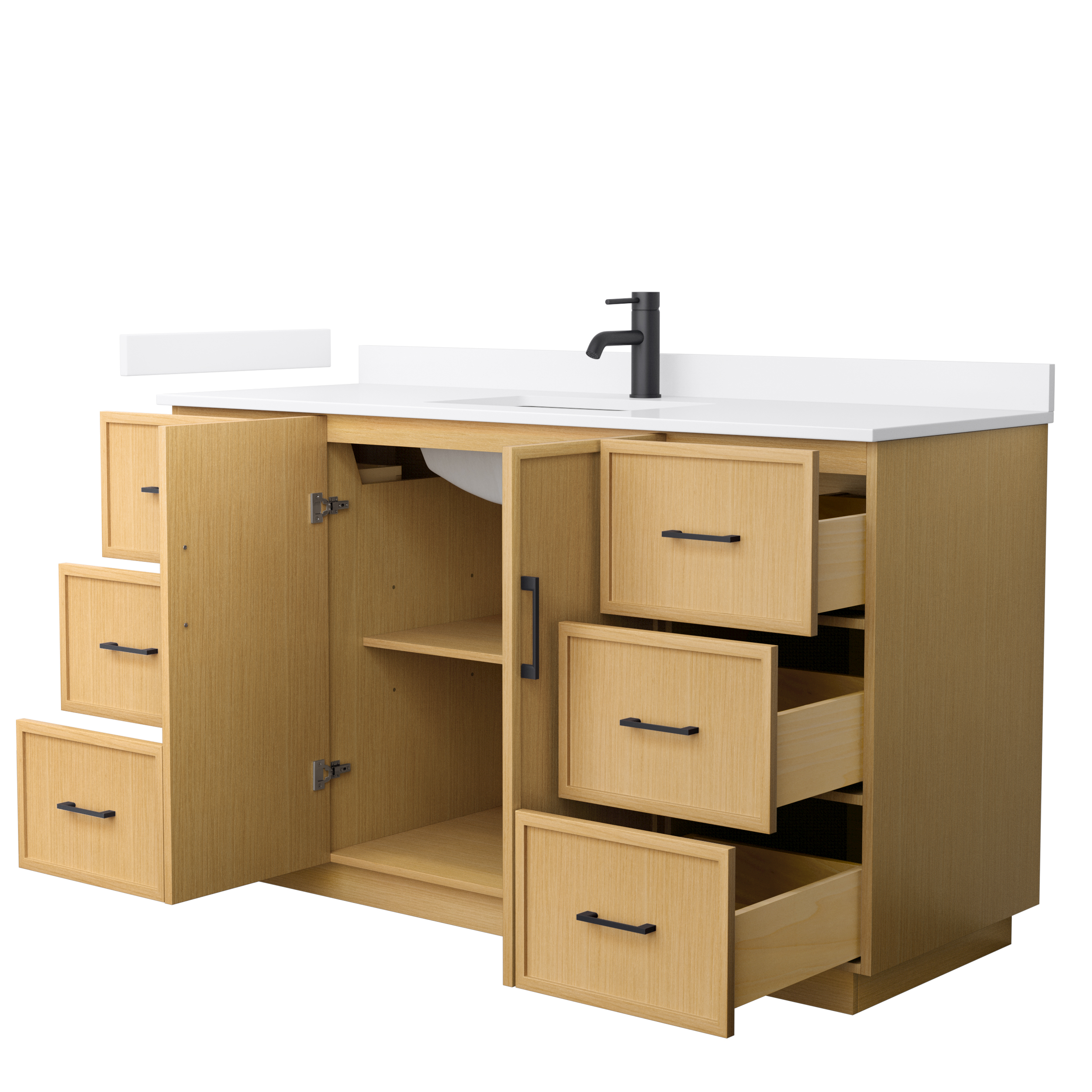 This transitional bathroom vanity exudes sleek sophistication with its clean lines and minimalist slim shaker design. The Elan vanity is crafted from high-quality materials like solid wood and plywood, with counters in multiple material options. Quartz and cultured stone counters include a back-and side-splash. Finished painted or in rift-cut light oak veneer, it seamlessly combines beauty and real-life usefulness. Its integrated, soft-closing drawers (featuring 3D adjustable glides) and doors offer ample storage space for toiletries, towels, and other essentials, keeping the space clutter-free. The sleek, angular hardware contributes to the overall aesthetic, creating a stylish focal point in the bathroom. Elevate your bathroom haven without compromising form or function.