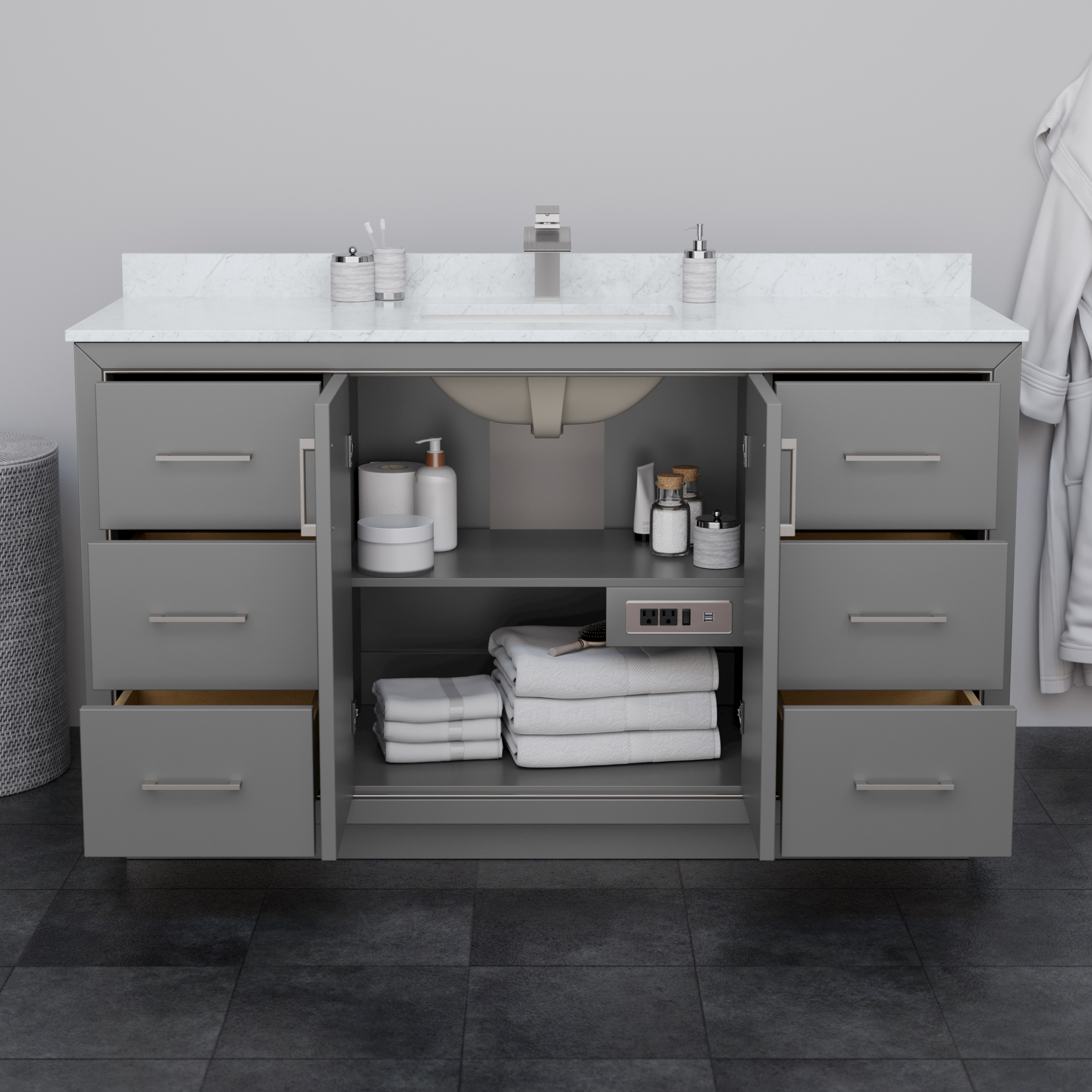 Ideal for the modern home, Icon vanities by Wyndham Collection are a cool, contemporary take on modern bathroom design, an exercise in elegance and style. Beautiful inset metal trim accents this stunning collection, which offers many choices and sizes of vanity and trim color to suit your taste. Interior details feature a power outlet with USB ports, adjustable shelves, and a cutout back for easy access to plumbing and electrical. Icon collection is available in multiple sizes and will work with a wide variety of different styles and decors.