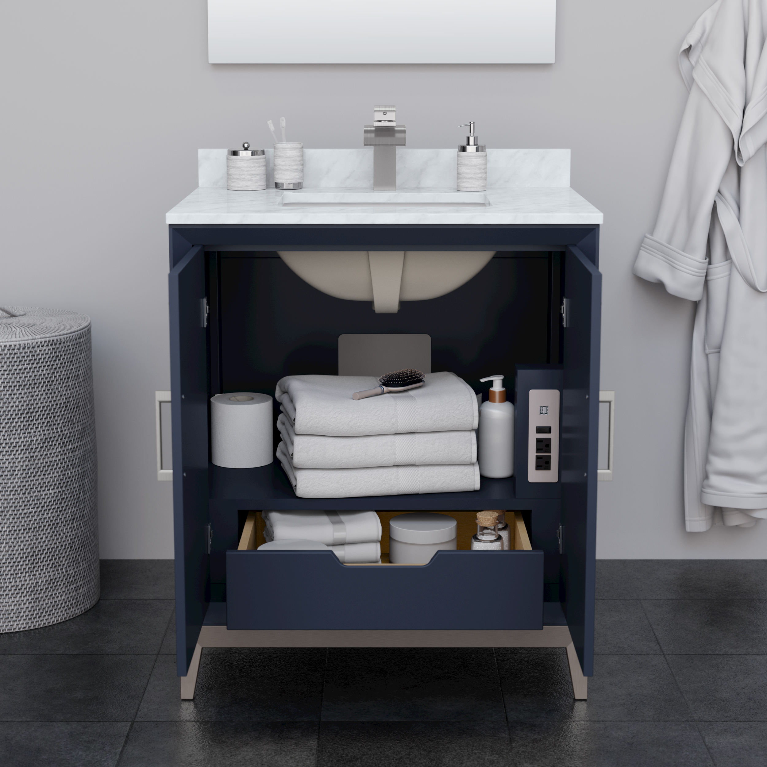 Classic luxurious elegance with clean and contemporary styling are the hallmarks of the beautiful Marlena vanity collection, perfect for most home decors. Offered in a range of sizes, cabinet colors and metal trim colors, you're sure to find the perfect fit. There's plenty of storage space, soft-close doors and drawers, internal drawers and the convenience of a 110v outlet and USB charger just inside the door. Offered with available Quartz, Carrara Marble, or Cultured Stone counters.