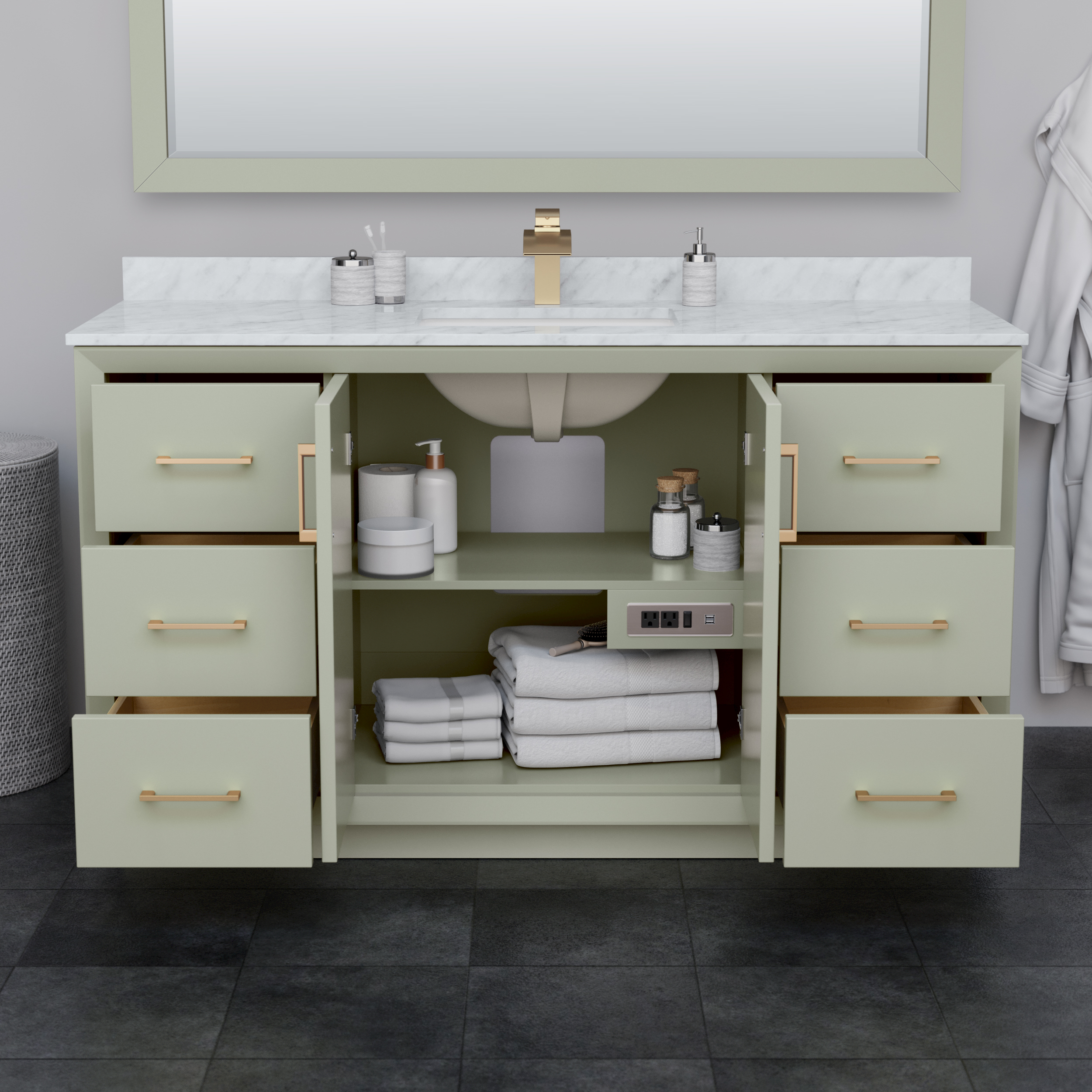 Perfect for a modern update, the Strada bathroom vanity features clean and understated contemporary lines that highlight the elegance and simplicity of this transitional vanity by Wyndham Collection. It comes well equipped with soft-close doors and drawers, ample storage space, 110V power and USB outlets, adjustable shelves, and a cutout back for easy access to plumbing and electrical.