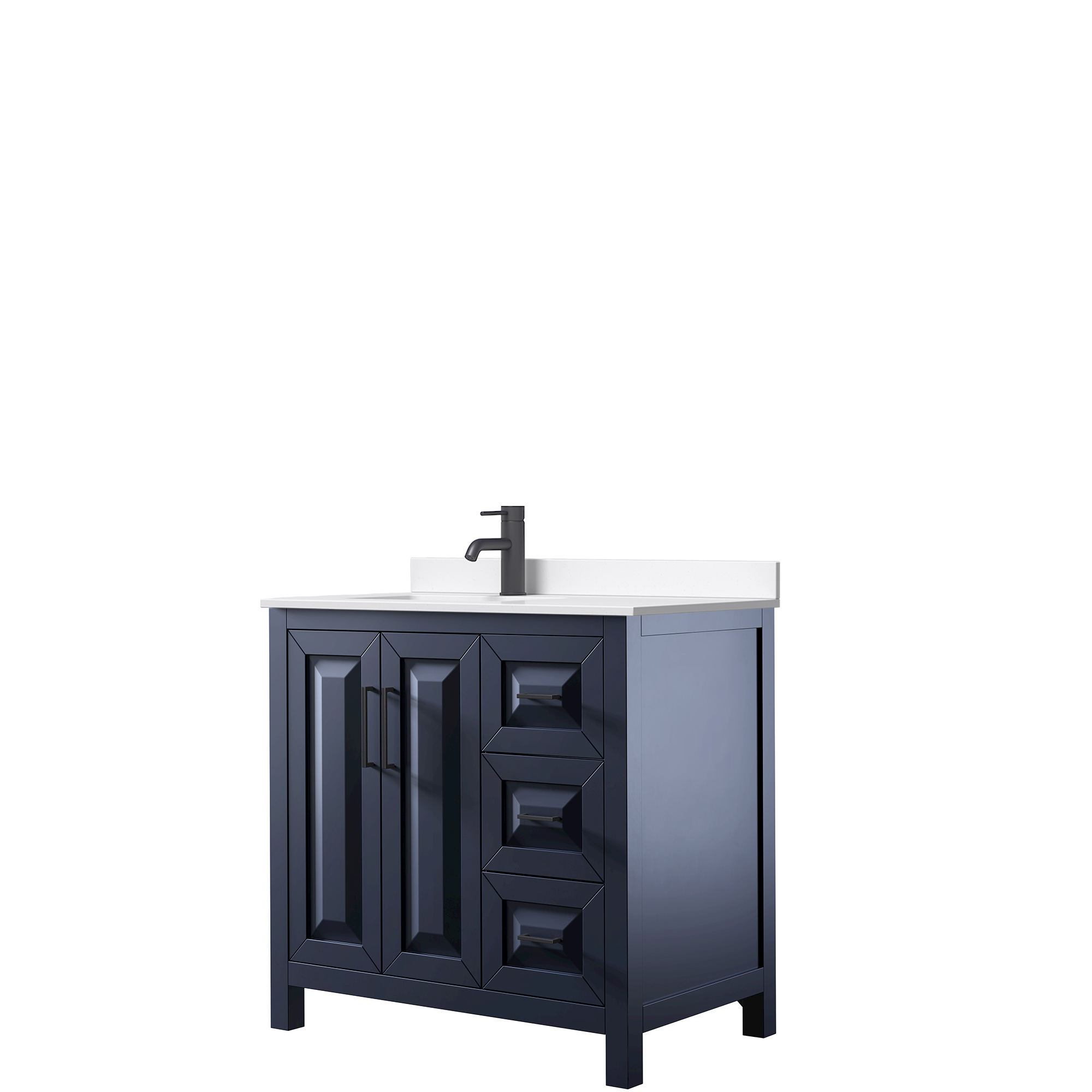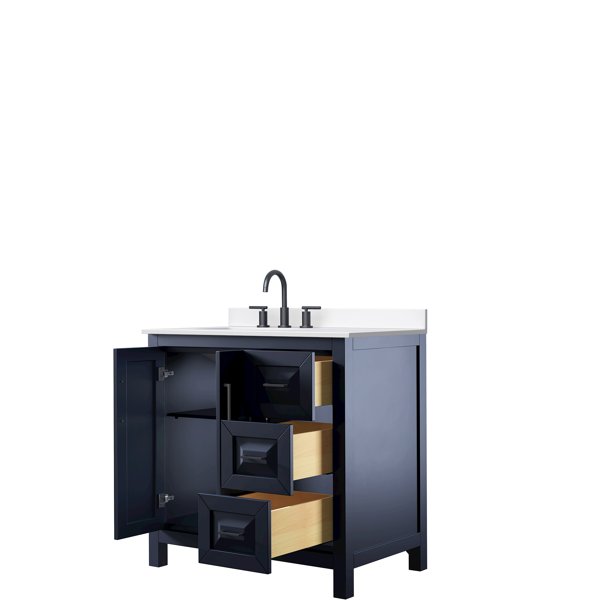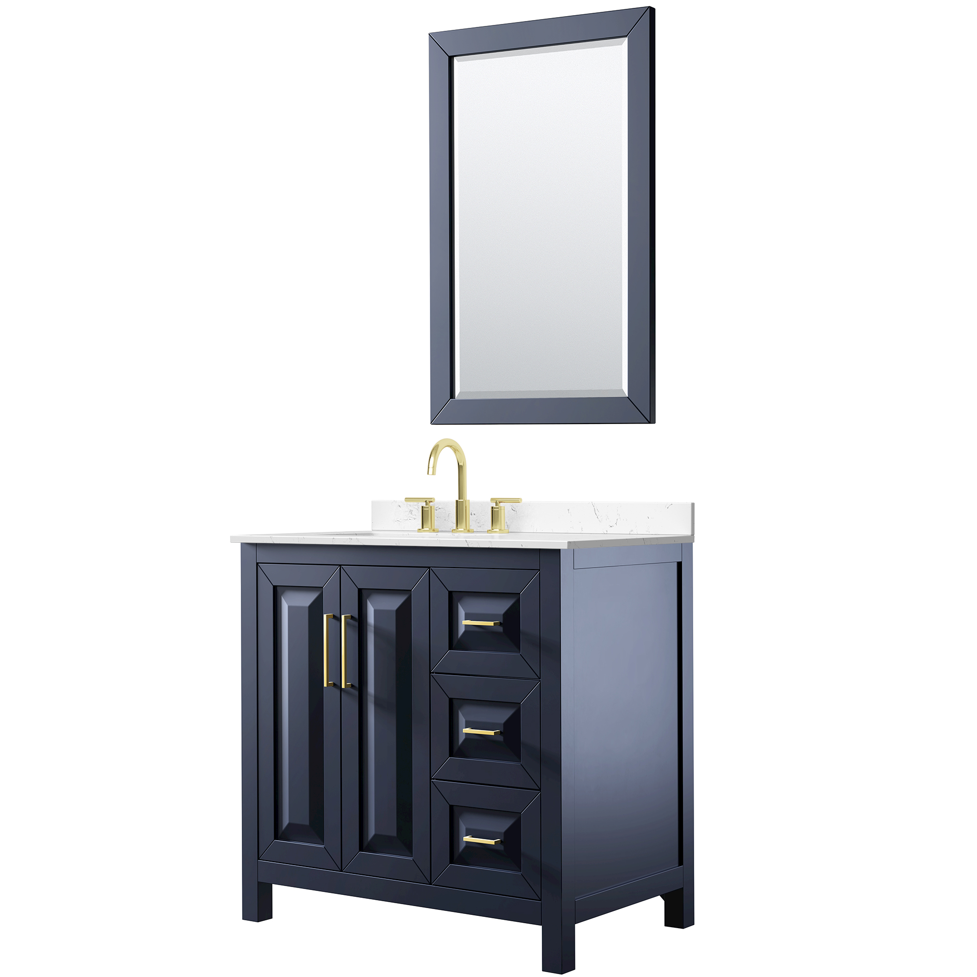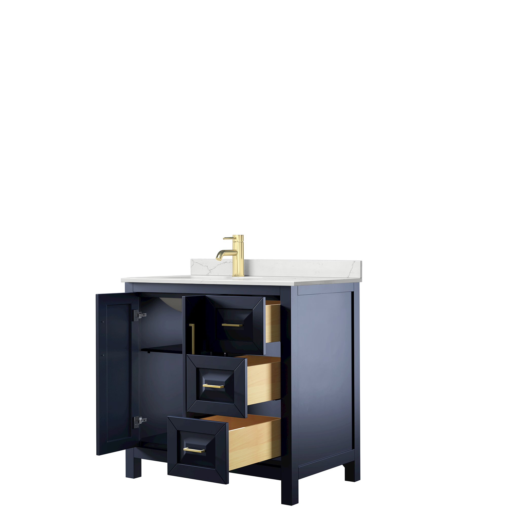 The beautiful Daria collection vanities stand out in any bathroom with strong, clean lines, raised panels and elegant counters with square sinks. There's plenty of cabinet space, the fully extending drawers are dovetail construction, and matte black or brushed gold finish detailing completes the look. Daria vanities deftly combine the function of today with a nod to the elegance of the past. It's the new modern - classic styling with a contemporary twist.