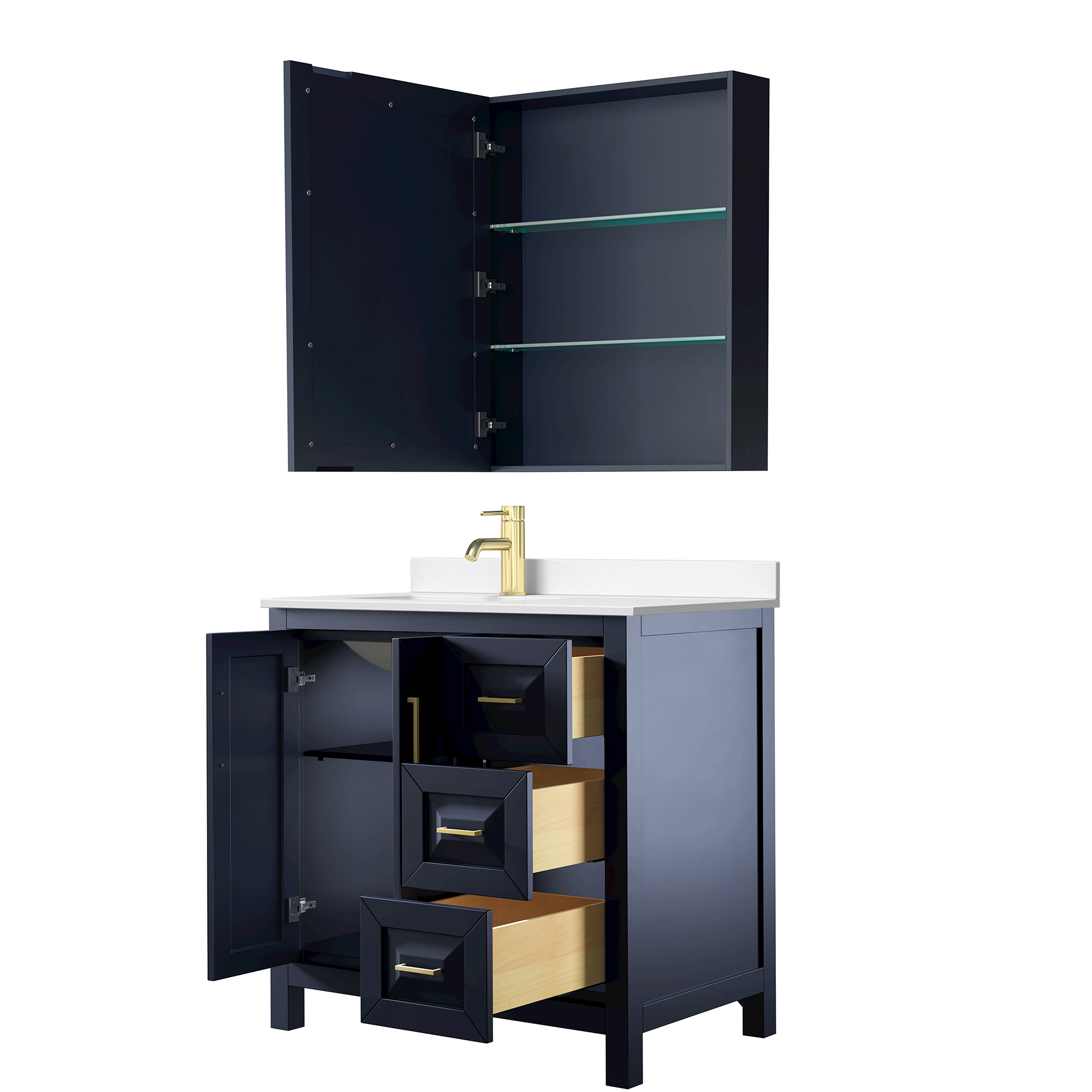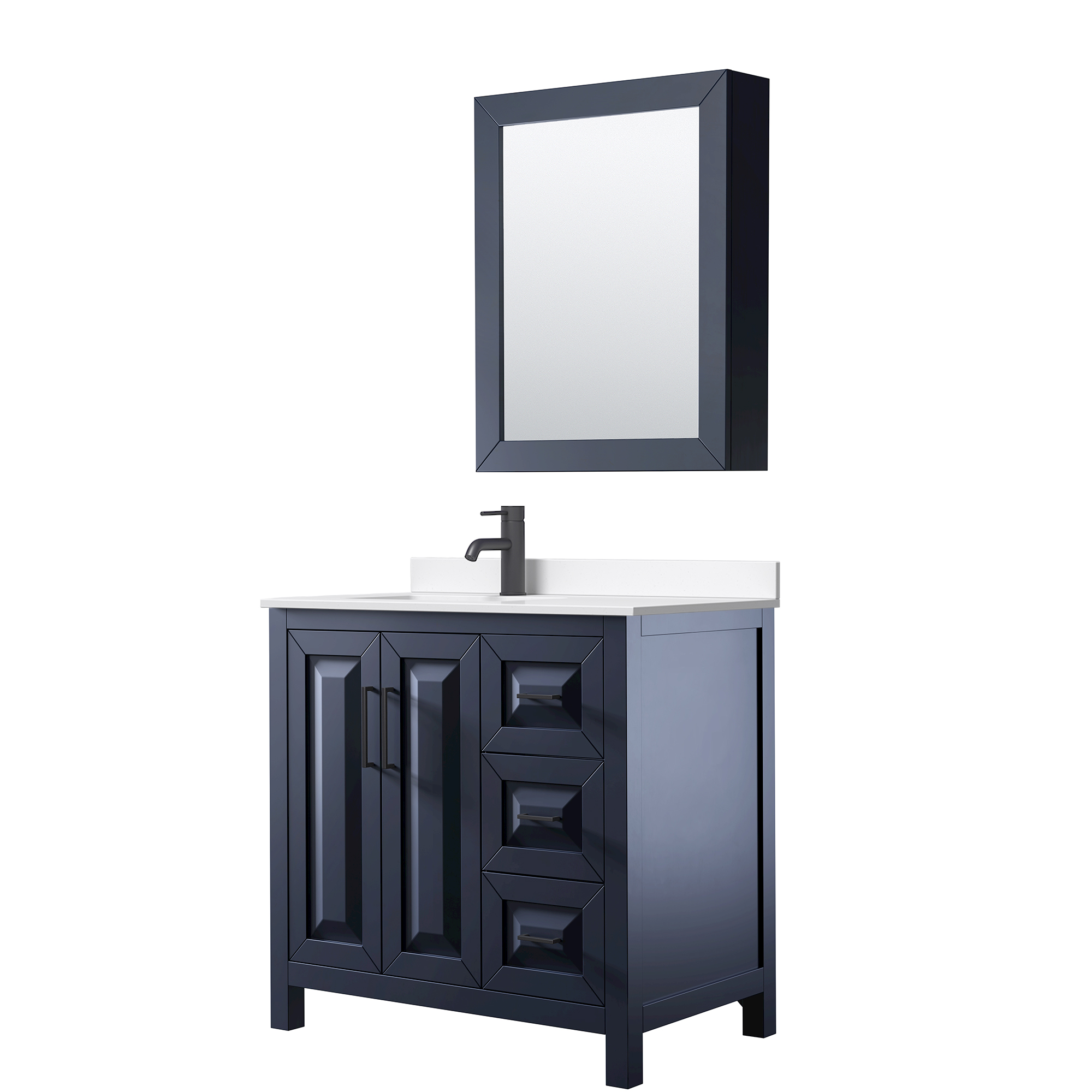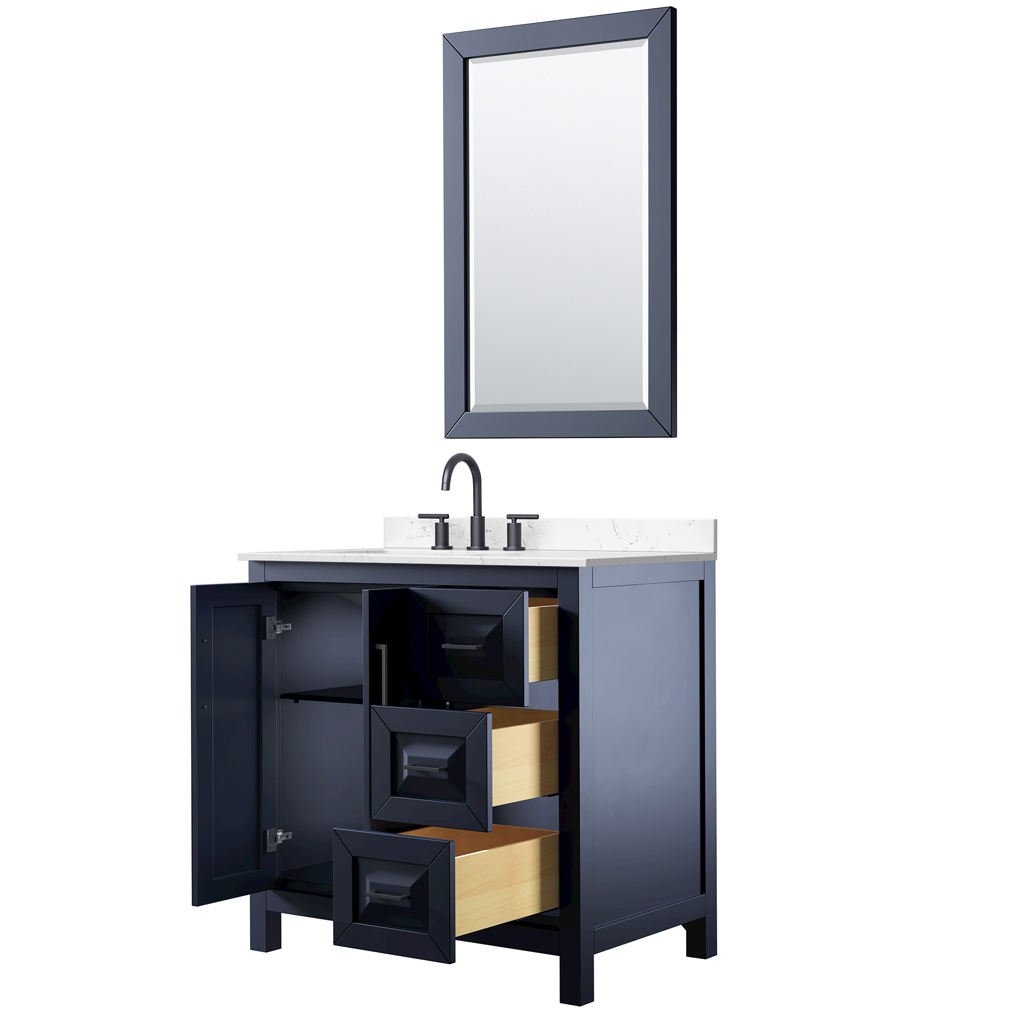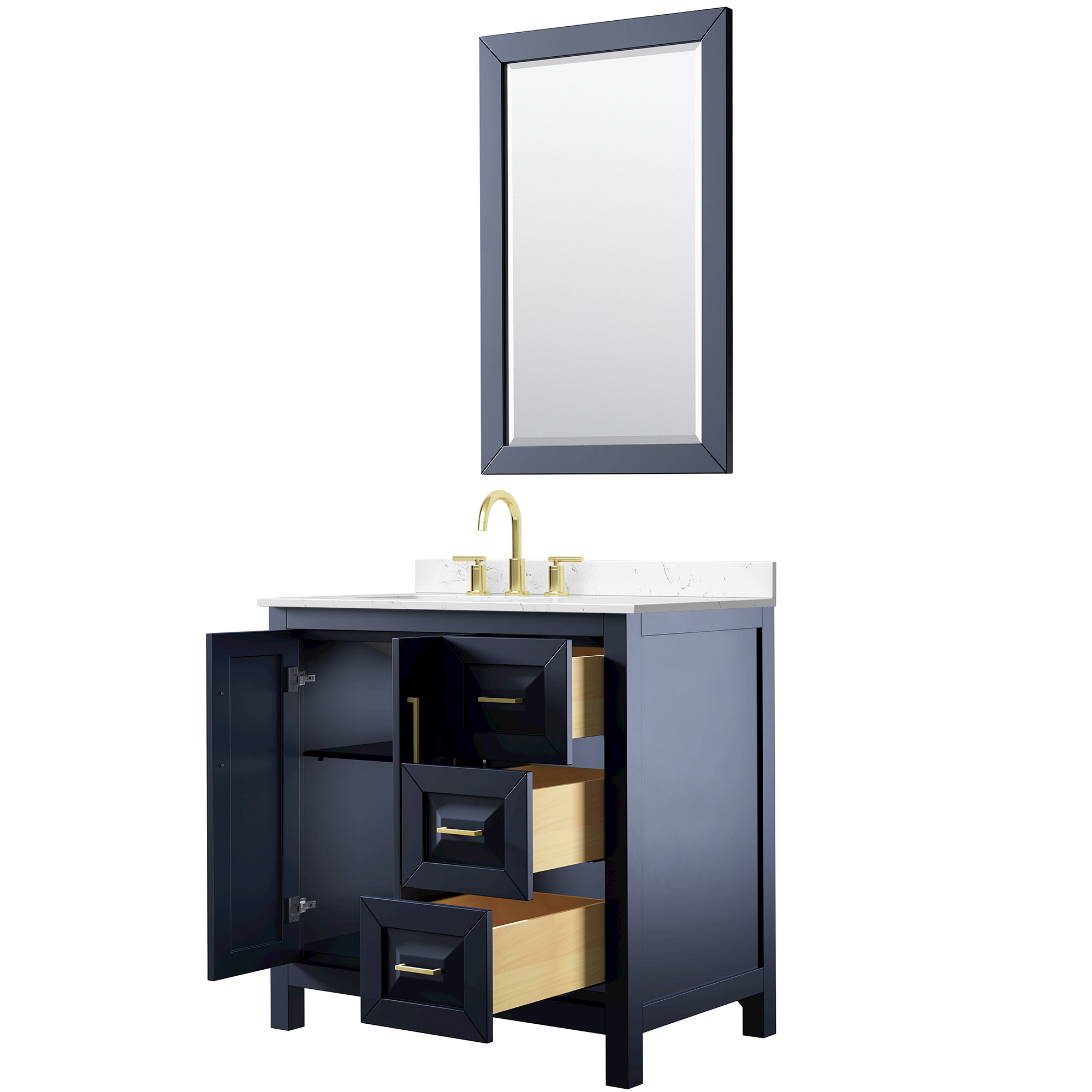 The beautiful Daria collection vanities stand out in any bathroom with strong, clean lines, raised panels and elegant counters with square sinks. There's plenty of cabinet space, the fully extending drawers are dovetail construction, and matte black or brushed gold finish detailing completes the look. Daria vanities deftly combine the function of today with a nod to the elegance of the past. It's the new modern - classic styling with a contemporary twist.
