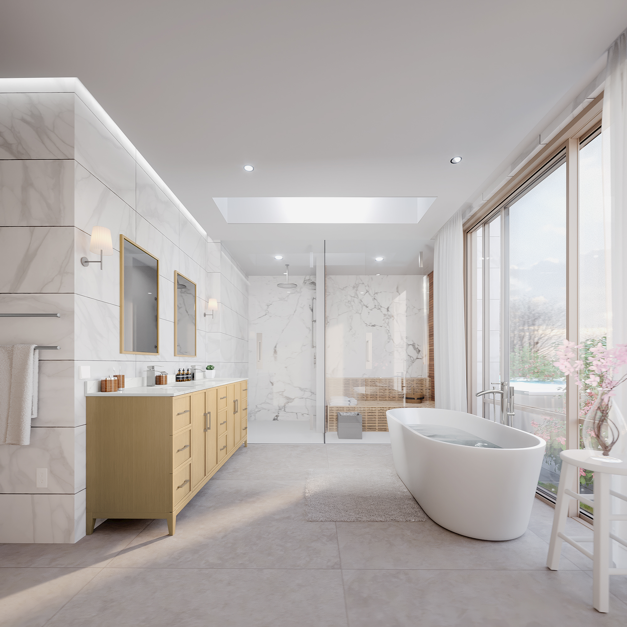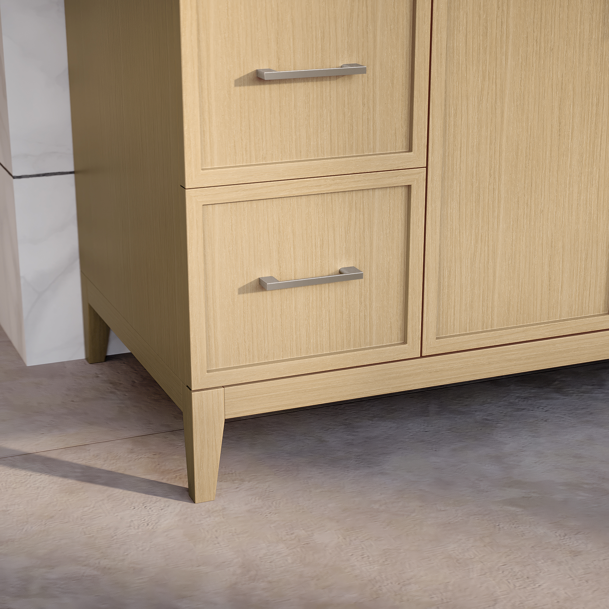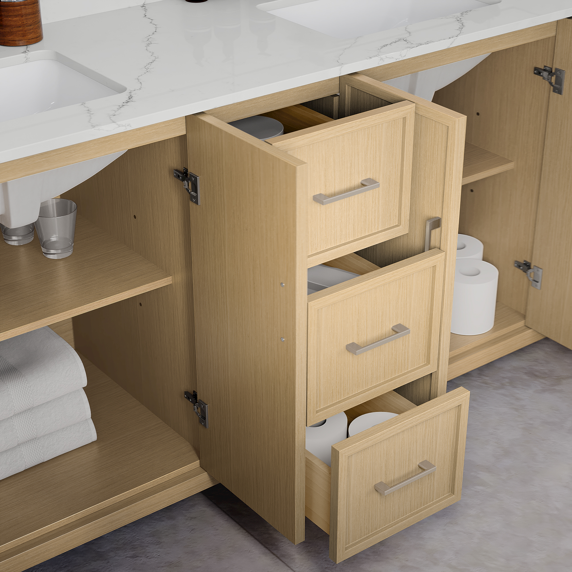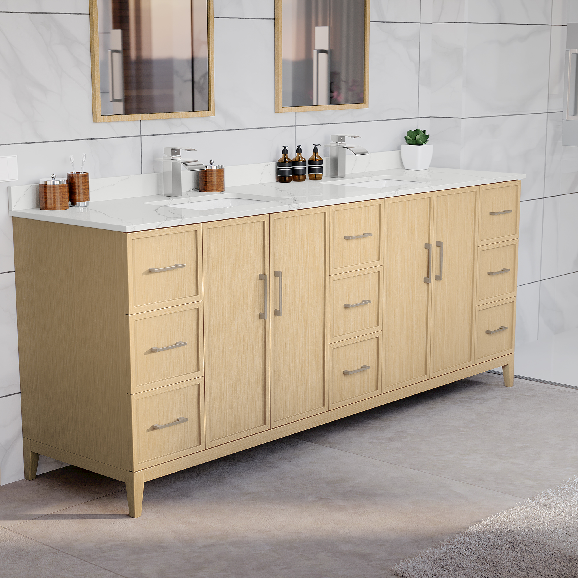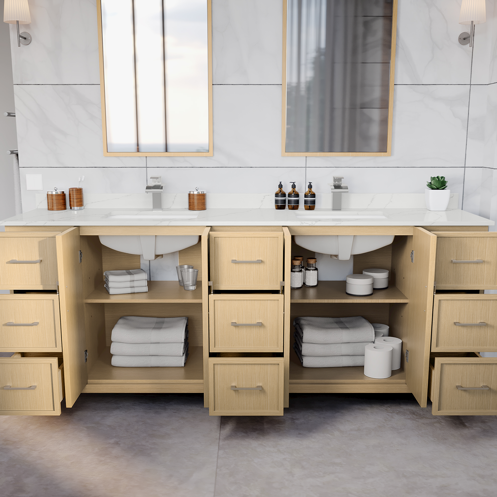 This transitional bathroom vanity exudes sleek sophistication with its clean lines and minimalist slim shaker design. The Elan vanity is crafted from high-quality materials like solid wood and plywood, with counters in multiple material options. Quartz and cultured stone counters include a back-and side-splash. Finished painted or in rift-cut white oak veneer, it seamlessly combines beauty and real-life usefulness. Its integrated, soft-closing drawers (featuring 3D adjustable glides) and doors offer ample storage space for toiletries, towels, and other essentials, keeping the space clutter-free. The sleek, angular hardware contributes to the overall aesthetic, creating a stylish focal point in the bathroom. Elevate your bathroom haven without compromising form or function.