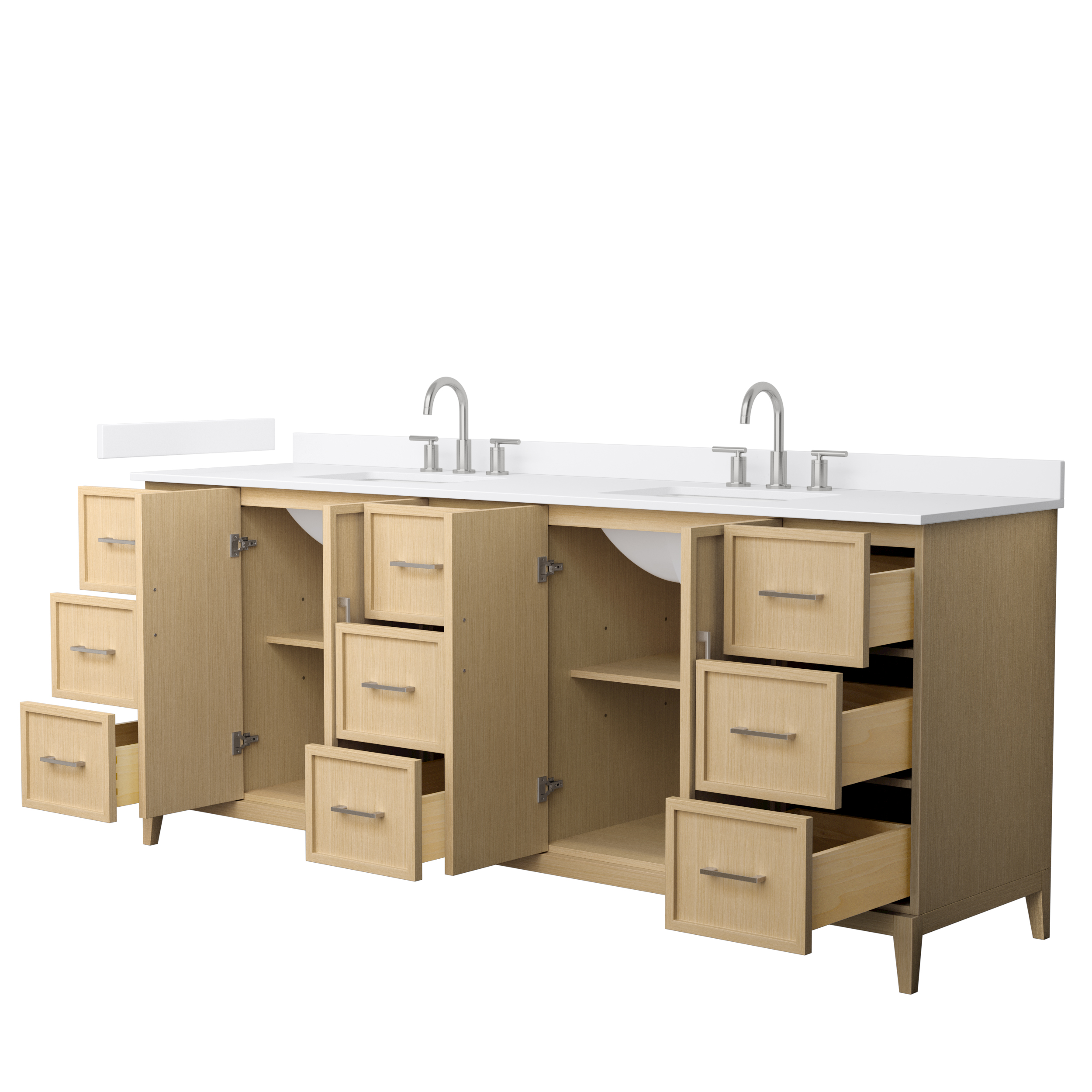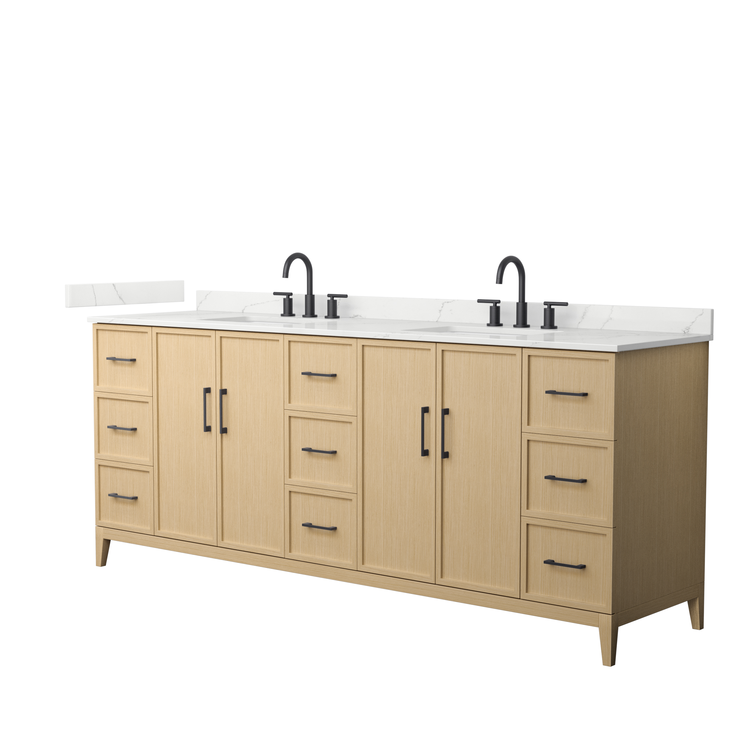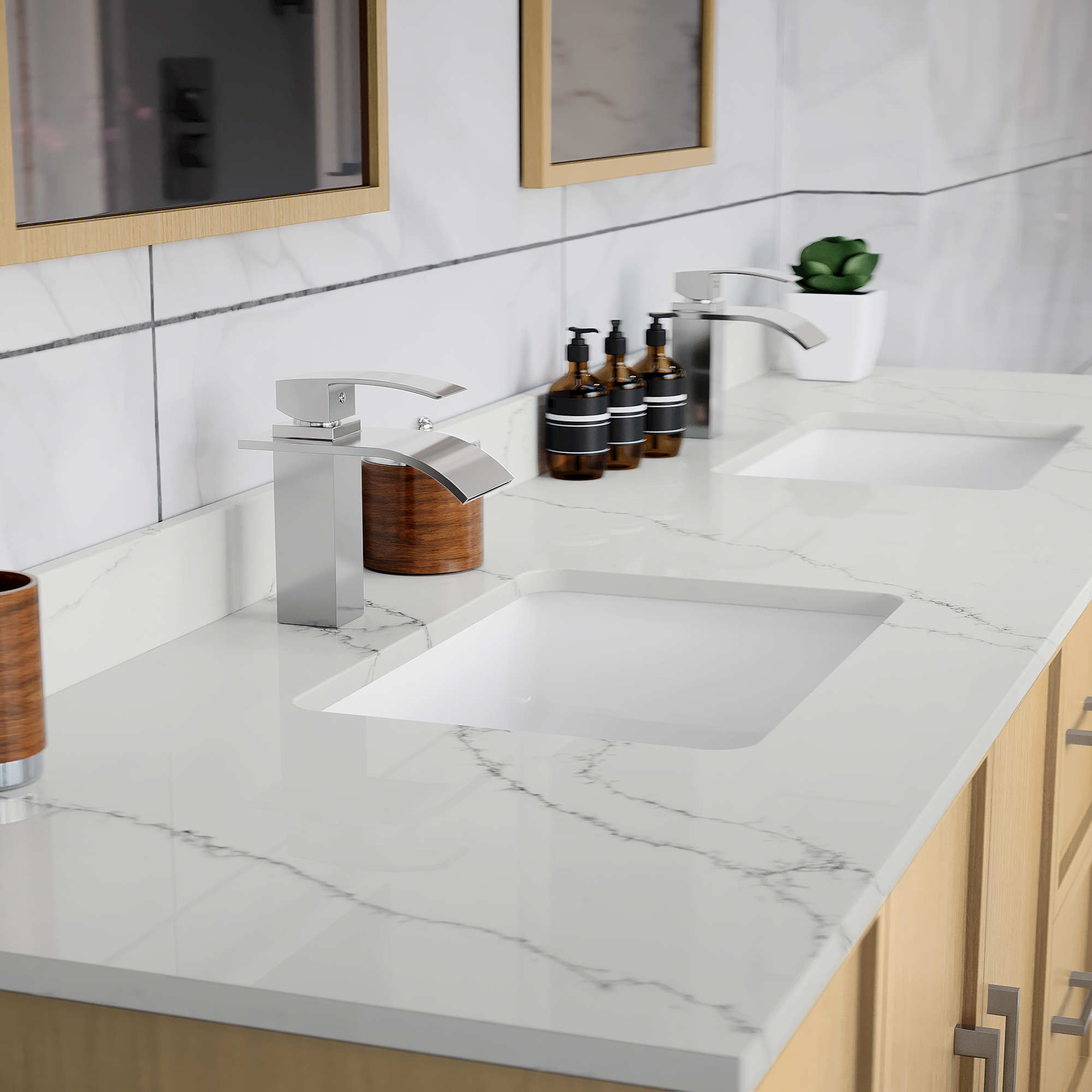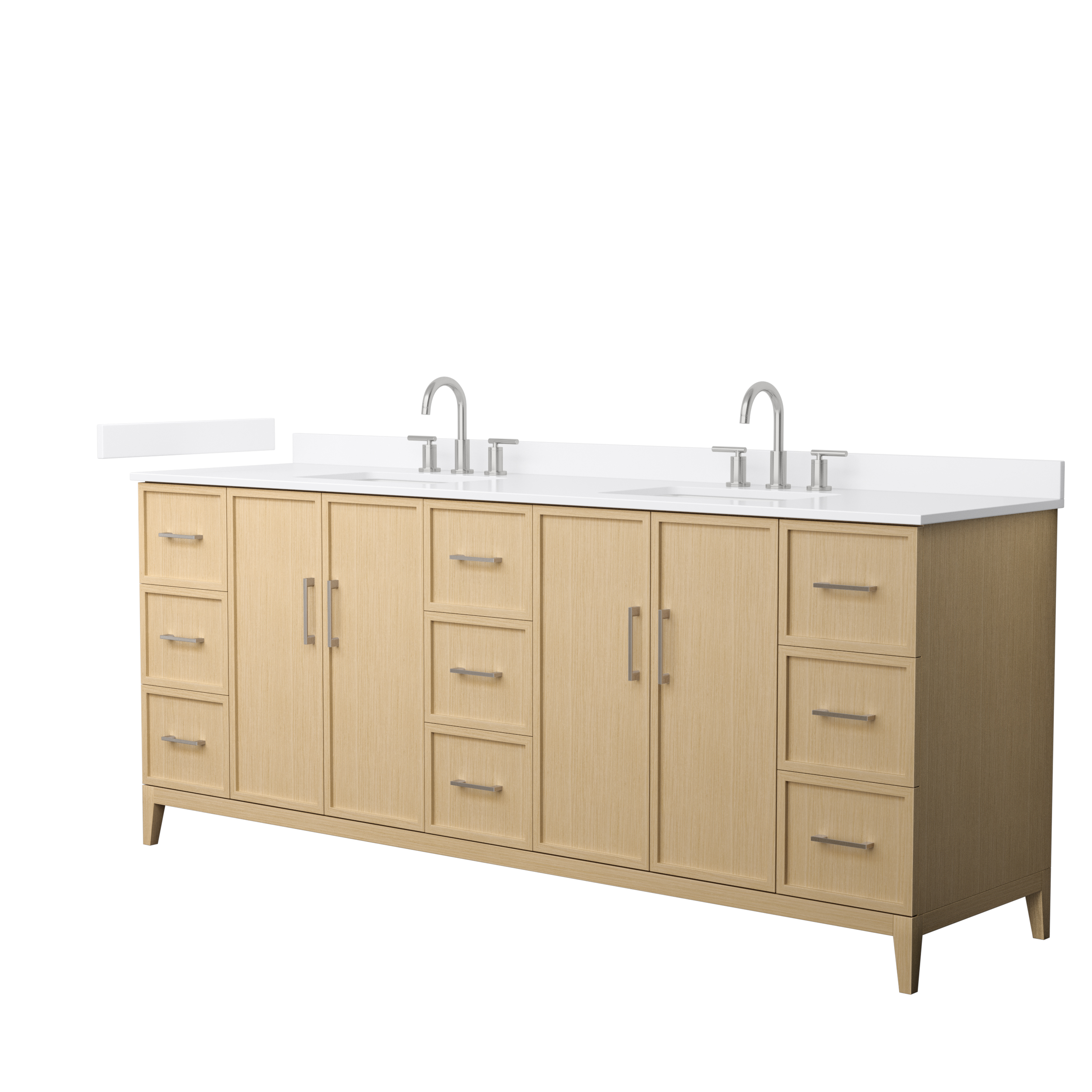 This transitional bathroom vanity exudes sleek sophistication with its clean lines and minimalist slim shaker design. The Elan vanity is crafted from high-quality materials like solid wood and plywood, with counters in multiple material options. Quartz and cultured stone counters include a back-and side-splash. Finished painted or in rift-cut white oak veneer, it seamlessly combines beauty and real-life usefulness. Its integrated, soft-closing drawers (featuring 3D adjustable glides) and doors offer ample storage space for toiletries, towels, and other essentials, keeping the space clutter-free. The sleek, angular hardware contributes to the overall aesthetic, creating a stylish focal point in the bathroom. Elevate your bathroom haven without compromising form or function.