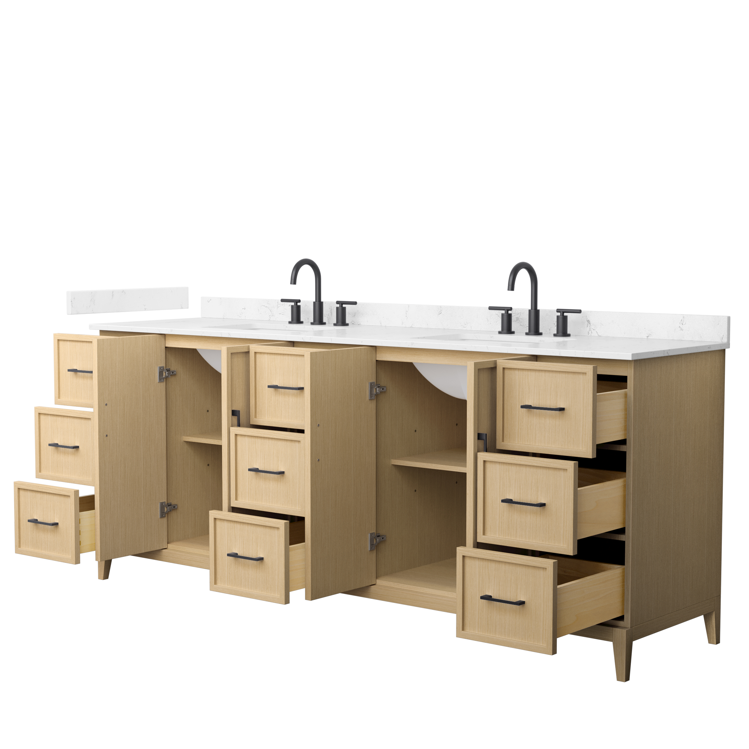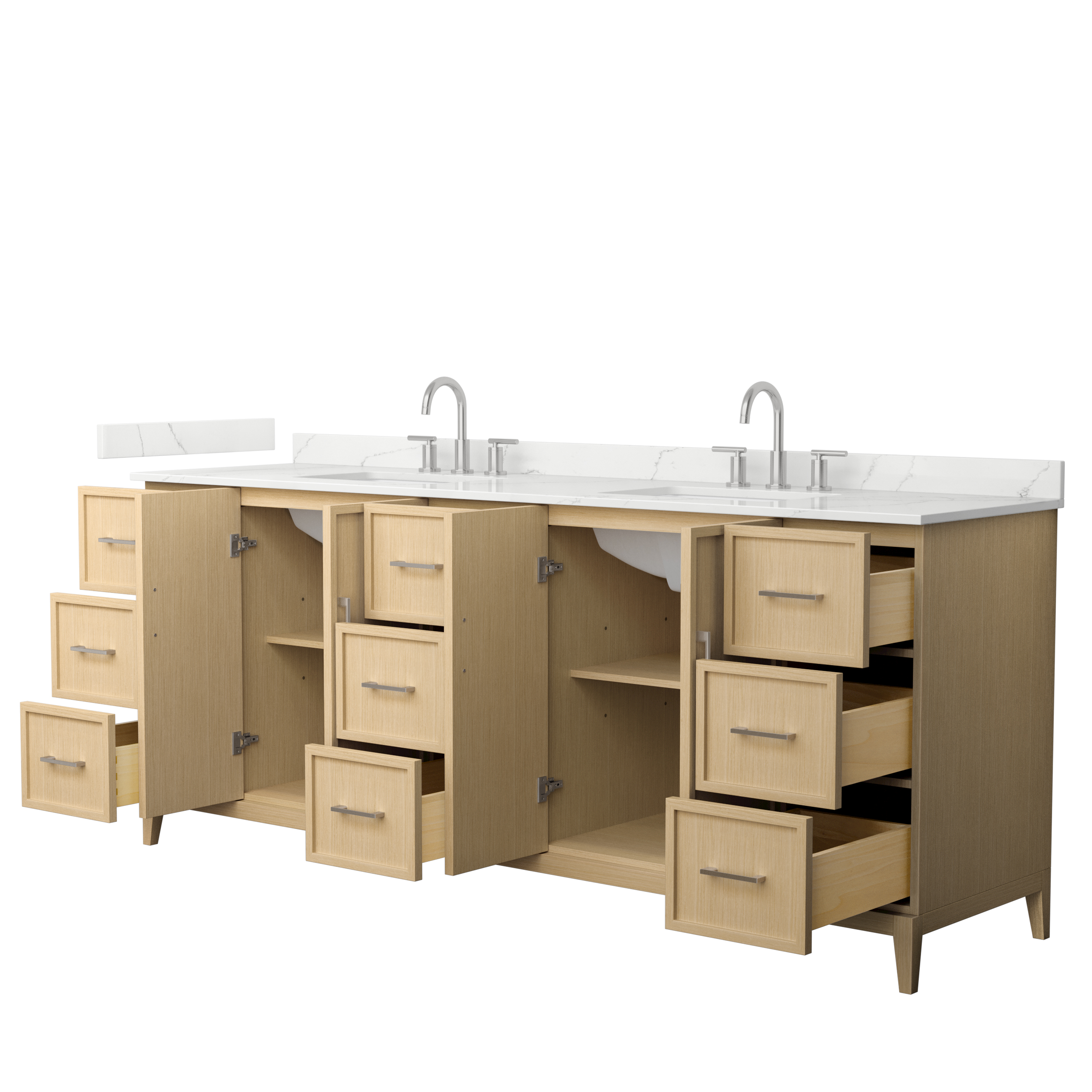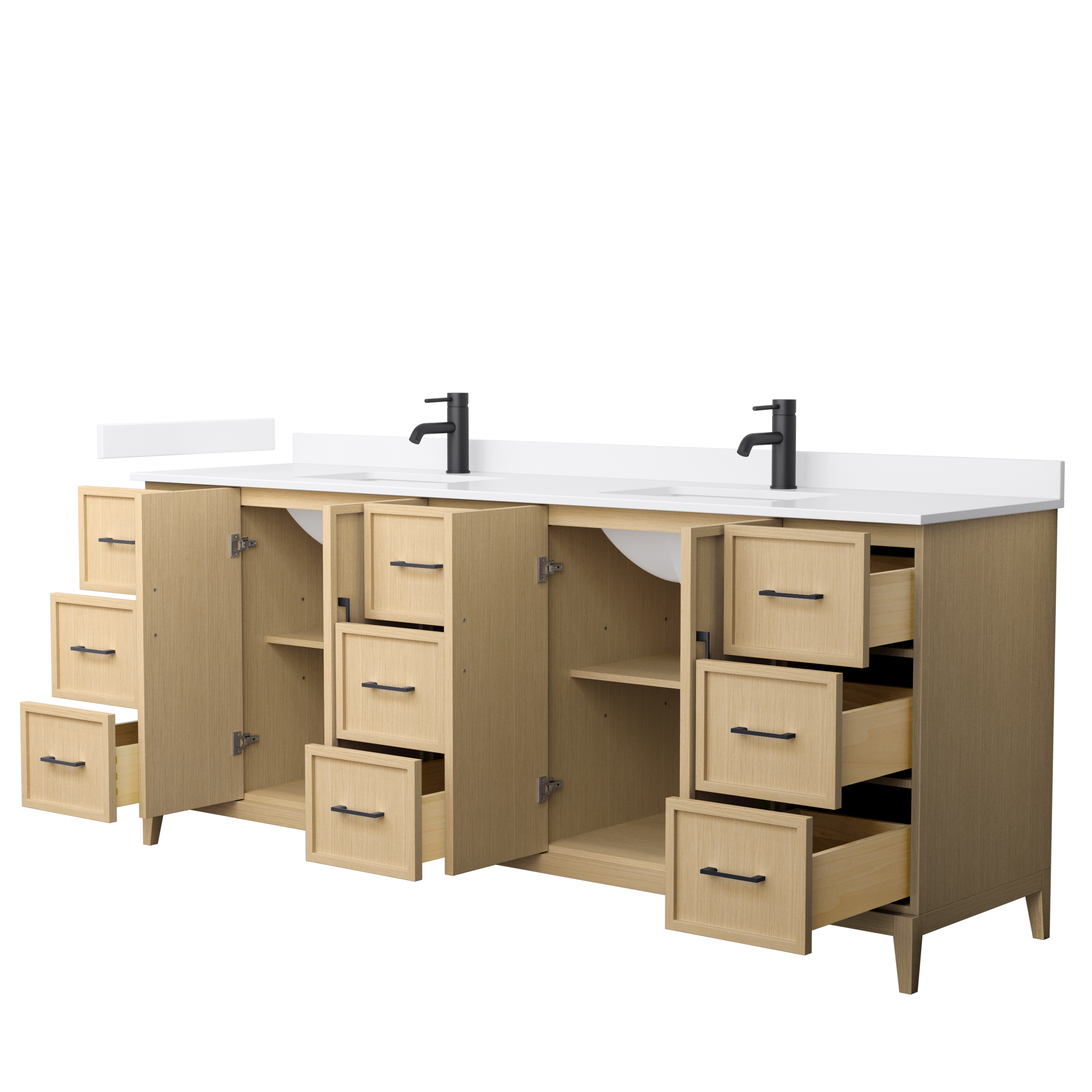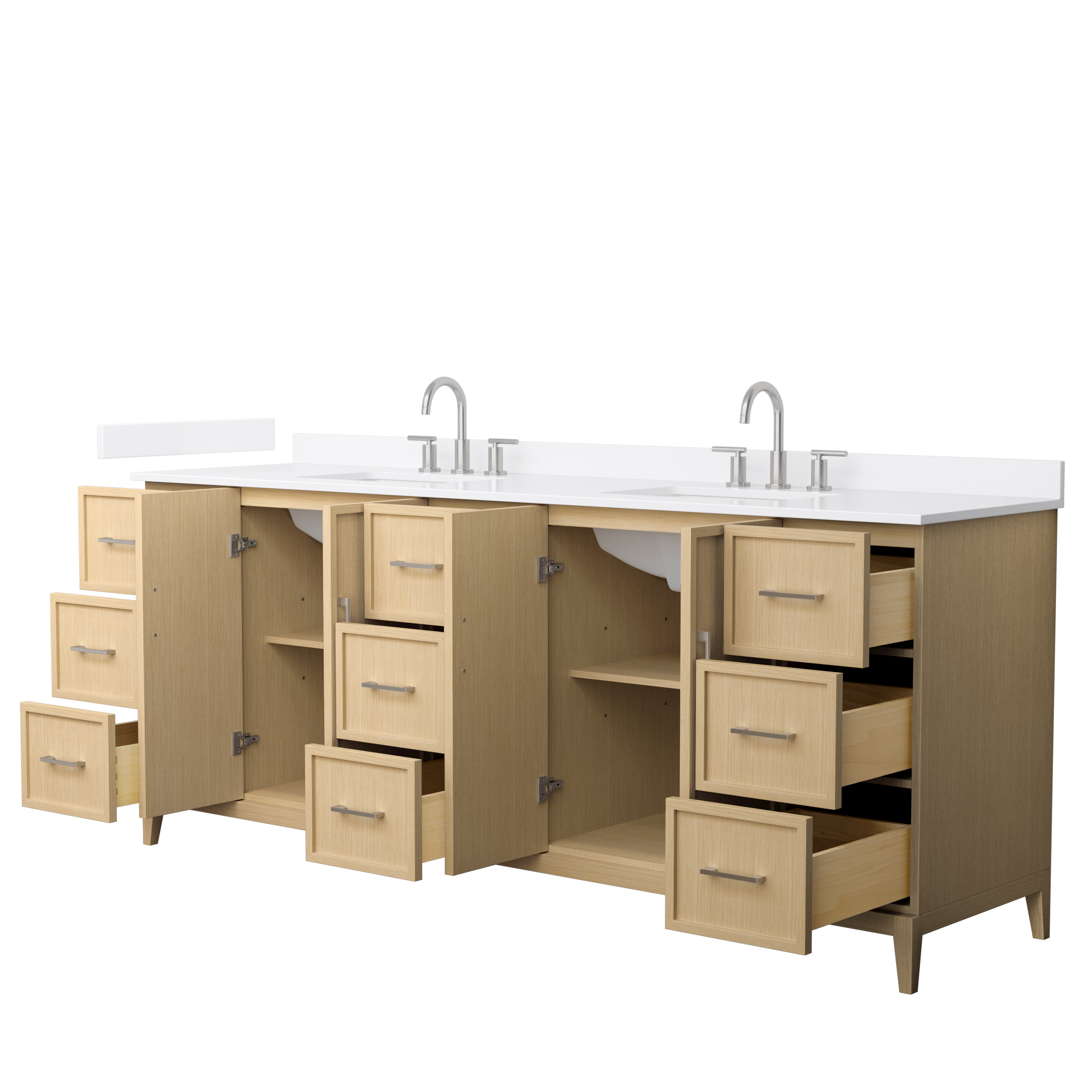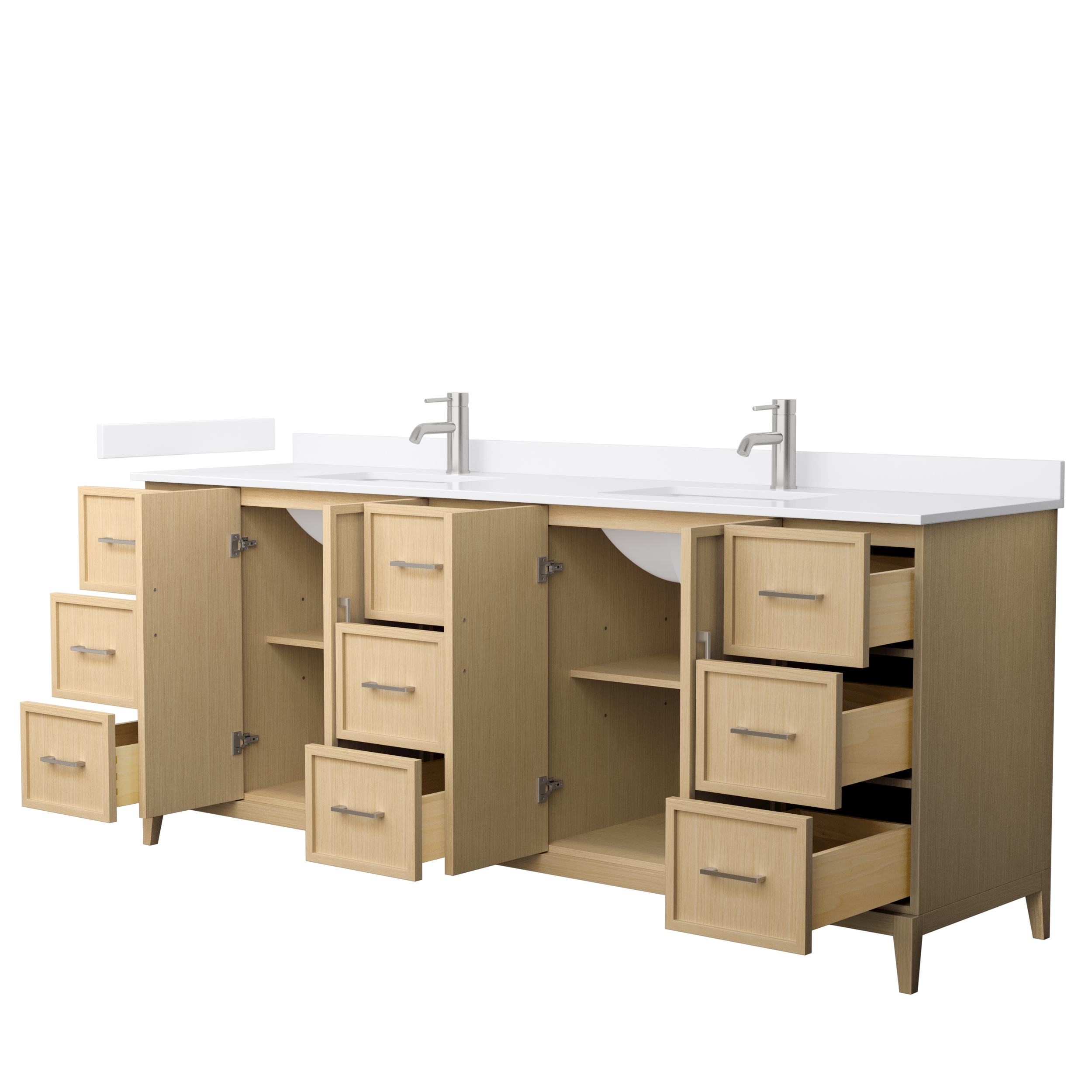 This transitional bathroom vanity exudes sleek sophistication with its clean lines and minimalist slim shaker design. The Elan vanity is crafted from high-quality materials like solid wood and plywood, with counters in multiple material options. Quartz and cultured stone counters include a back-and side-splash. Finished painted or in rift-cut white oak veneer, it seamlessly combines beauty and real-life usefulness. Its integrated, soft-closing drawers (featuring 3D adjustable glides) and doors offer ample storage space for toiletries, towels, and other essentials, keeping the space clutter-free. The sleek, angular hardware contributes to the overall aesthetic, creating a stylish focal point in the bathroom. Elevate your bathroom haven without compromising form or function.