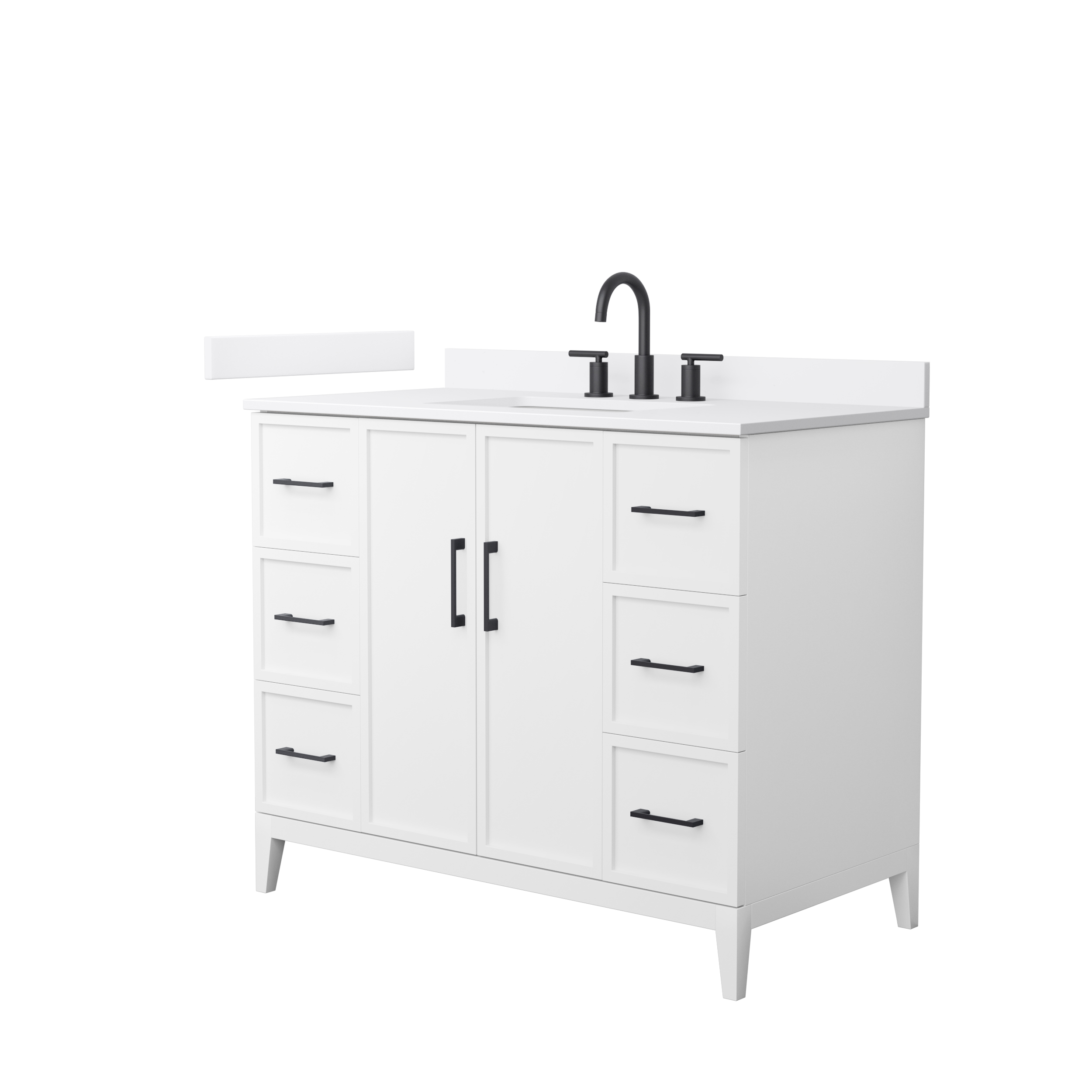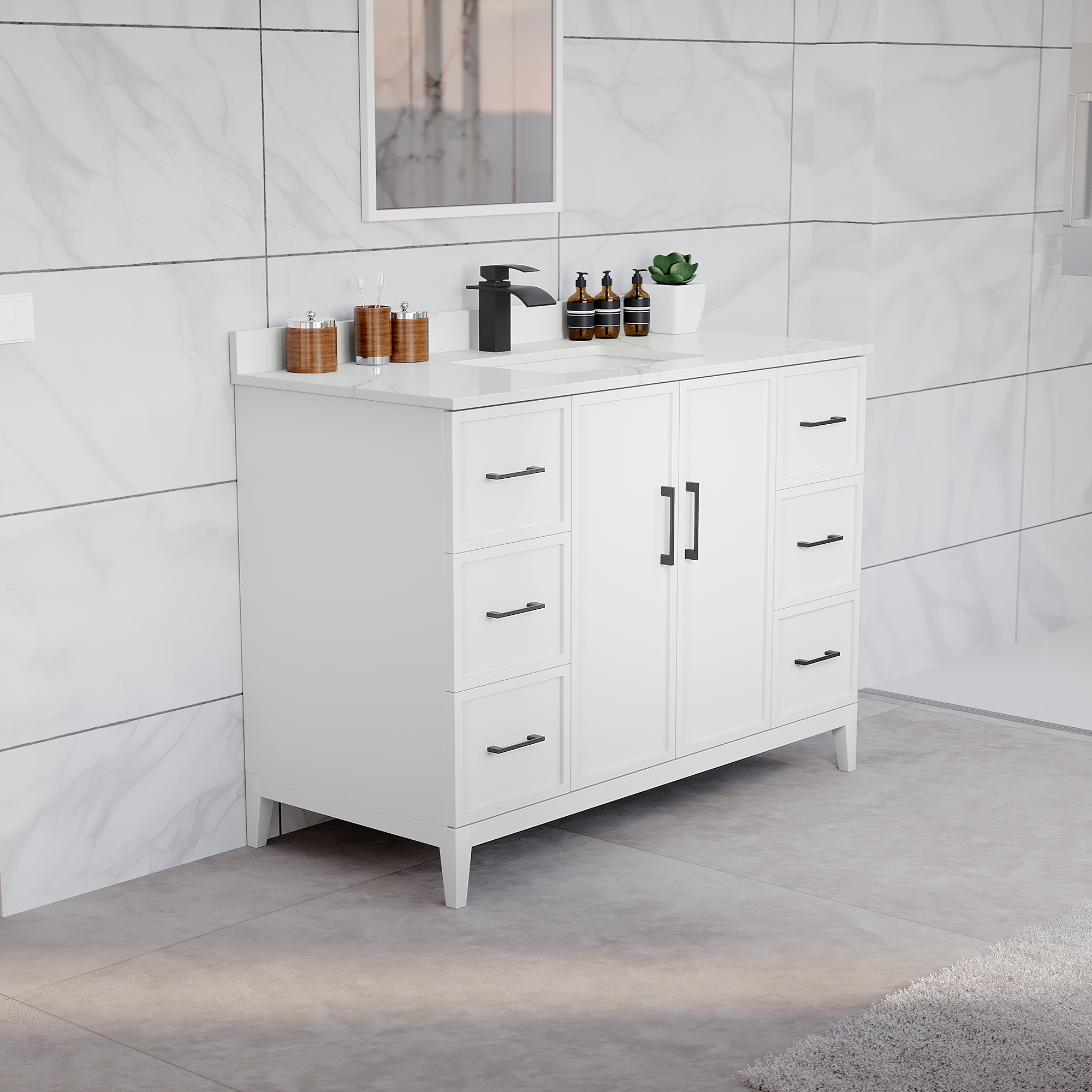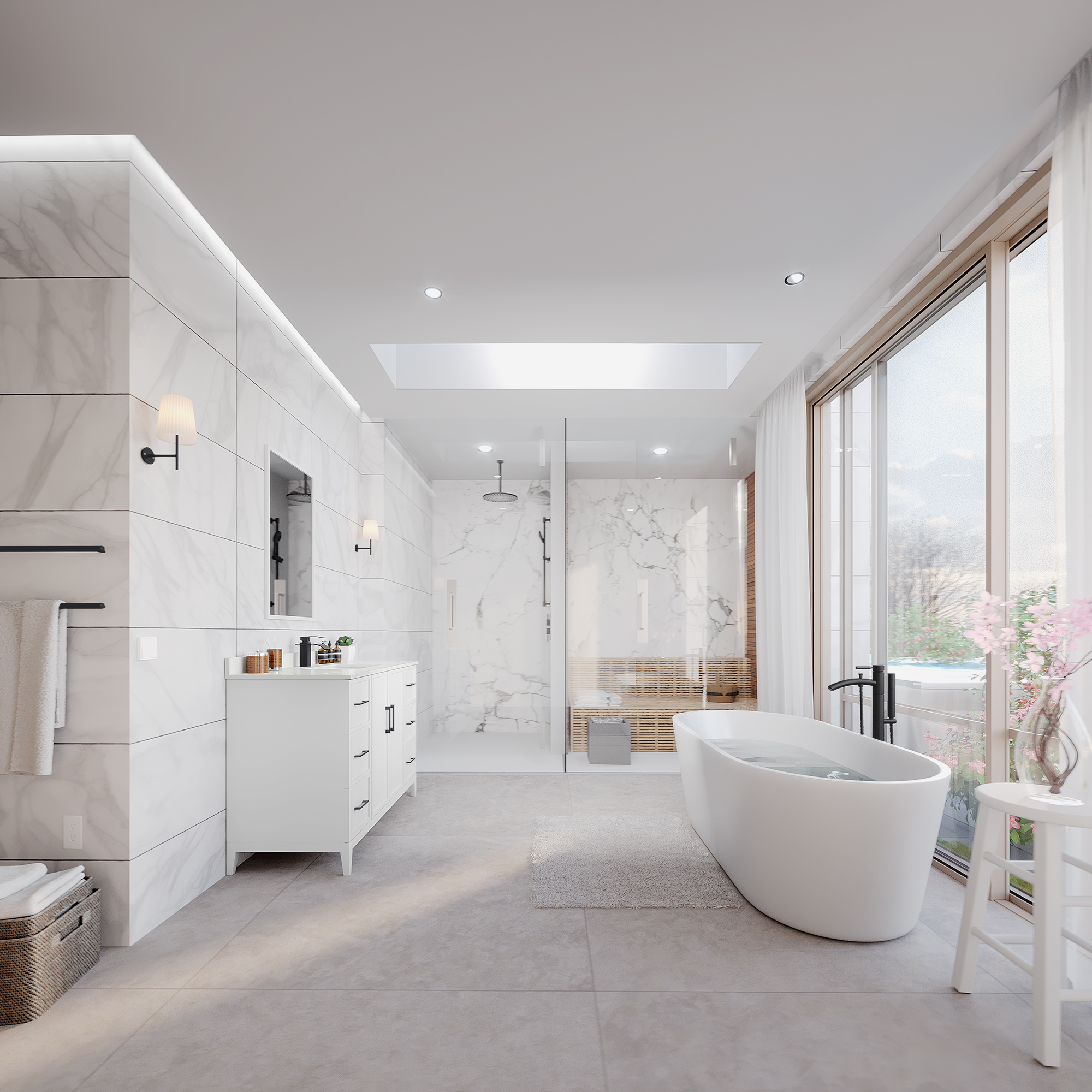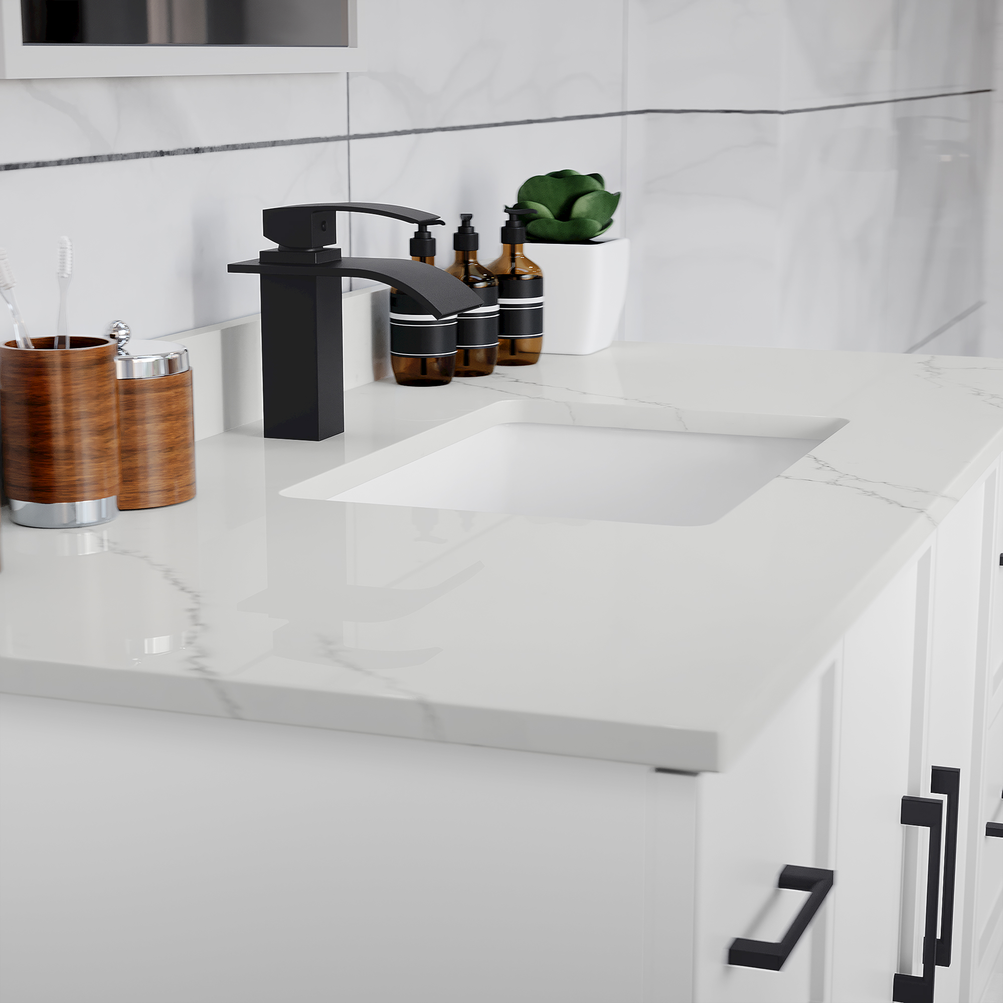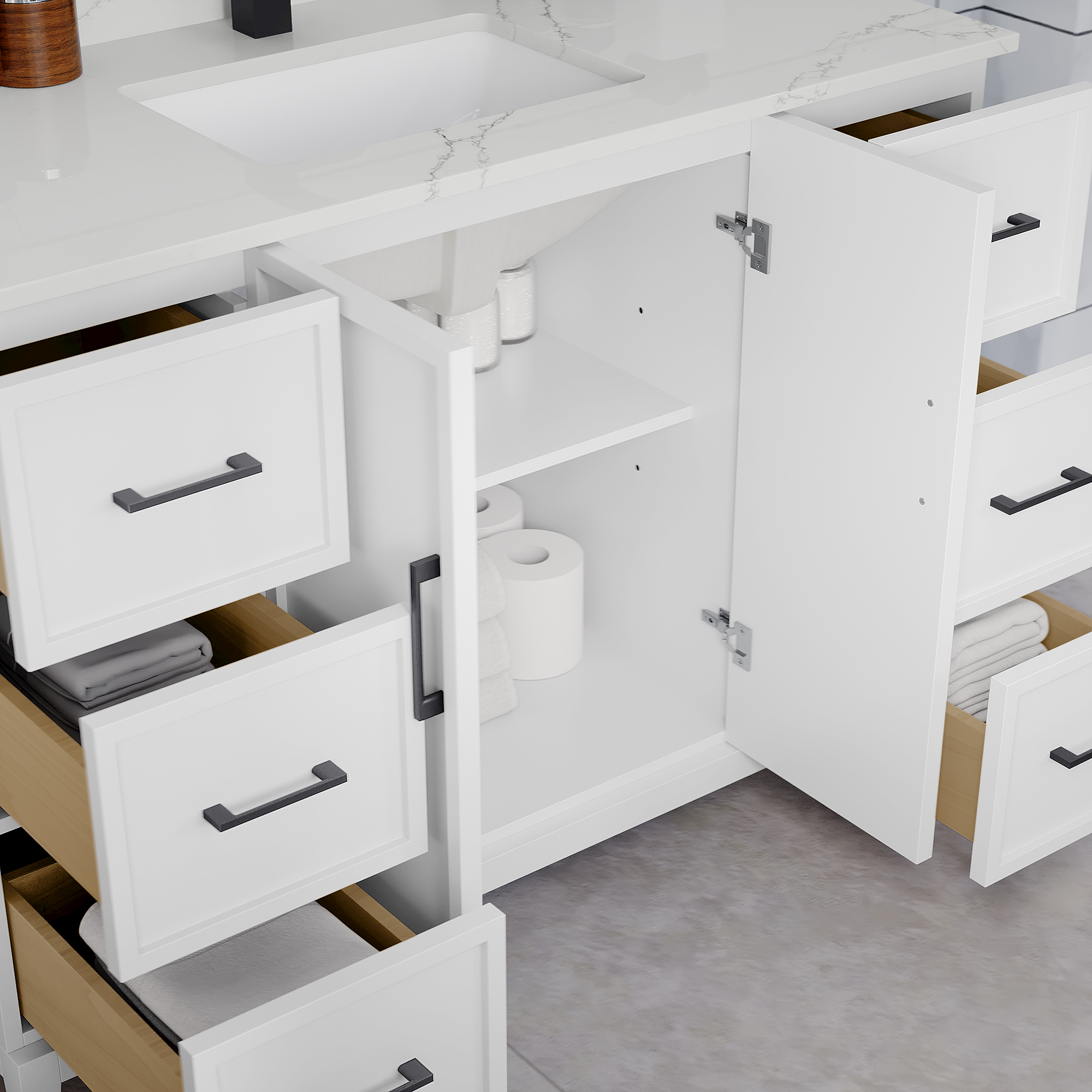 This transitional bathroom vanity exudes sleek sophistication with its clean lines and minimalist slim shaker design. The Elan vanity is crafted from high-quality materials like solid wood and plywood, with counters in multiple material options. Quartz and cultured stone counters include a back-and side-splash. Finished painted or in rift-cut white oak veneer, it seamlessly combines beauty and real-life usefulness. Its integrated, soft-closing drawers (featuring 3D adjustable glides) and doors offer ample storage space for toiletries, towels, and other essentials, keeping the space clutter-free. The sleek, angular hardware contributes to the overall aesthetic, creating a stylish focal point in the bathroom. Elevate your bathroom haven without compromising form or function.
