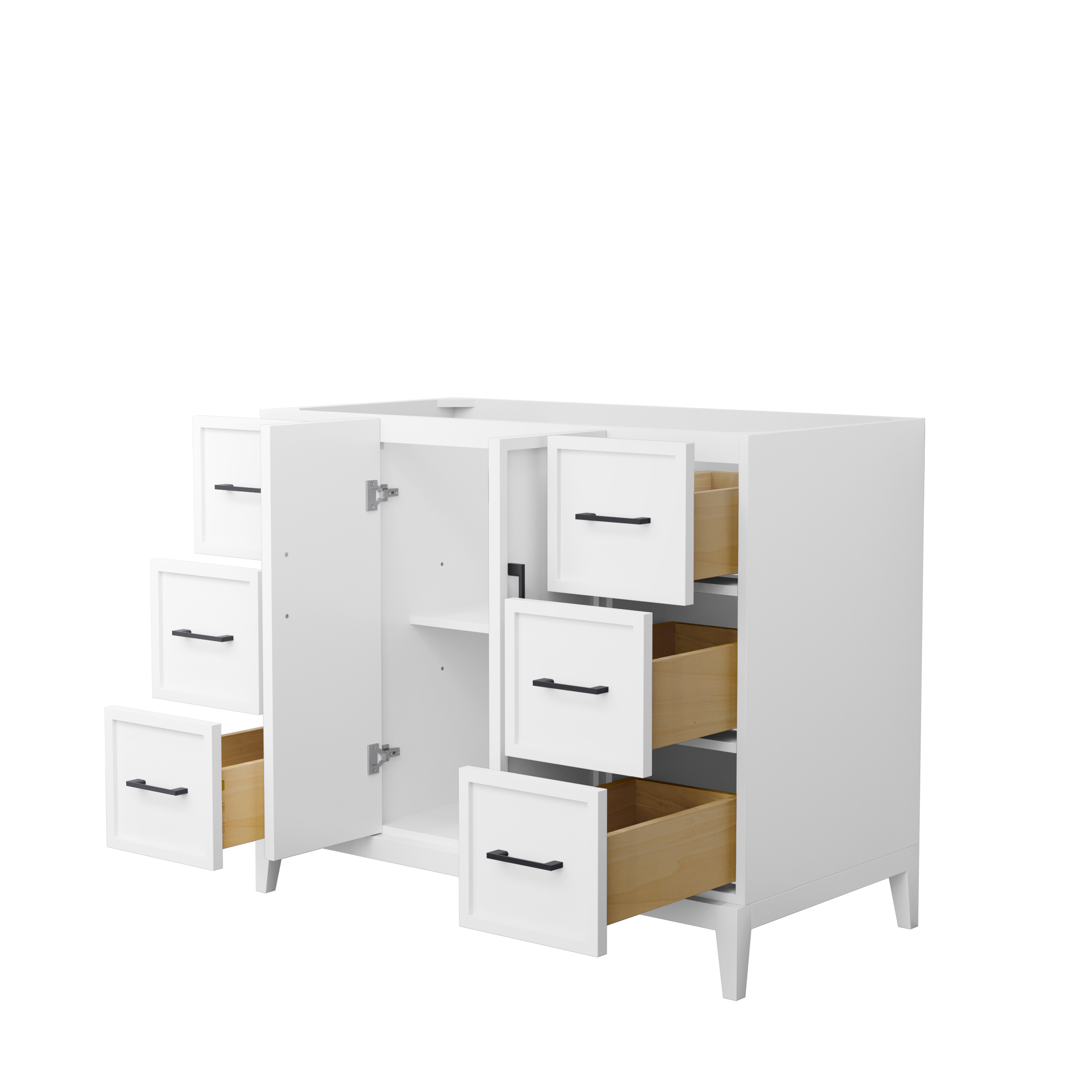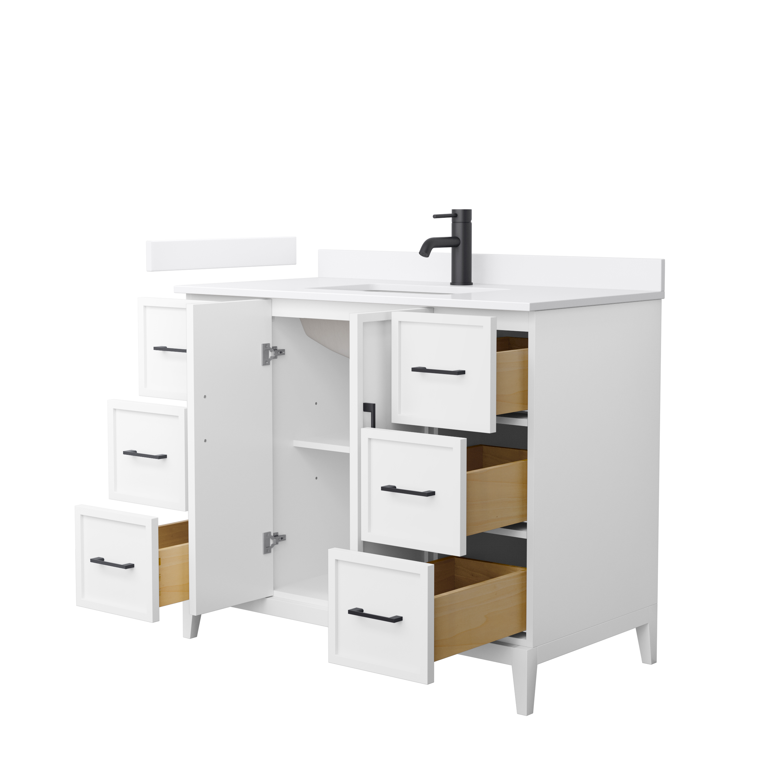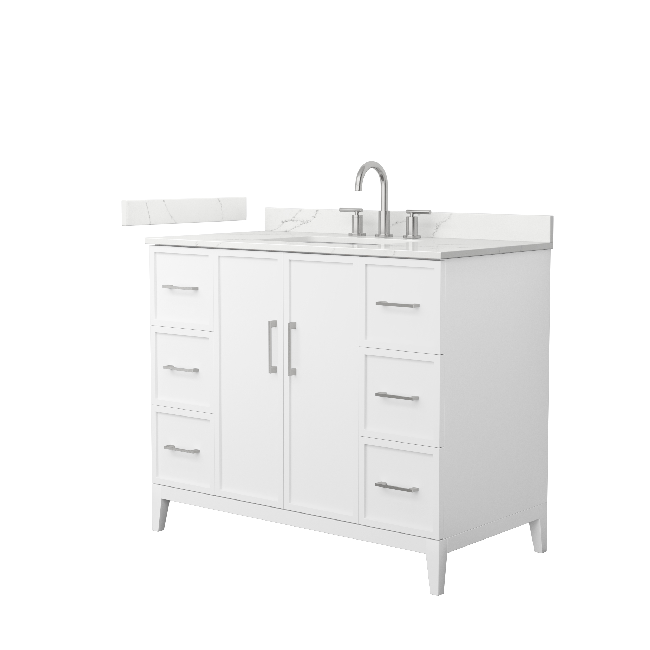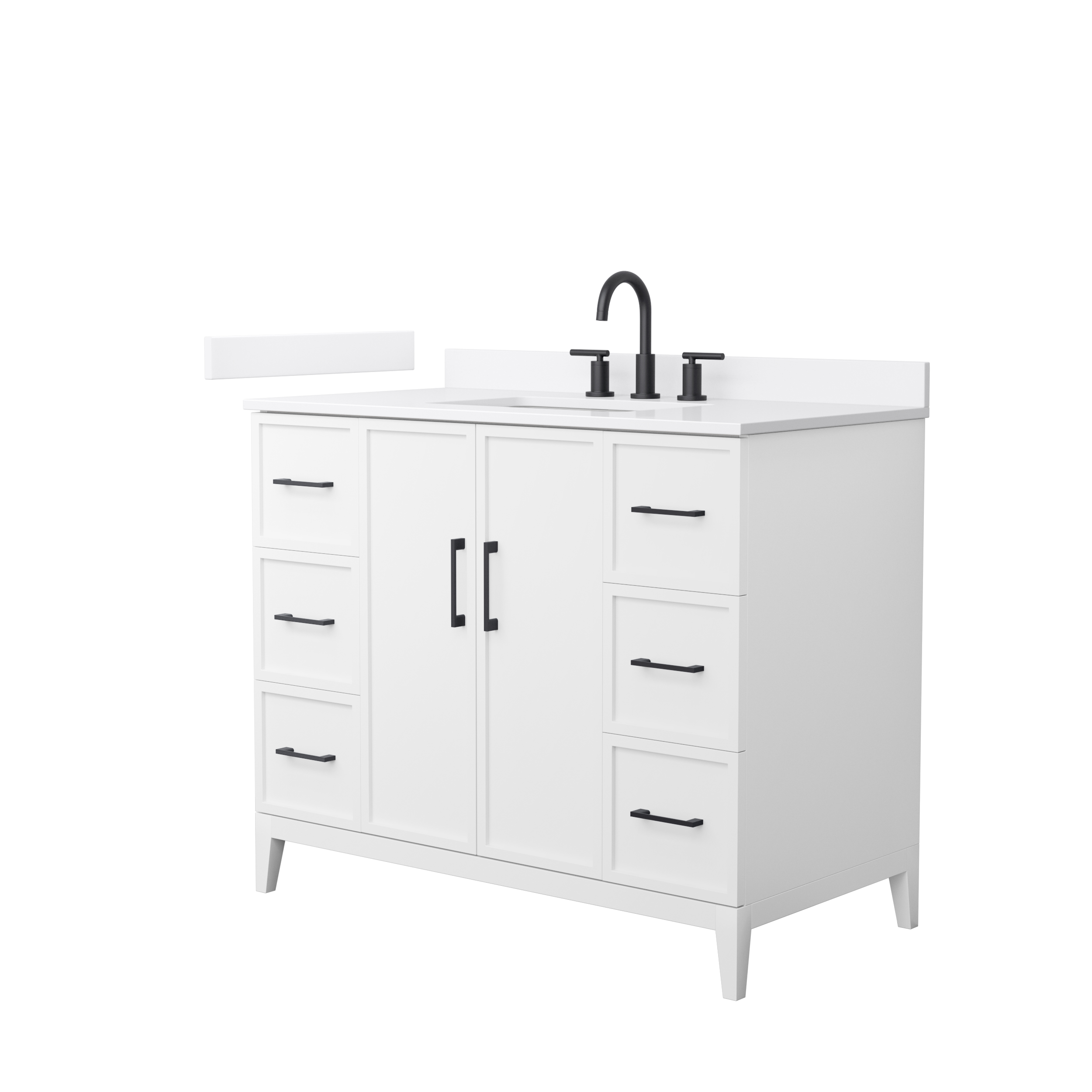 This transitional bathroom vanity exudes sleek sophistication with its clean lines and minimalist slim shaker design. The Elan vanity is crafted from high-quality materials like solid wood and plywood, with counters in multiple material options. Quartz and cultured stone counters include a back-and side-splash. Finished painted or in rift-cut white oak veneer, it seamlessly combines beauty and real-life usefulness. Its integrated, soft-closing drawers (featuring 3D adjustable glides) and doors offer ample storage space for toiletries, towels, and other essentials, keeping the space clutter-free. The sleek, angular hardware contributes to the overall aesthetic, creating a stylish focal point in the bathroom. Elevate your bathroom haven without compromising form or function.