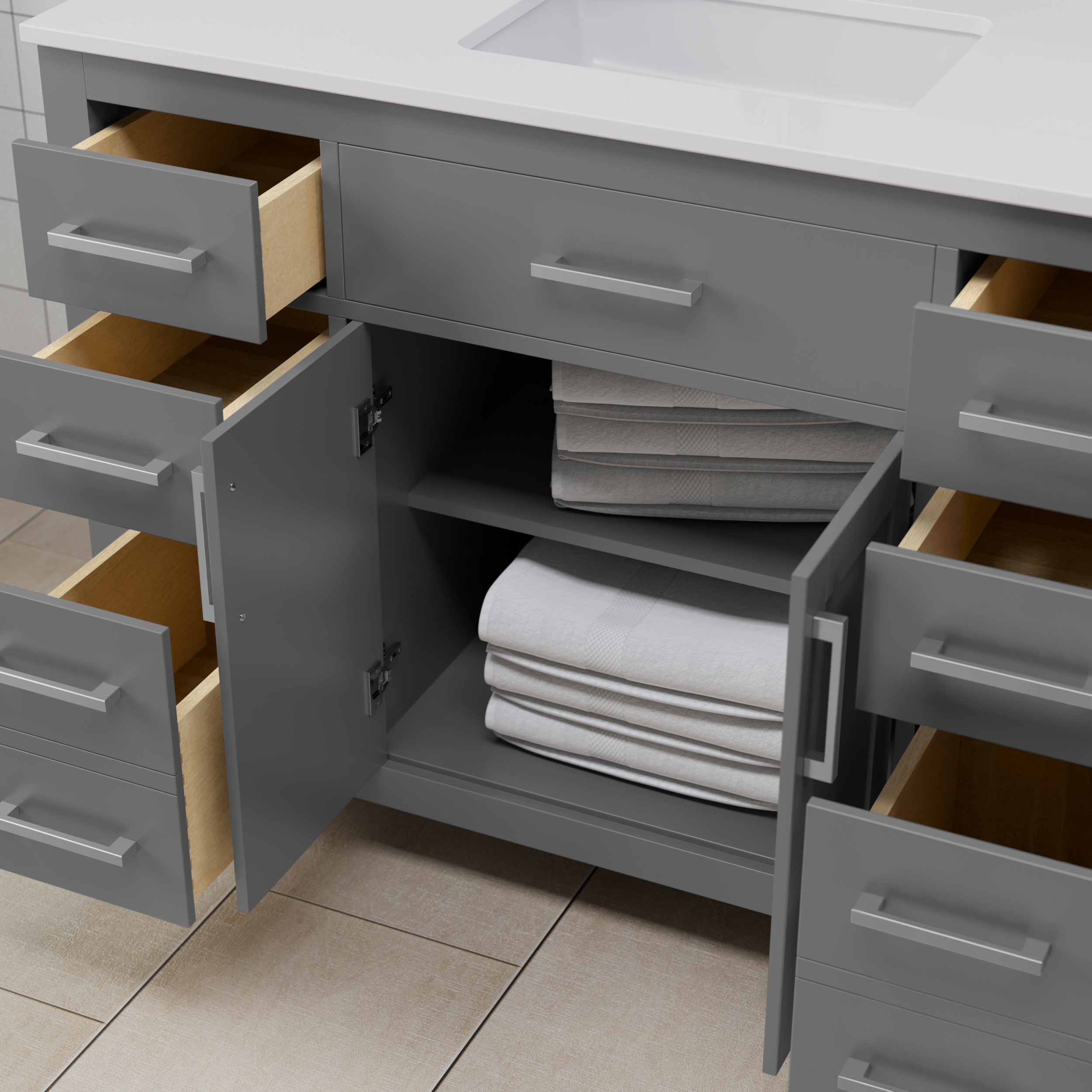 Fantastic value and classic design. The elegant Beckett vanity has it all, with quality touches like brushed nickel, brushed gold, or matte black accents, dove-tailed drawers, cultured marble counters and soft-close doors and drawers. Ample storage and a double-depth lower drawer give you plenty of room for those bathroom necessities. Do your bathroom right, with the beautiful Beckett vanity series.