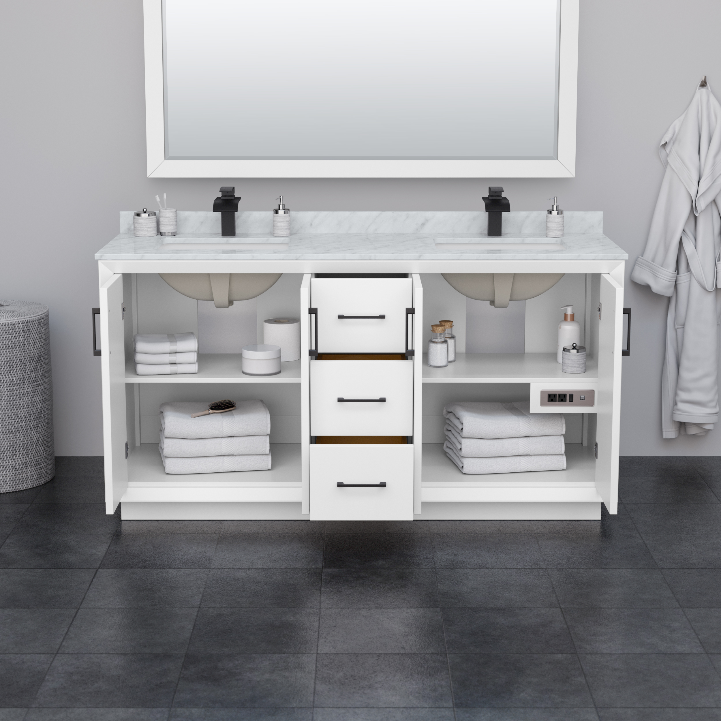 Perfect for a modern update, the Strada bathroom vanity features clean and understated contemporary lines that highlight the elegance and simplicity of this transitional vanity by Wyndham Collection. It comes well equipped with soft-close doors and drawers, ample storage space, 110V power and USB outlets, adjustable shelves, and a cutout back for easy access to plumbing and electrical.