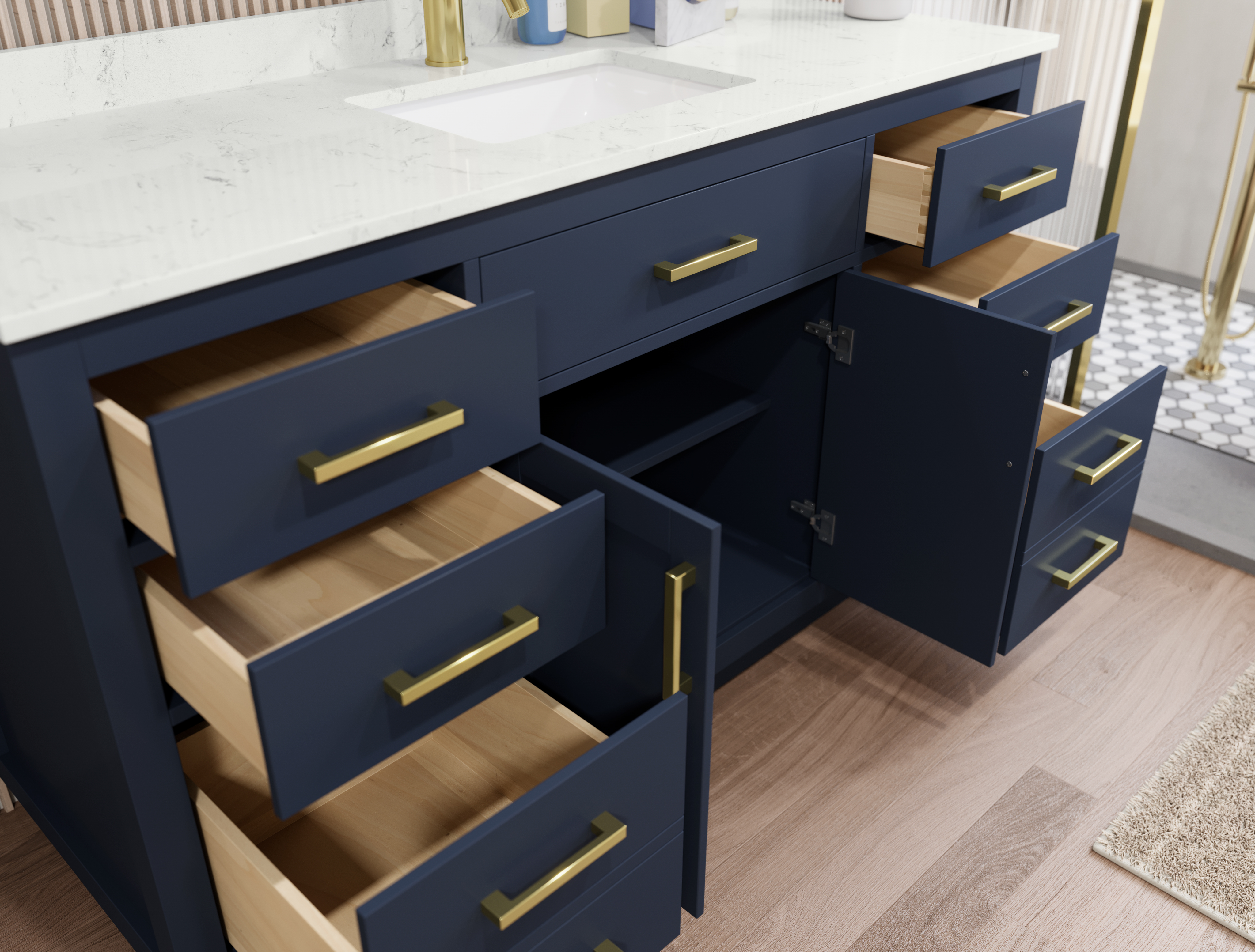 Elevate your bathroom with the Beckett vanity series. Experience timeless design, quality craftsmanship, and thoughtful details with brushed nickel, brushed gold, or matte black accents. This vanity features dove-tailed drawers, cultured marble or quartz counters, and soft-close doors and drawers. The Beckett vanity offers ample storage and a stylish double-depth lower drawer. Redefine your bathroom space with the perfect blend of elegance and functionality.