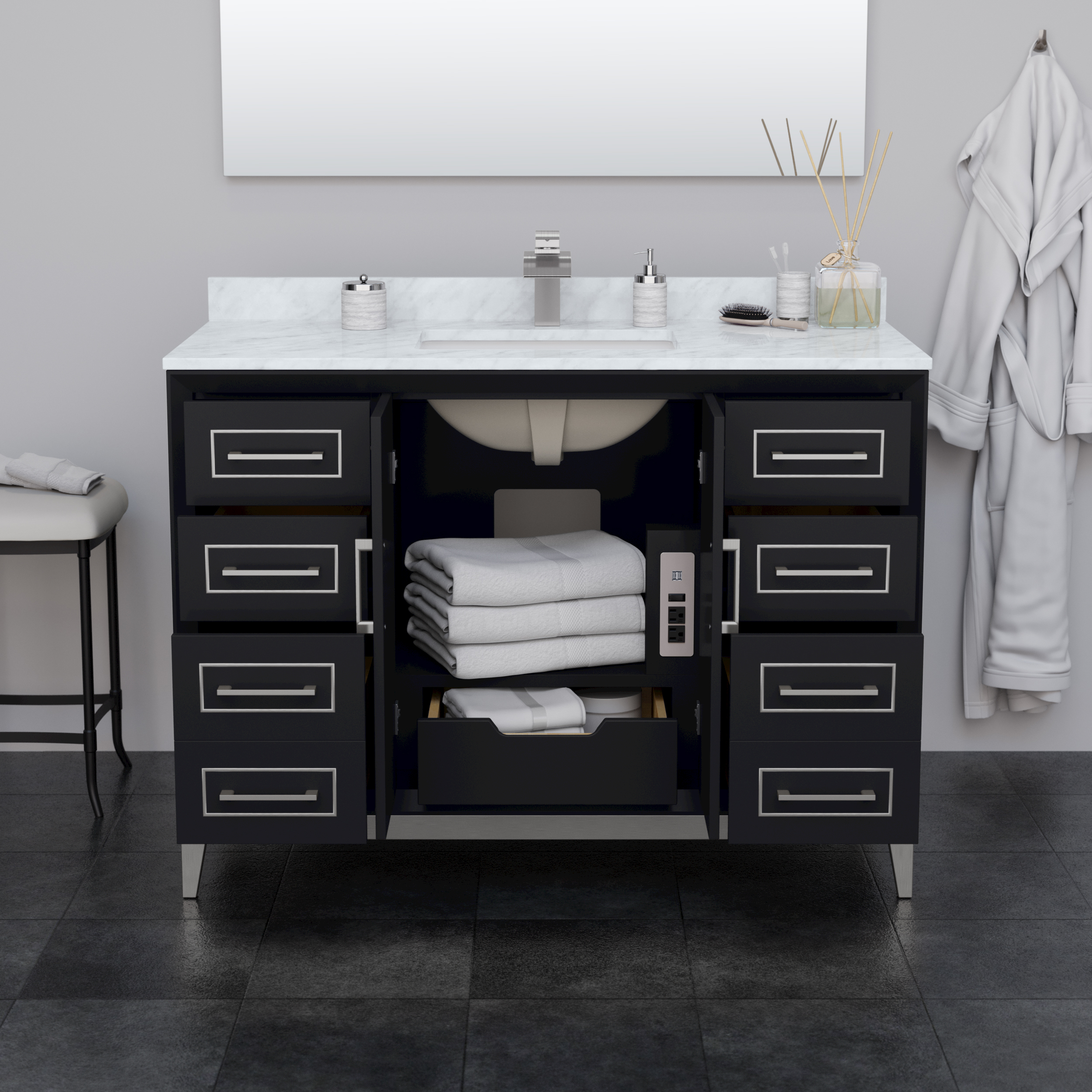 Classic luxurious elegance with clean and contemporary styling are the hallmarks of the beautiful Marlena vanity collection, perfect for most home decors. Offered in a range of sizes, cabinet colors and metal trim colors, you're sure to find the perfect fit. There's plenty of storage space, soft-close doors and drawers, internal drawers and the convenience of a 110v outlet and USB charger just inside the door. Offered with available Quartz, Carrara Marble, or Cultured Stone counters.