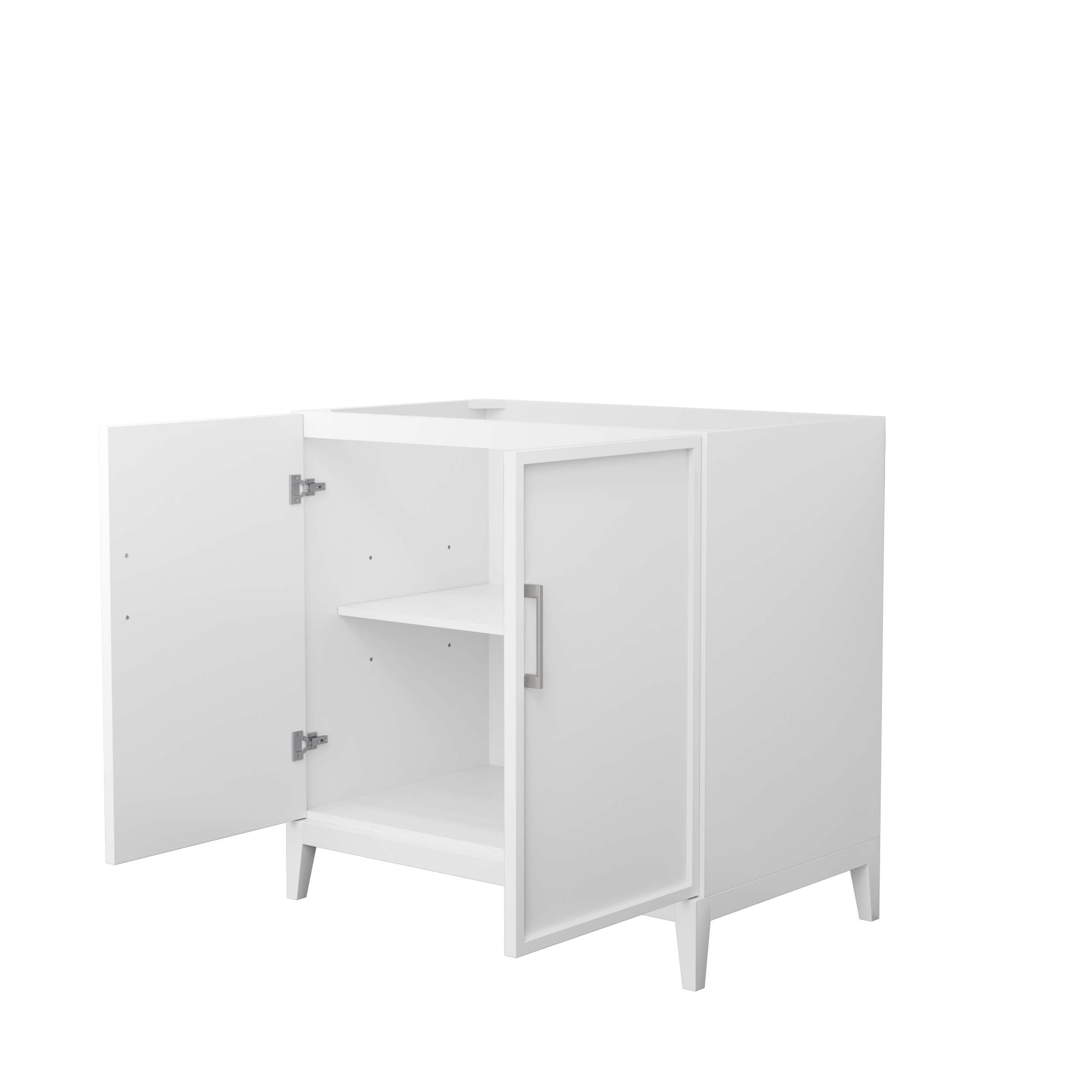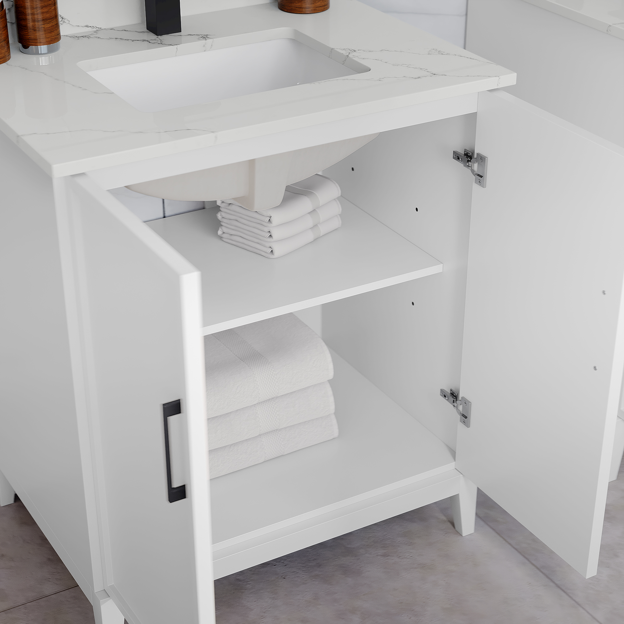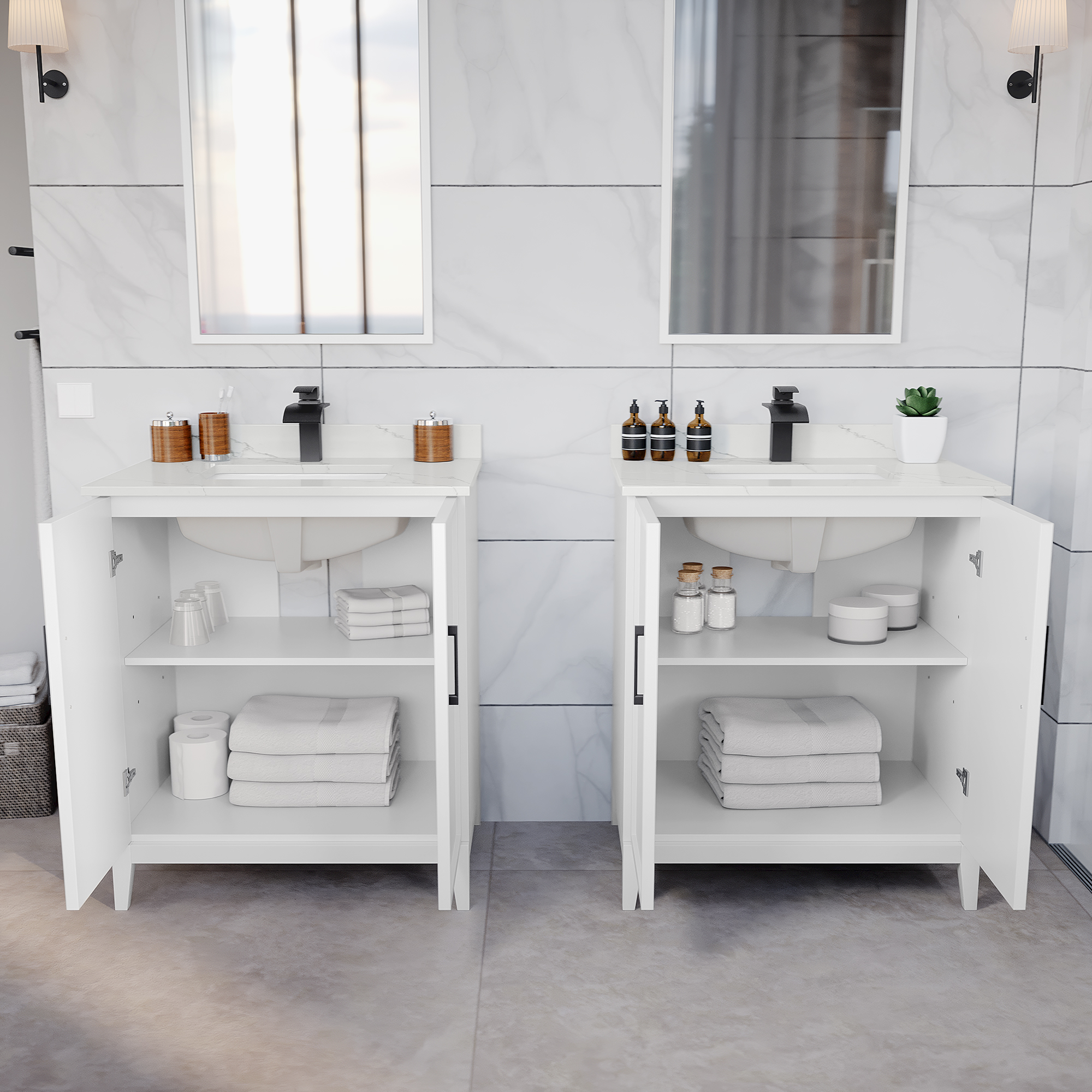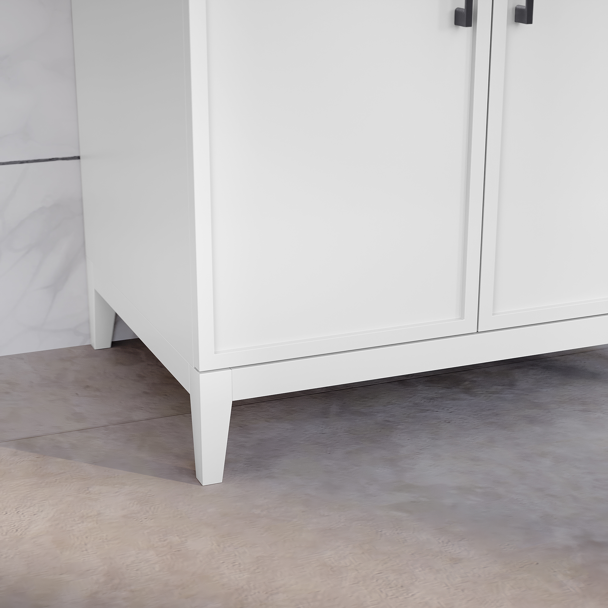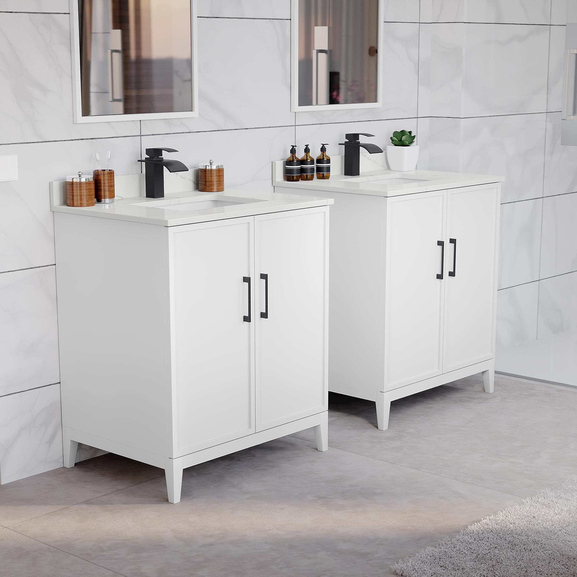 This transitional bathroom vanity exudes sleek sophistication with its clean lines and minimalist slim shaker design. The Elan vanity is crafted from high-quality materials like solid wood and plywood, with counters in multiple material options. Quartz and cultured stone counters include a back-and side-splash. Finished painted or in rift-cut white oak veneer, it seamlessly combines beauty and real-life usefulness. Its integrated, soft-closing drawers (featuring 3D adjustable glides) and doors offer ample storage space for toiletries, towels, and other essentials, keeping the space clutter-free. The sleek, angular hardware contributes to the overall aesthetic, creating a stylish focal point in the bathroom. Elevate your bathroom haven without compromising form or function.