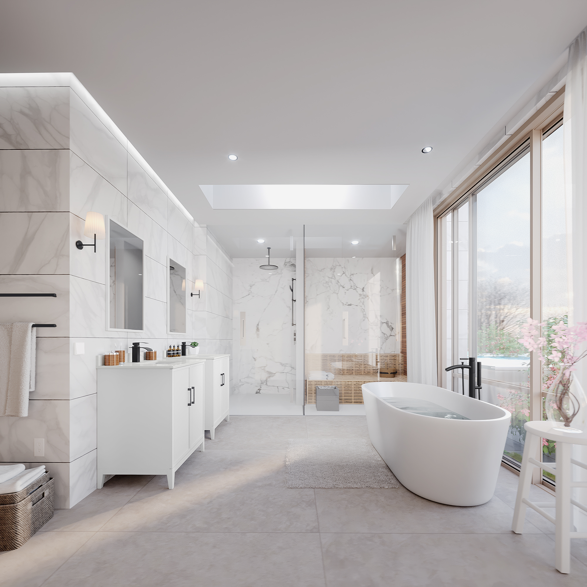 • Counter options include Giotto Quartz, White Quartz, White Carrara Marble, White Cultured Marble, or Carrara Cultured Marble