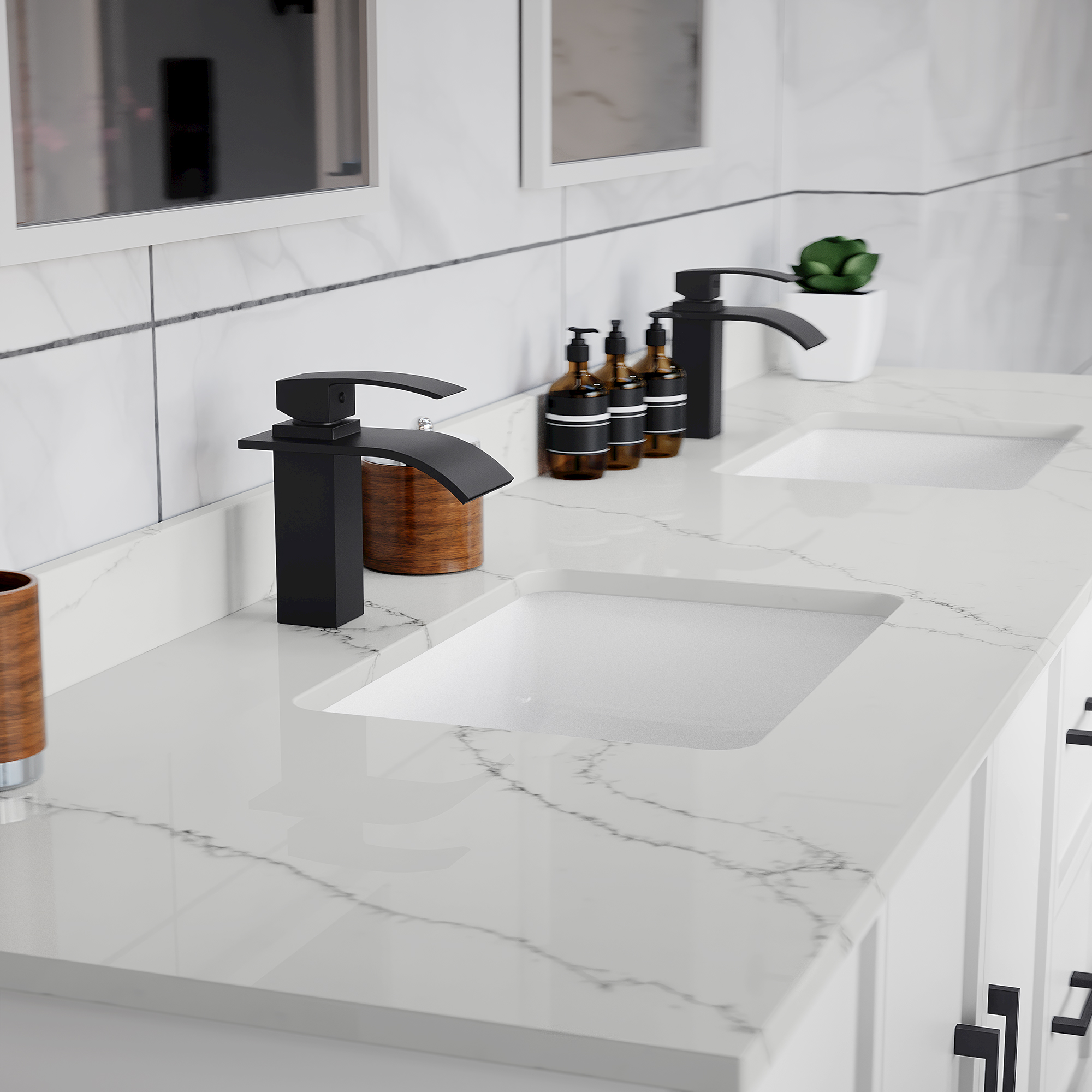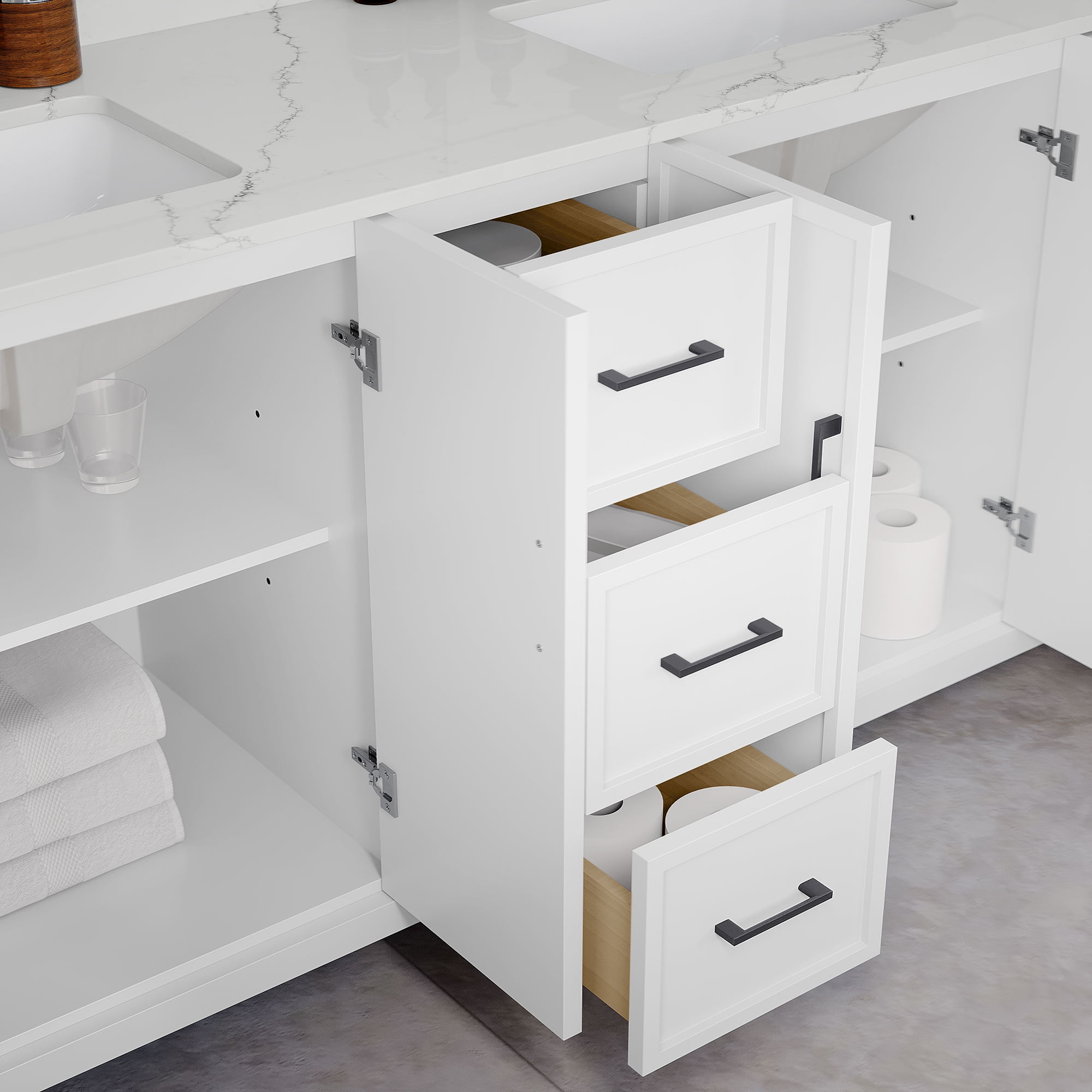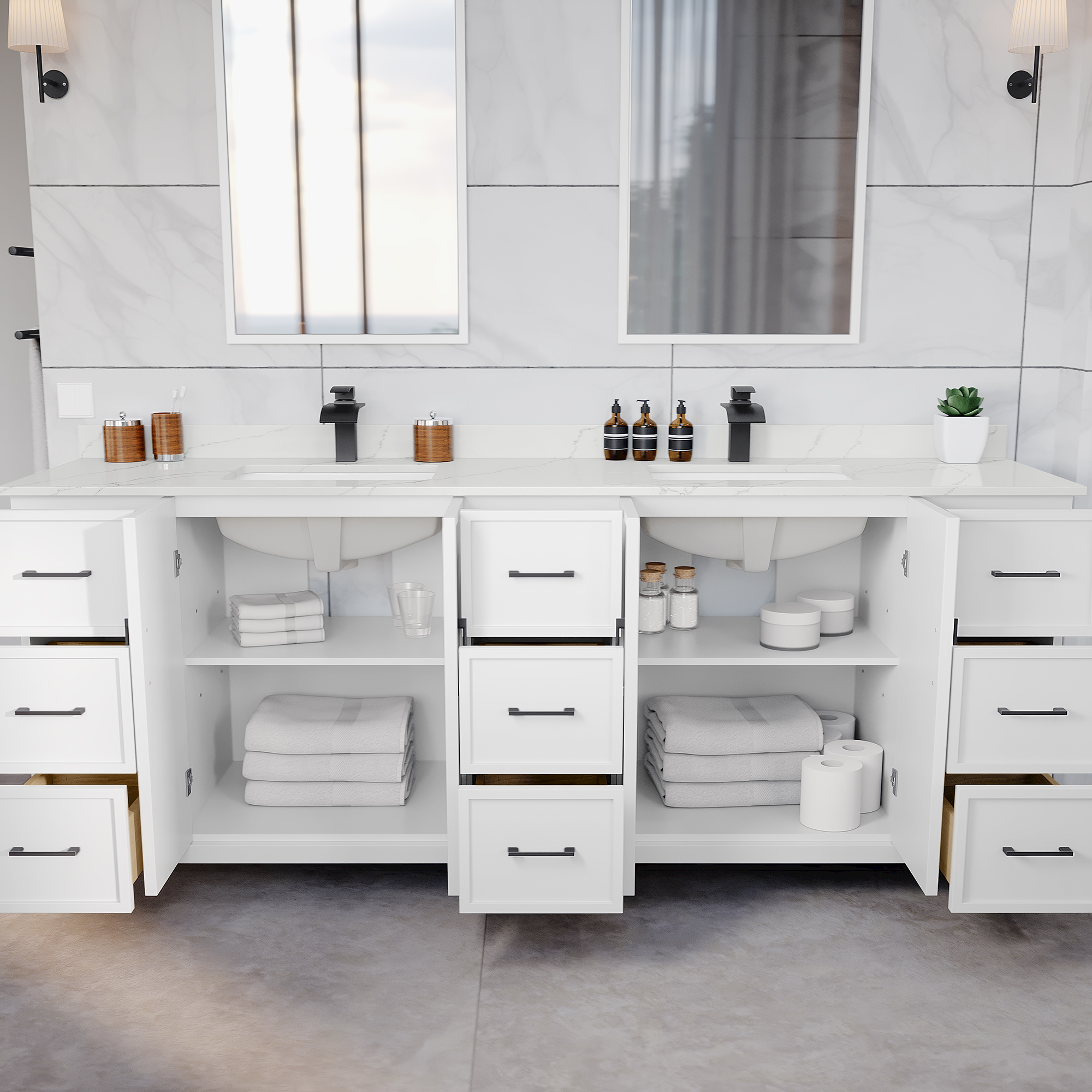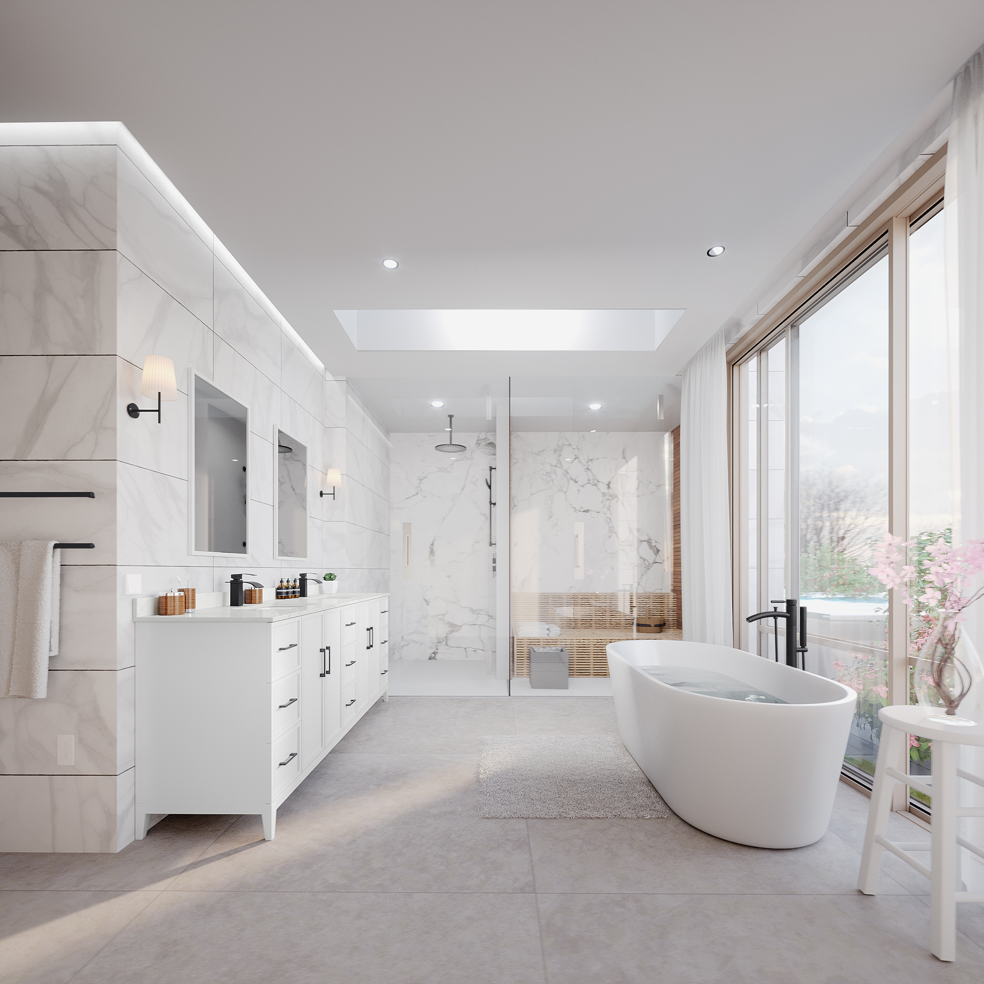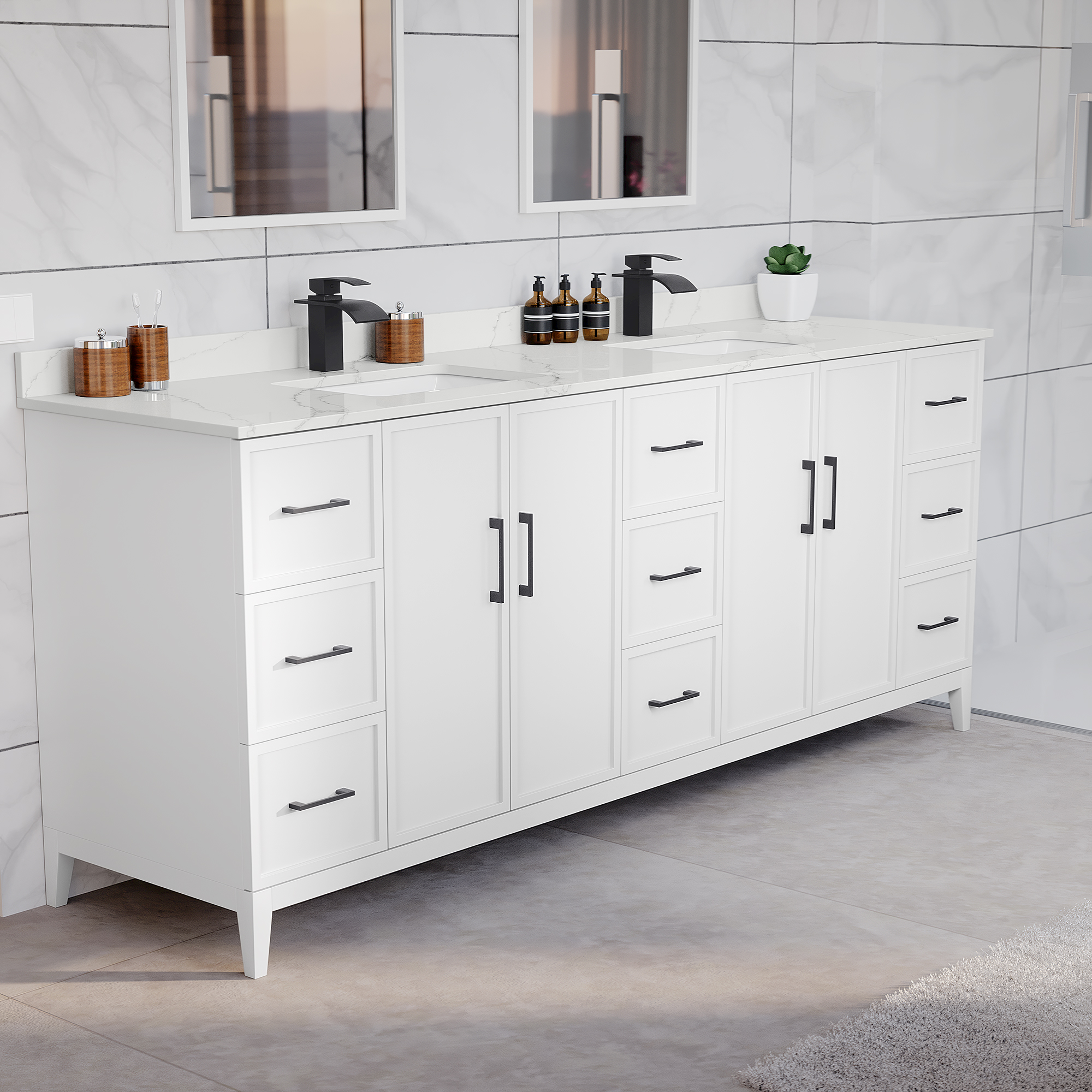 This transitional bathroom vanity exudes sleek sophistication with its clean lines and minimalist slim shaker design. The Elan vanity is crafted from high-quality materials like solid wood and plywood, with counters in multiple material options. Quartz and cultured stone counters include a back-and side-splash. Finished painted or in rift-cut white oak veneer, it seamlessly combines beauty and real-life usefulness. Its integrated, soft-closing drawers (featuring 3D adjustable glides) and doors offer ample storage space for toiletries, towels, and other essentials, keeping the space clutter-free. The sleek, angular hardware contributes to the overall aesthetic, creating a stylish focal point in the bathroom. Elevate your bathroom haven without compromising form or function.