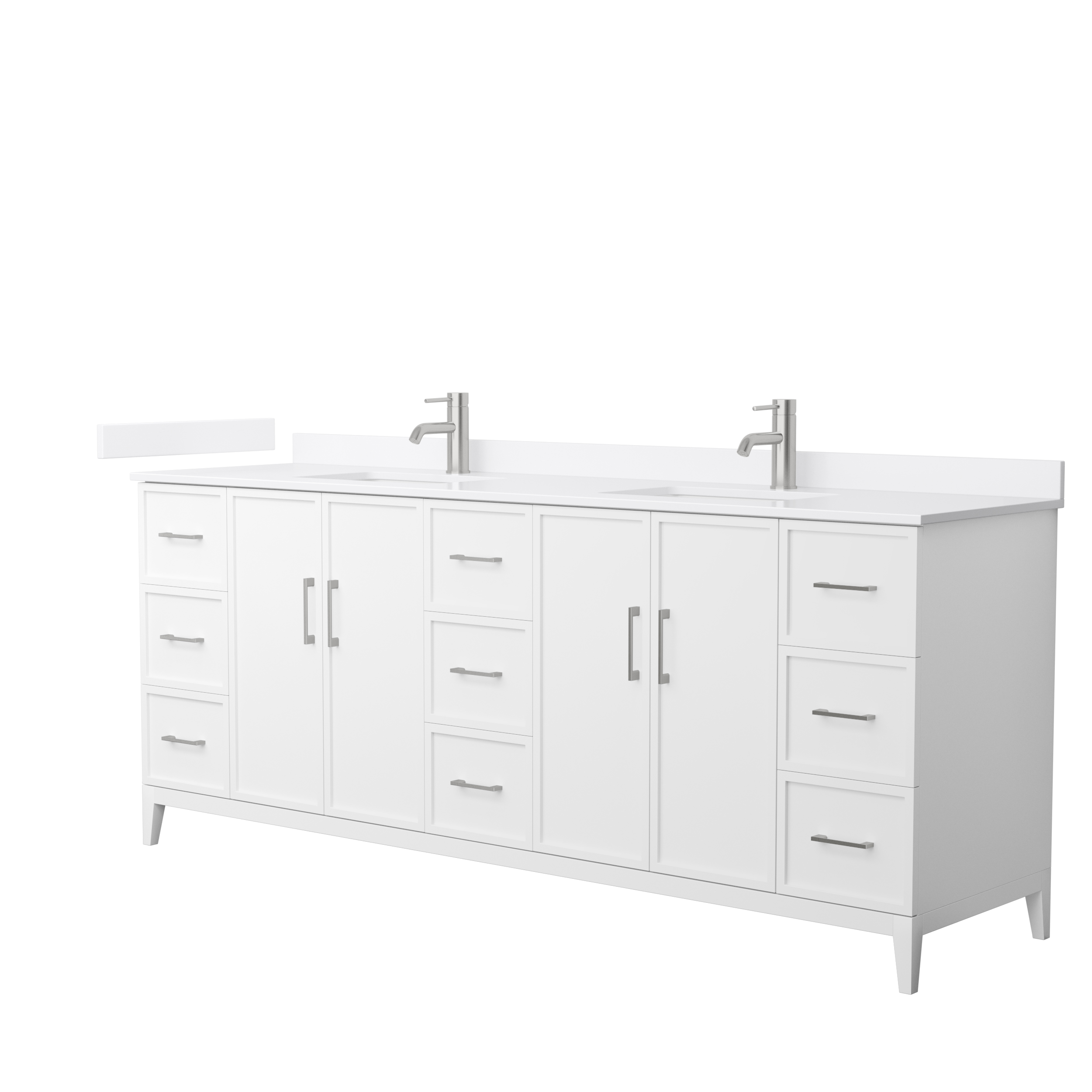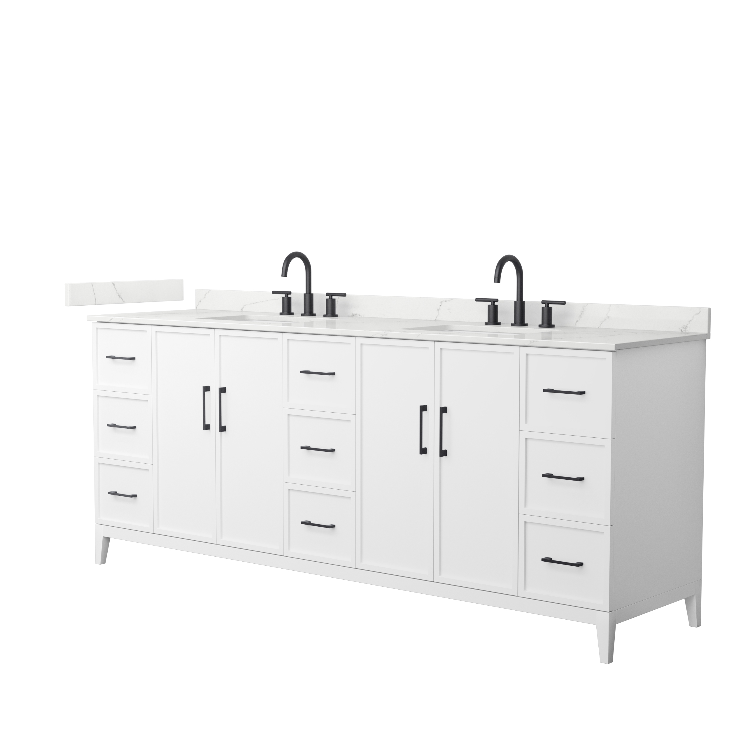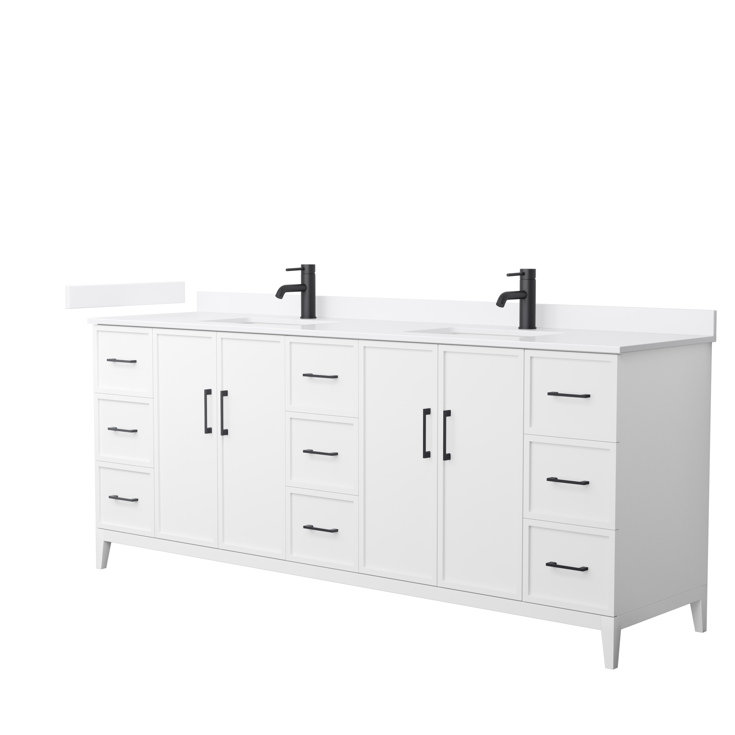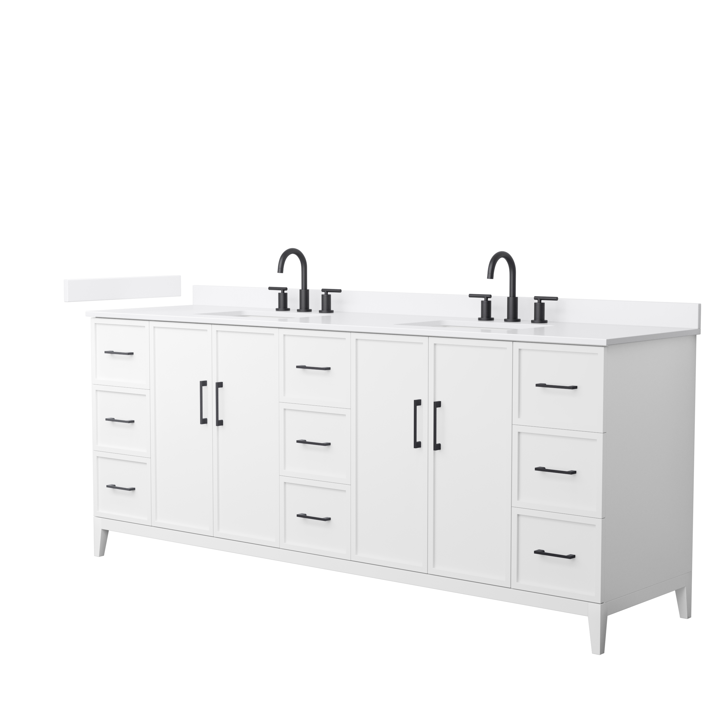 This transitional bathroom vanity exudes sleek sophistication with its clean lines and minimalist slim shaker design. The Elan vanity is crafted from high-quality materials like solid wood and plywood, with counters in multiple material options. Quartz and cultured stone counters include a back-and side-splash. Finished painted or in rift-cut white oak veneer, it seamlessly combines beauty and real-life usefulness. Its integrated, soft-closing drawers (featuring 3D adjustable glides) and doors offer ample storage space for toiletries, towels, and other essentials, keeping the space clutter-free. The sleek, angular hardware contributes to the overall aesthetic, creating a stylish focal point in the bathroom. Elevate your bathroom haven without compromising form or function.