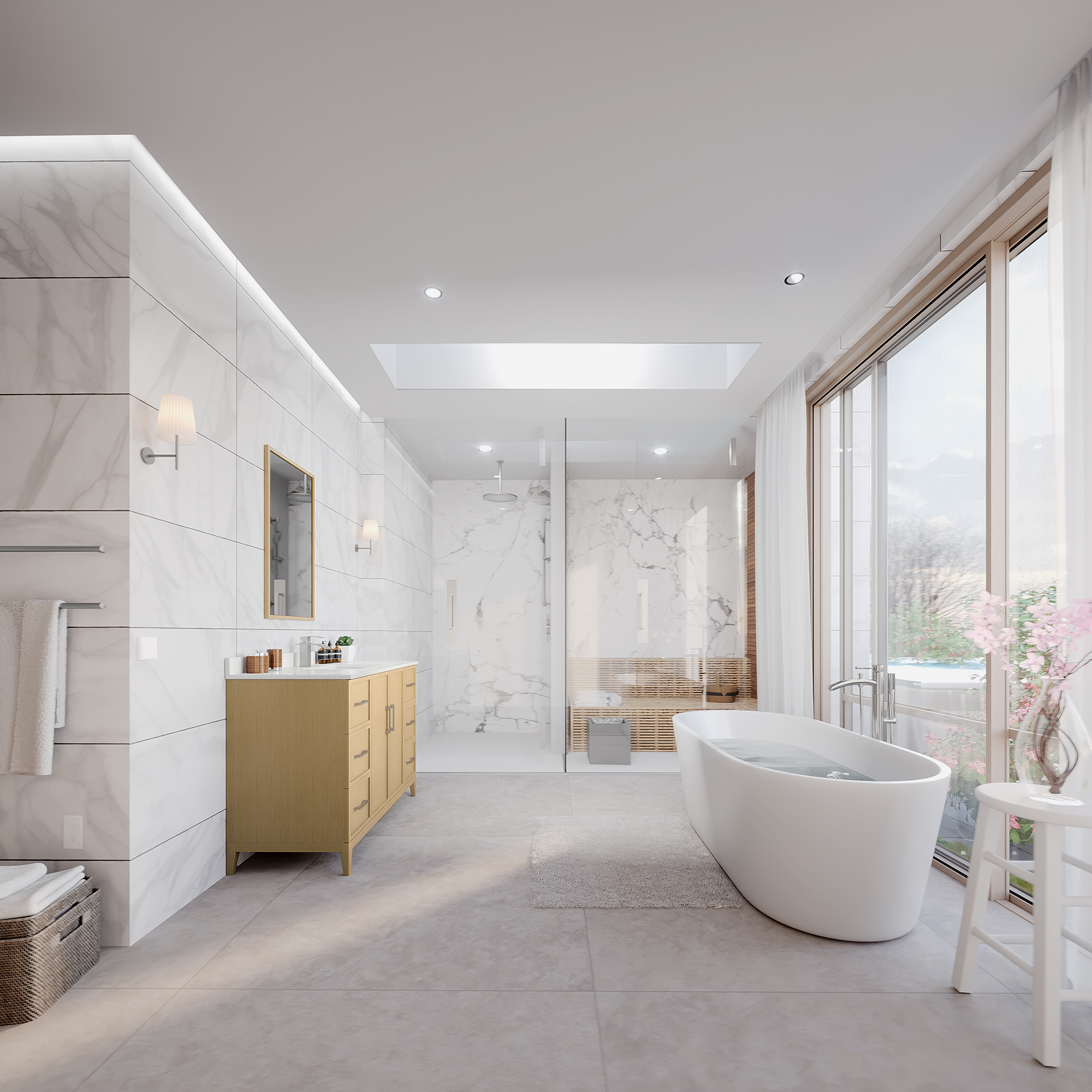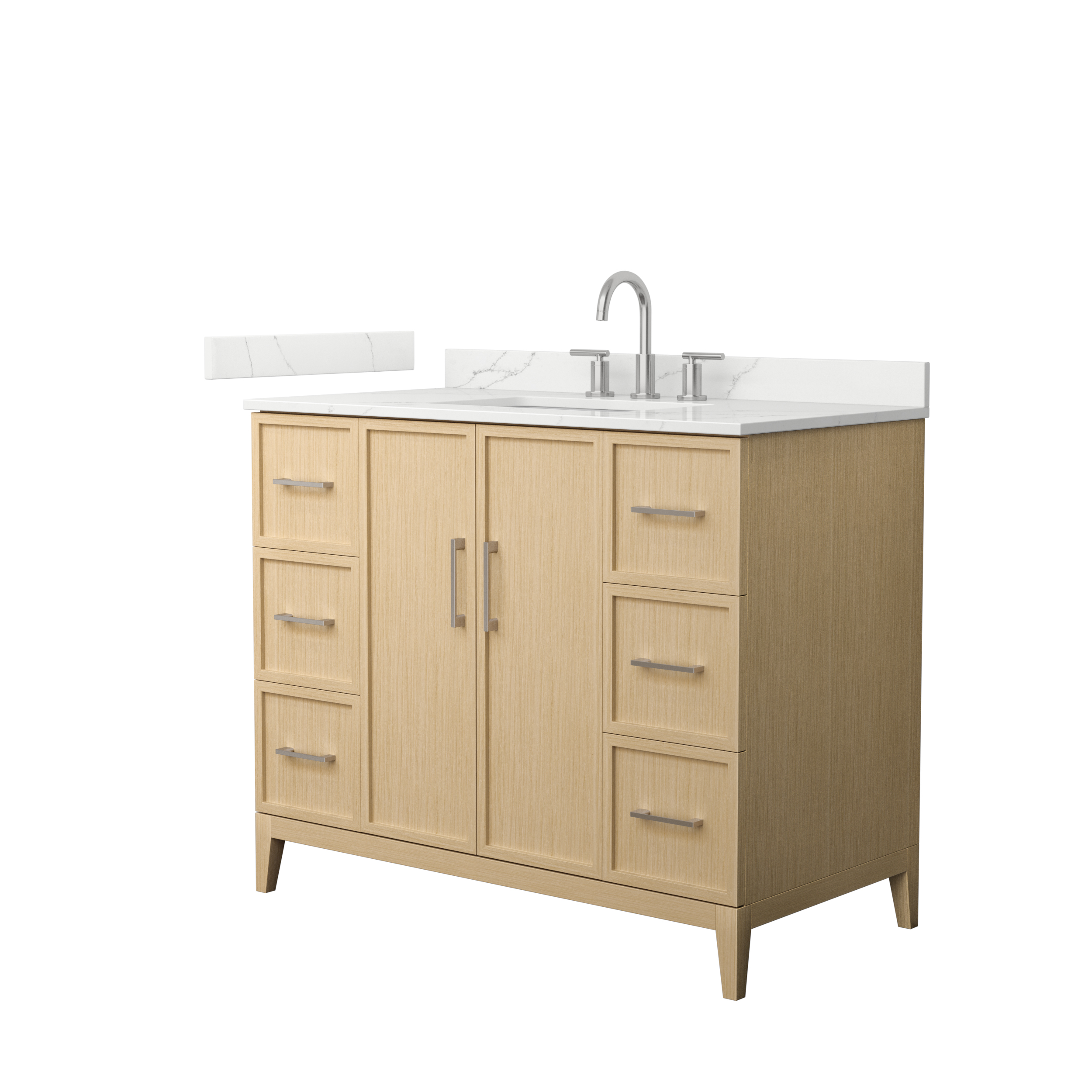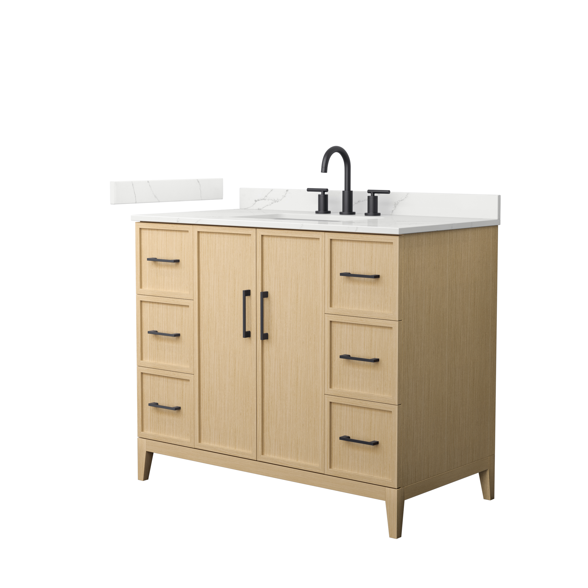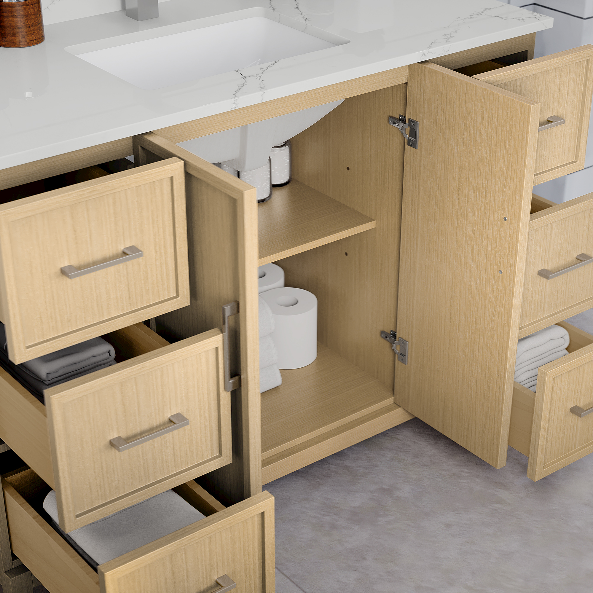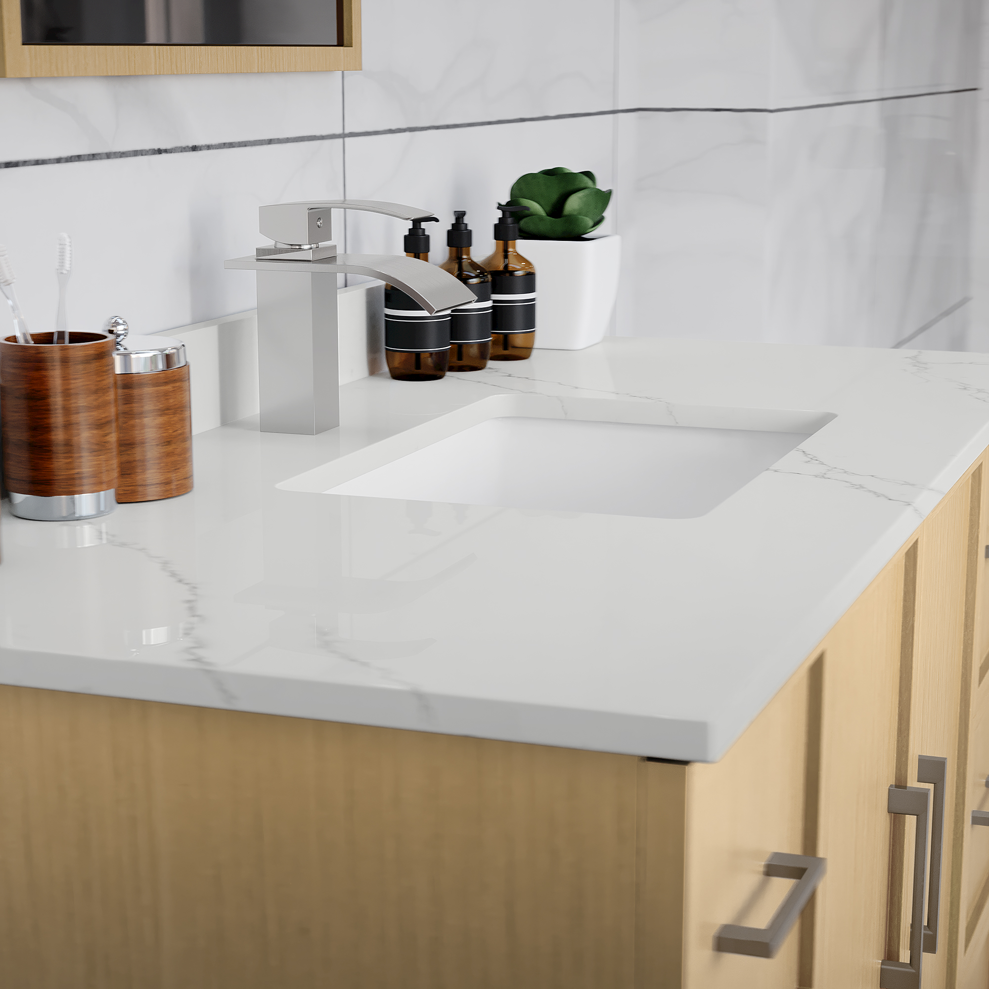 This transitional bathroom vanity exudes sleek sophistication with its clean lines and minimalist slim shaker design. The Elan vanity is crafted from high-quality materials like solid wood and plywood, with counters in multiple material options. Quartz and cultured stone counters include a back-and side-splash. Finished painted or in rift-cut white oak veneer, it seamlessly combines beauty and real-life usefulness. Its integrated, soft-closing drawers (featuring 3D adjustable glides) and doors offer ample storage space for toiletries, towels, and other essentials, keeping the space clutter-free. The sleek, angular hardware contributes to the overall aesthetic, creating a stylish focal point in the bathroom. Elevate your bathroom haven without compromising form or function.