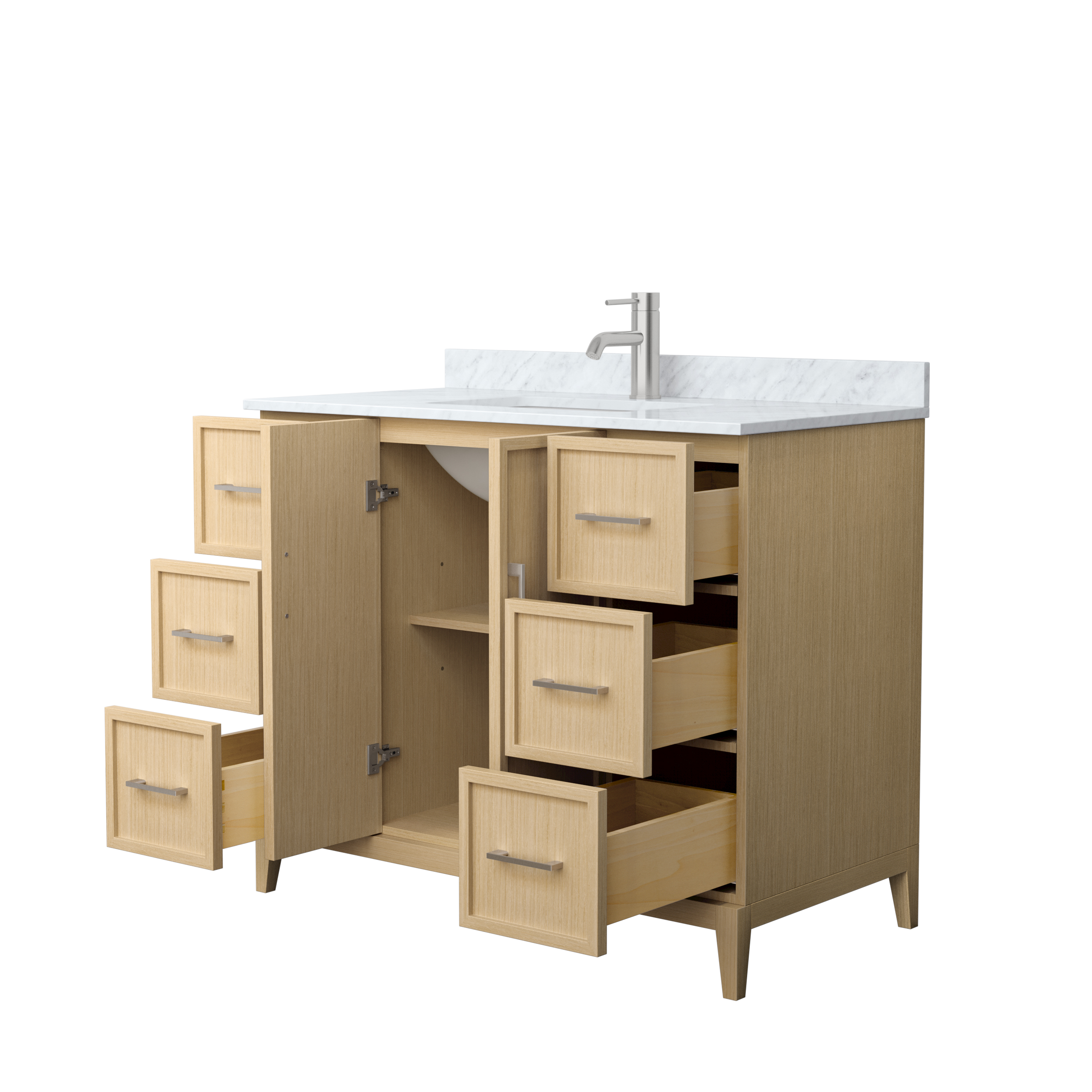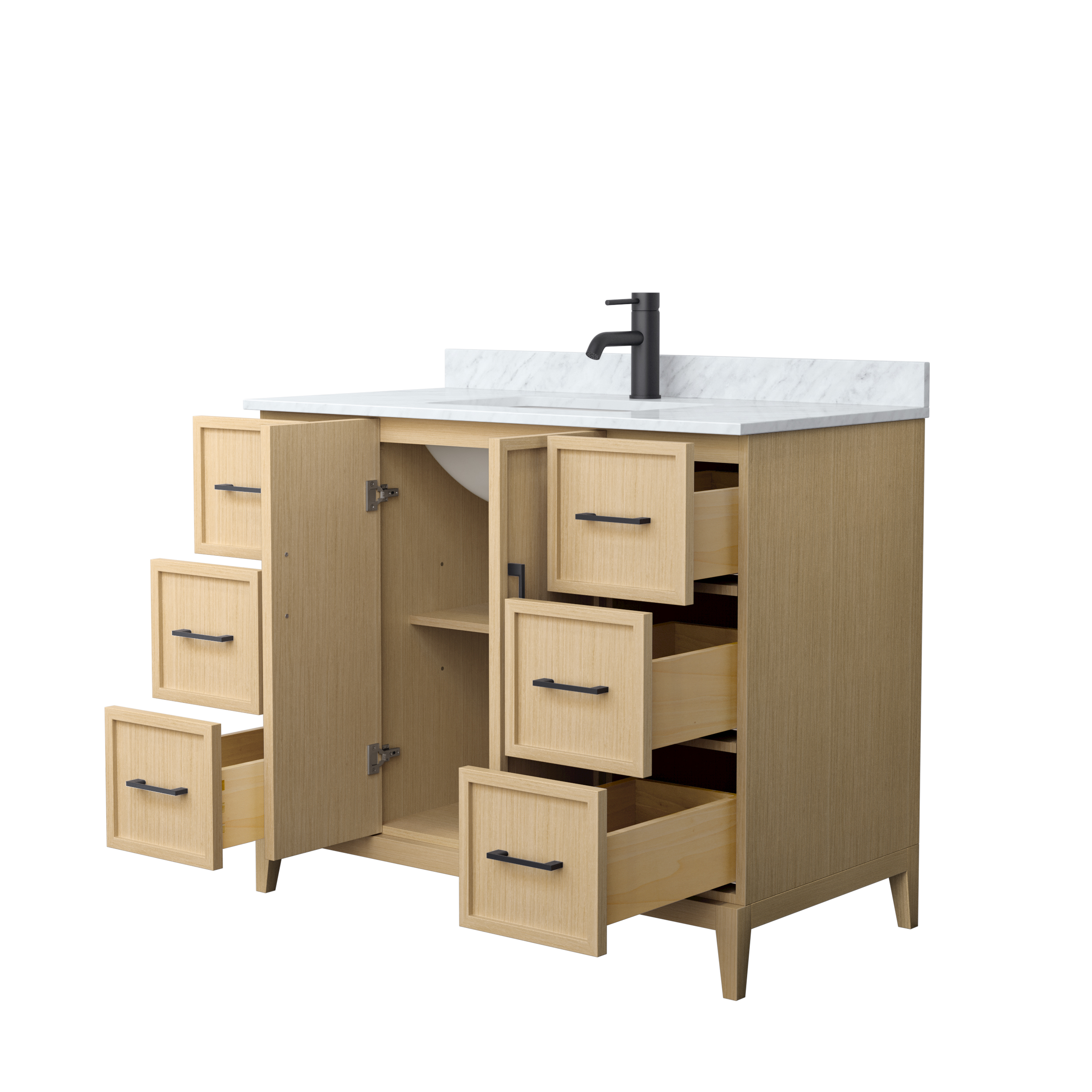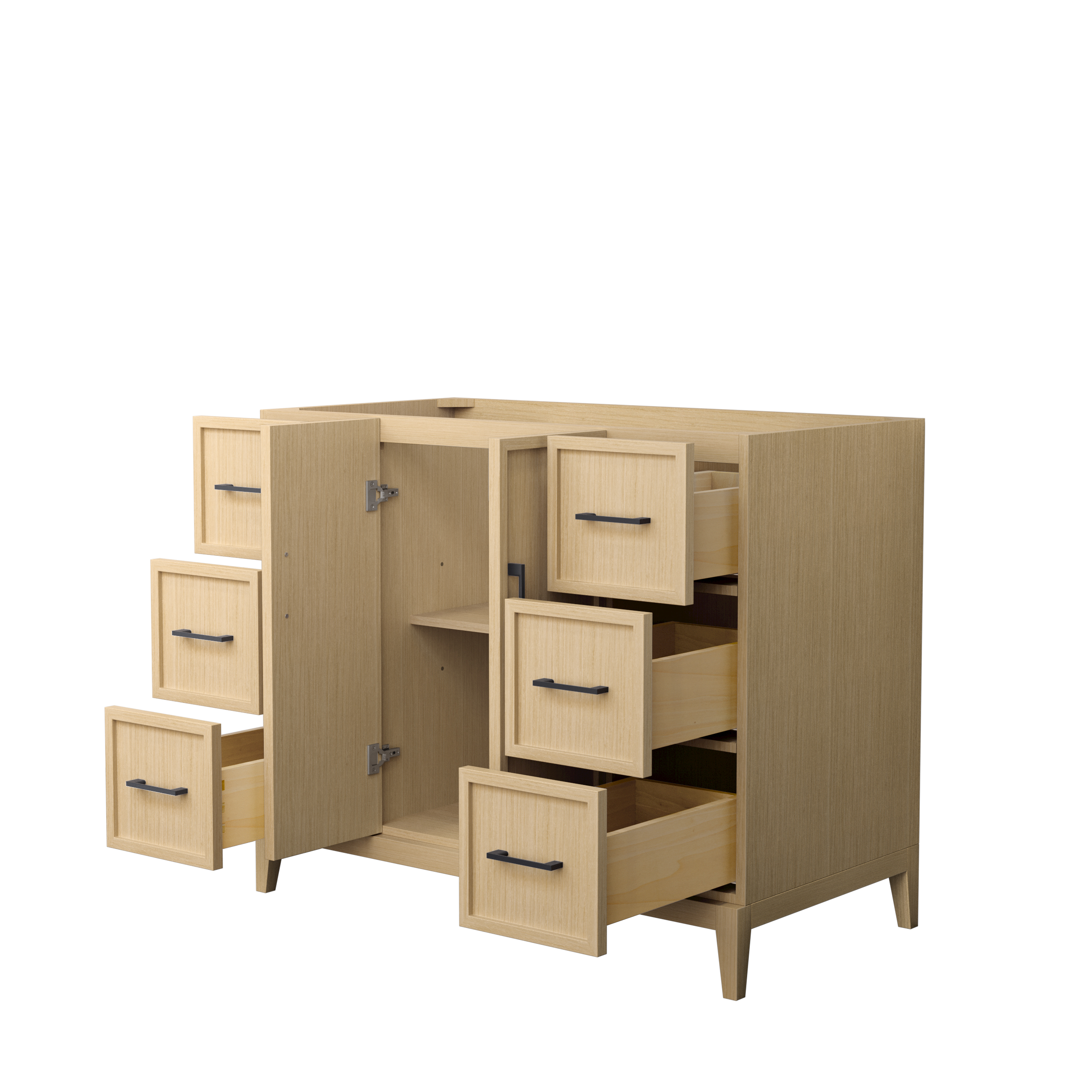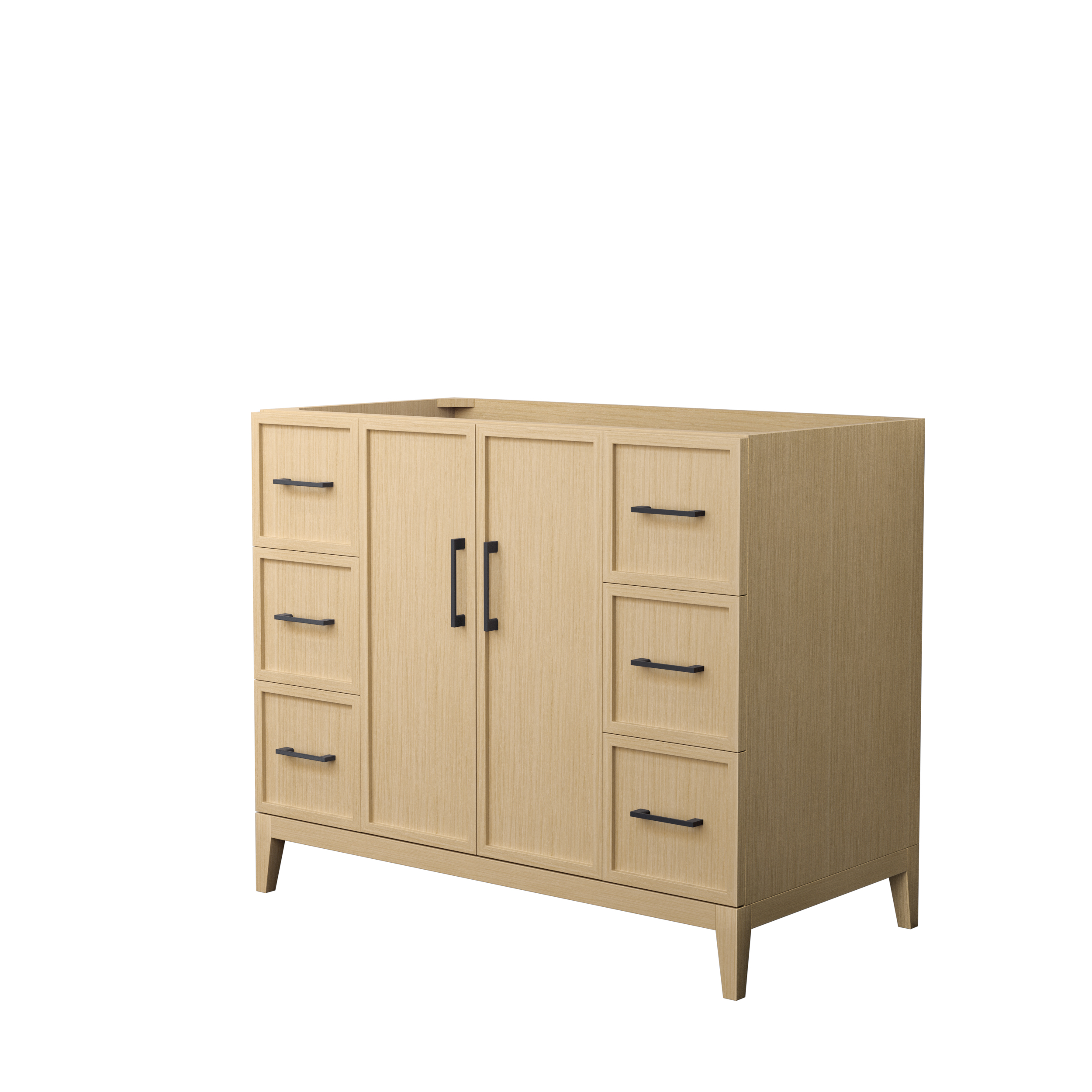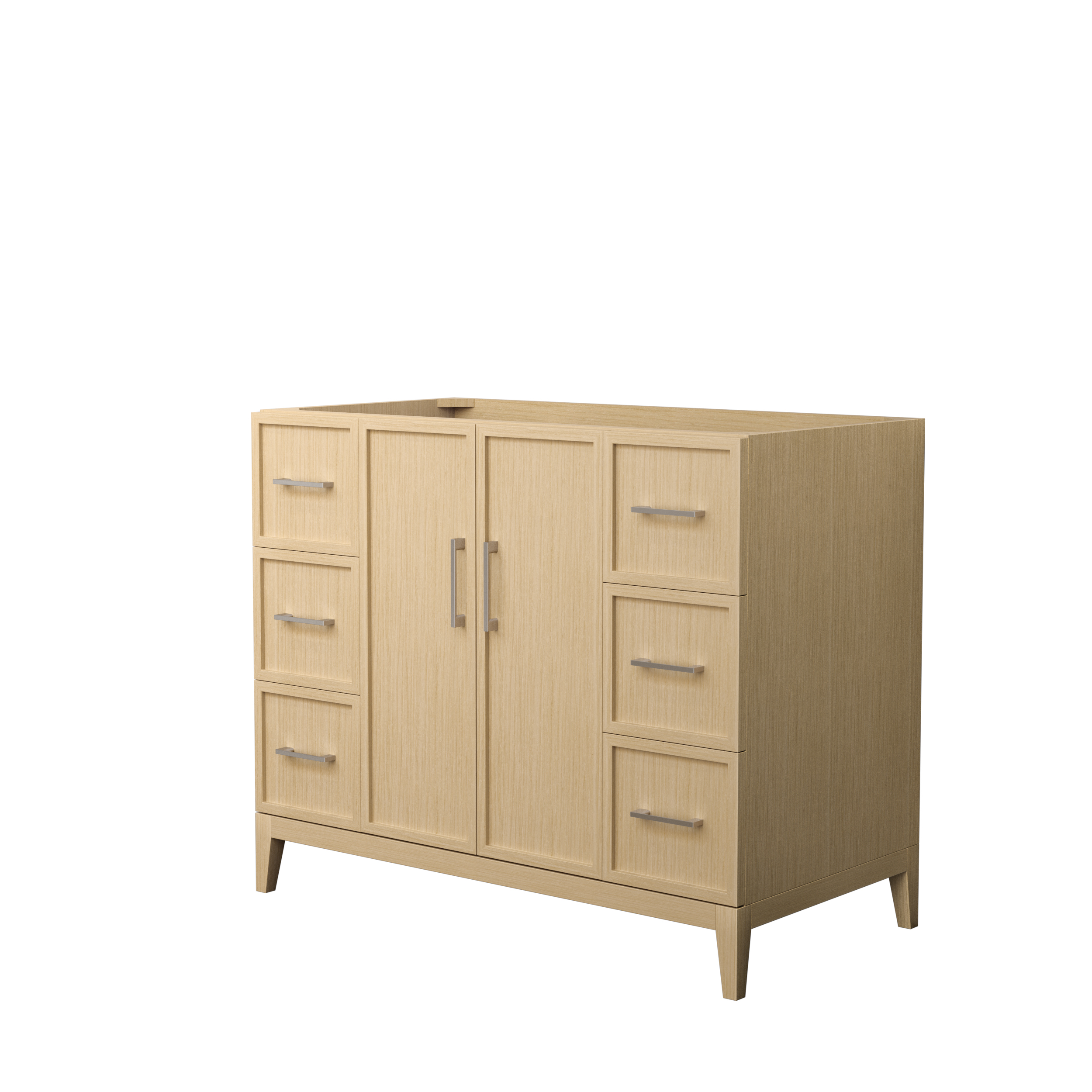This transitional bathroom vanity exudes sleek sophistication with its clean lines and minimalist slim shaker design. The Elan vanity is crafted from high-quality materials like solid wood and plywood, with counters in multiple material options. Quartz and cultured stone counters include a back-and side-splash. Finished painted or in rift-cut white oak veneer, it seamlessly combines beauty and real-life usefulness. Its integrated, soft-closing drawers (featuring 3D adjustable glides) and doors offer ample storage space for toiletries, towels, and other essentials, keeping the space clutter-free. The sleek, angular hardware contributes to the overall aesthetic, creating a stylish focal point in the bathroom. Elevate your bathroom haven without compromising form or function.