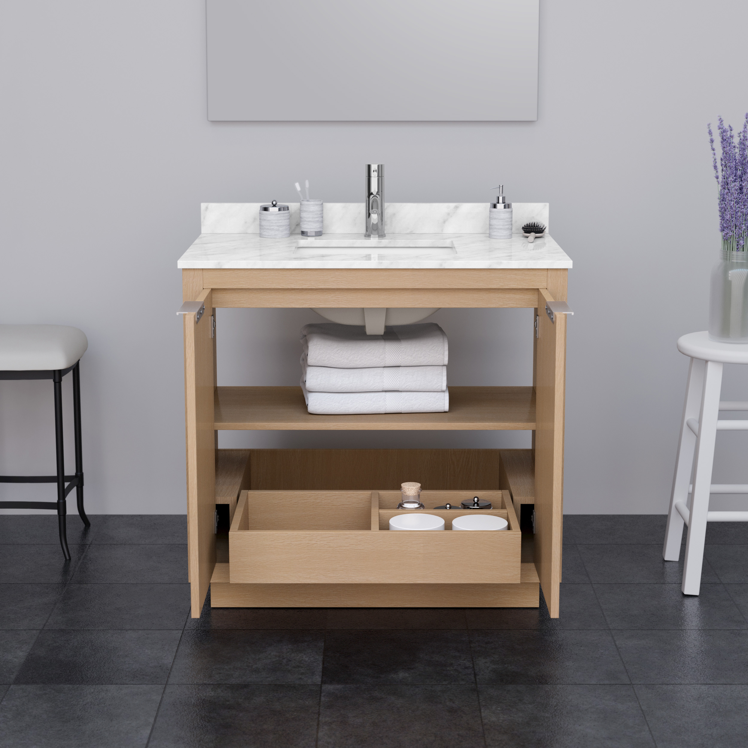 This modern classic is sheer sophistication, with its elegant lines and eye-catching finishes making a bold centerpiece to your bathroom. The Maroni freestanding vanity is manufactured in quality hardwood and veneer to the exacting standards you've come to expect from the Wyndham Collection. Conveniently designed with plenty of storage space and an integrated toe-kick to keep things clean and tidy underneath. Available with your choice of beautiful Quartz, Carrara Marble, or Cultured Marble counter.