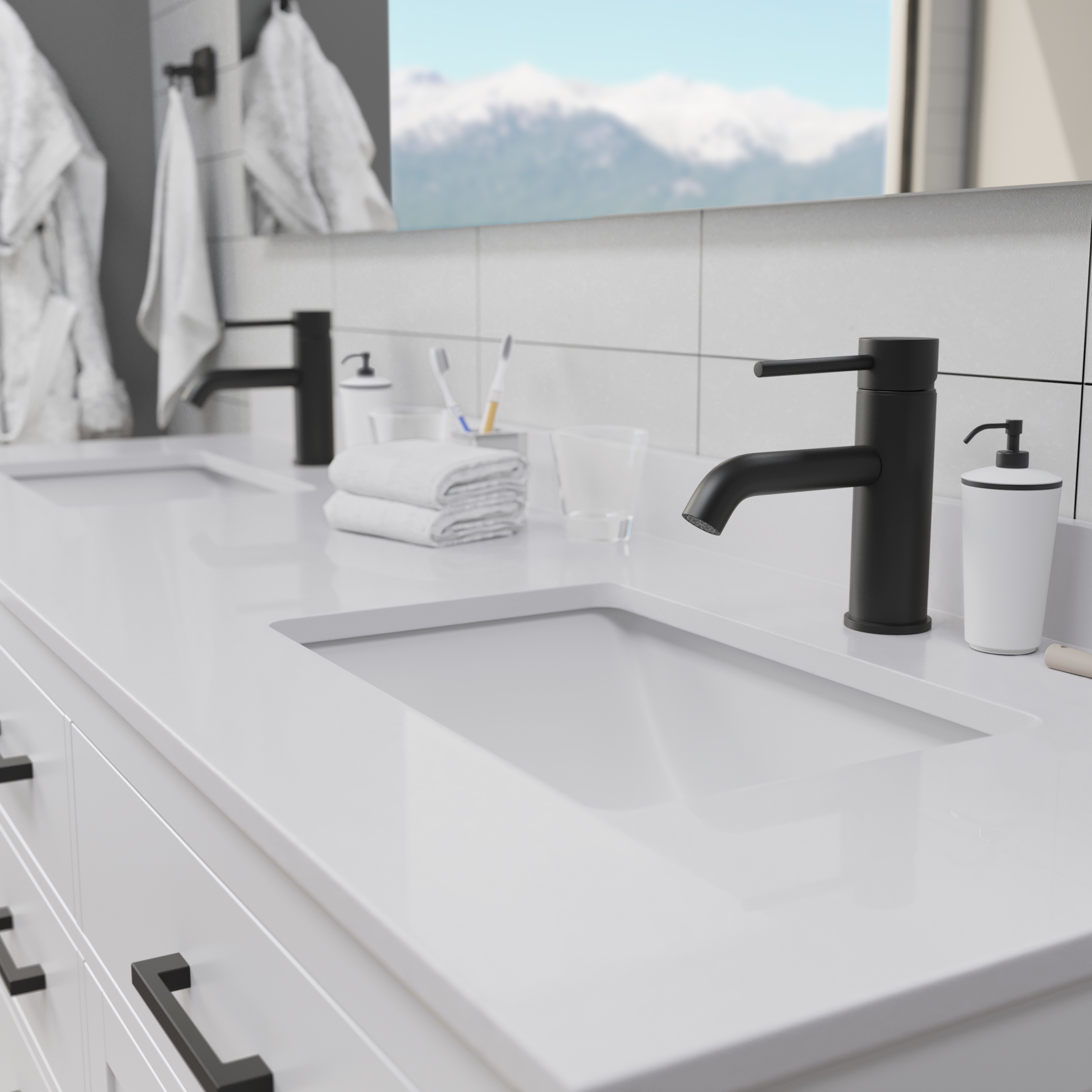 • Quartz Countertop available in Single or 3-hole faucet mounts