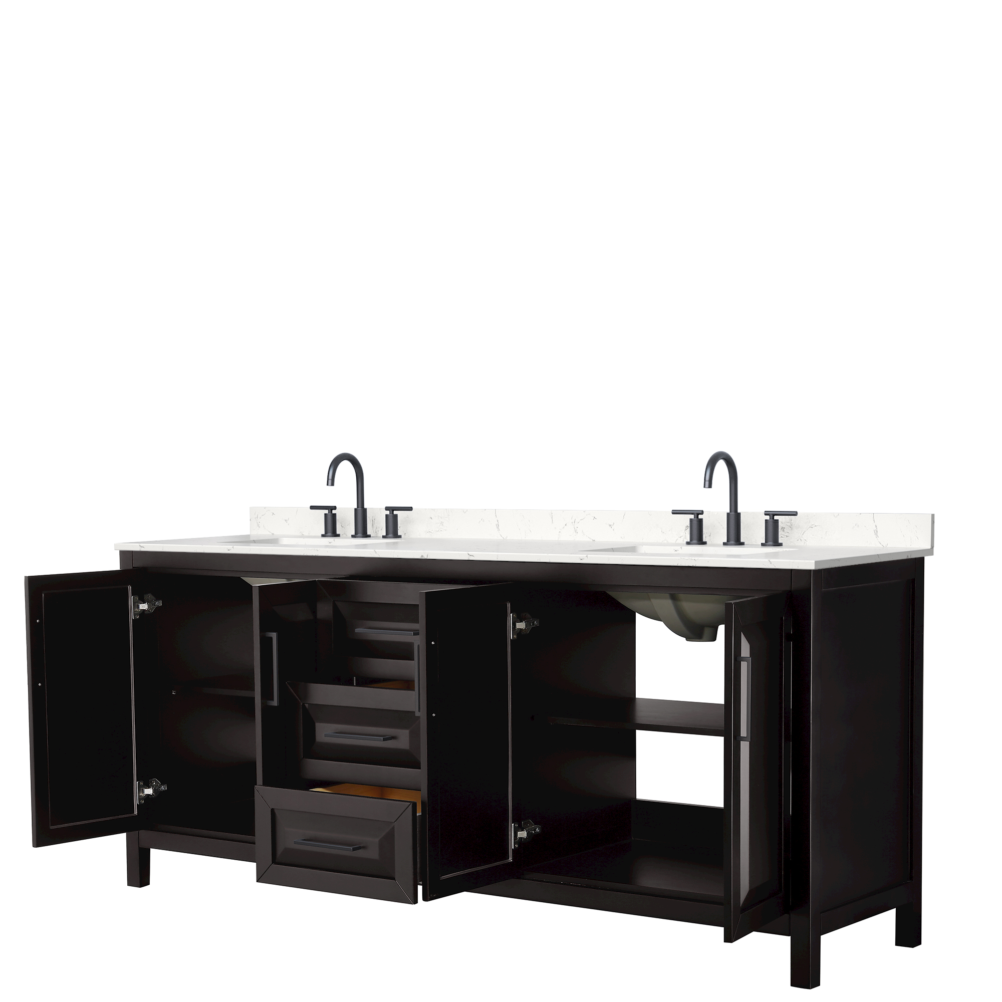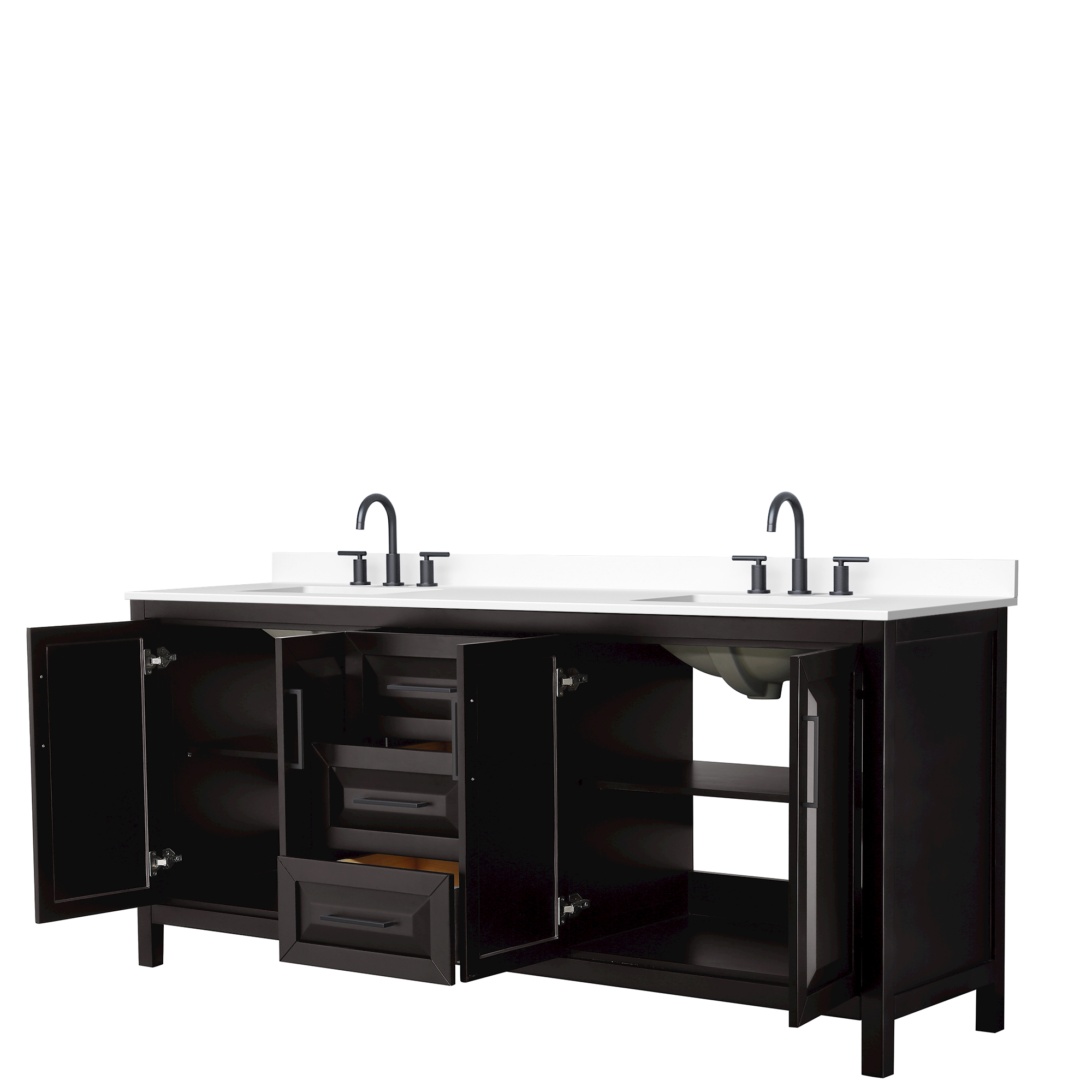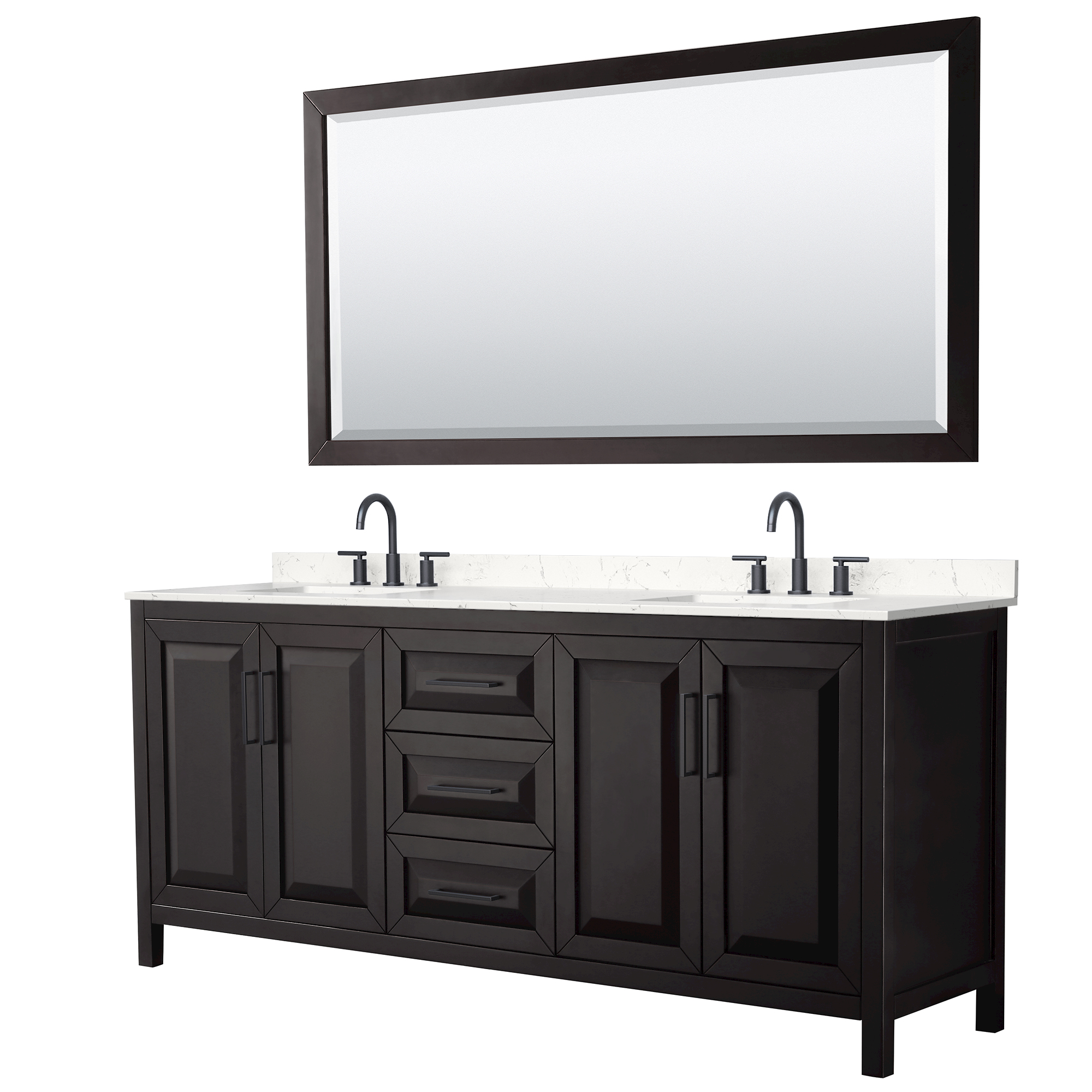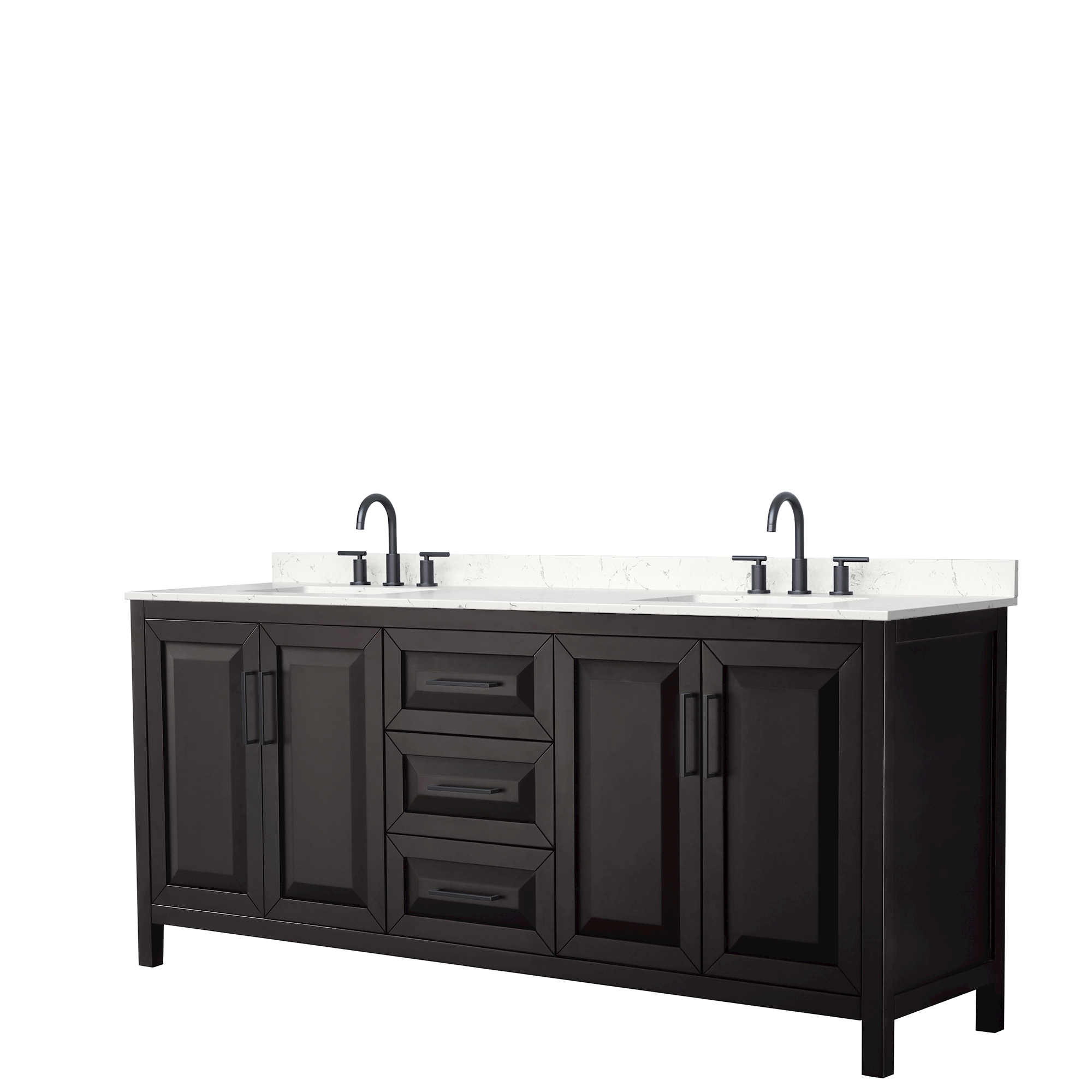 The beautiful Daria collection vanities stand out in any bathroom with strong, clean lines, raised panels and elegant counters with square sinks. There's plenty of cabinet space, the fully extending drawers are dovetail construction, and matte black or polished chrome finish detailing completes the look. Daria vanities deftly combine the function of today with a nod to the elegance of the past. It's the new modern - classic styling with a contemporary twist.