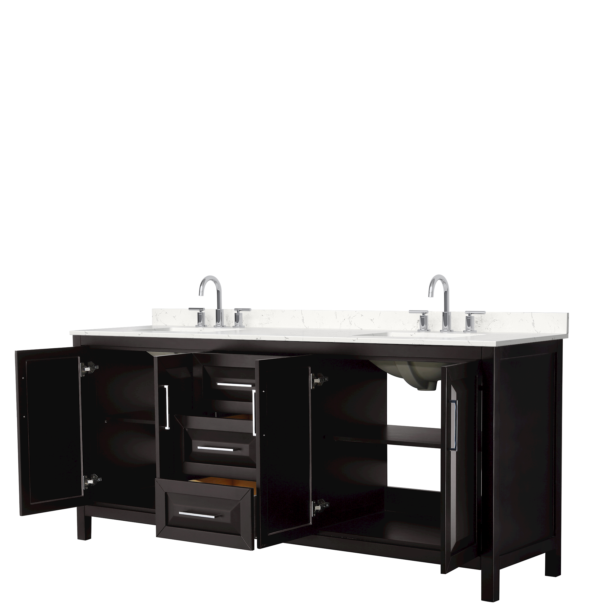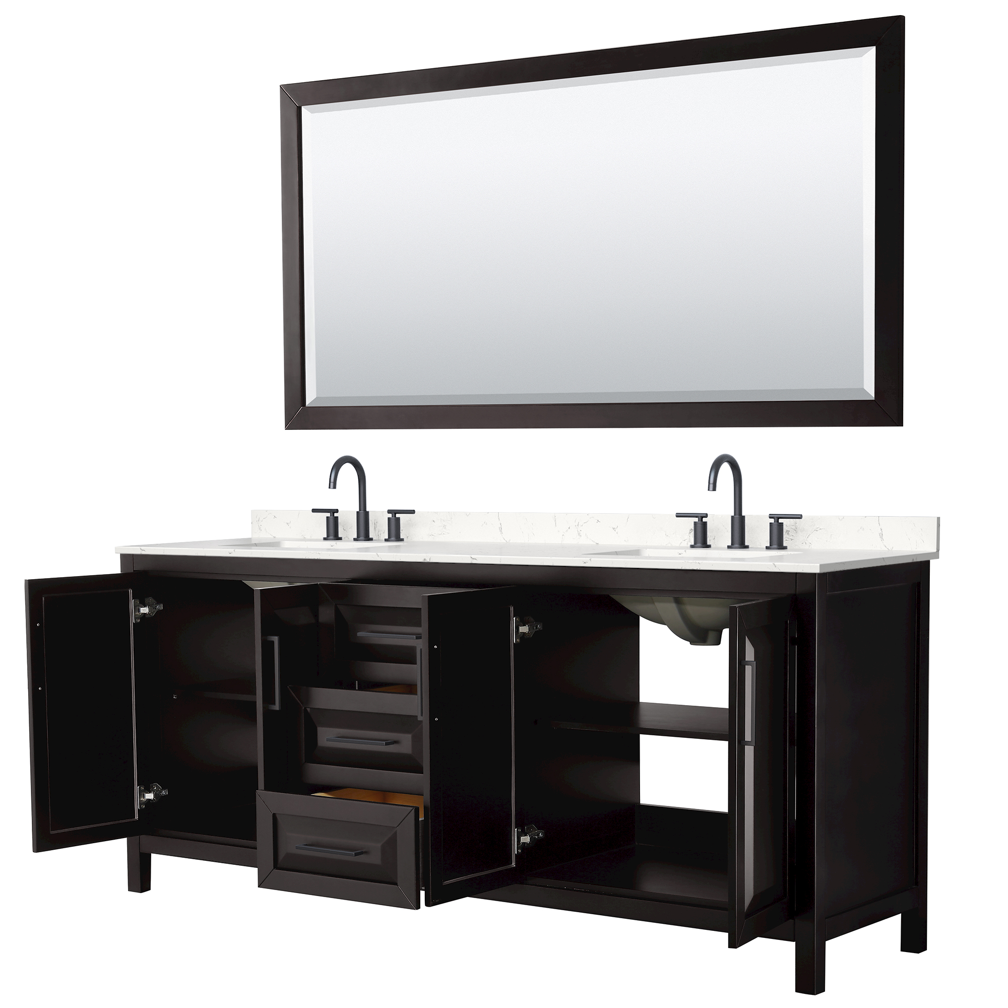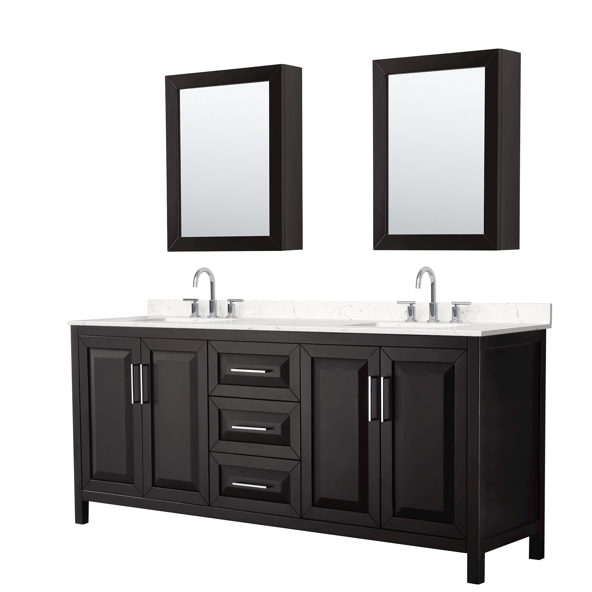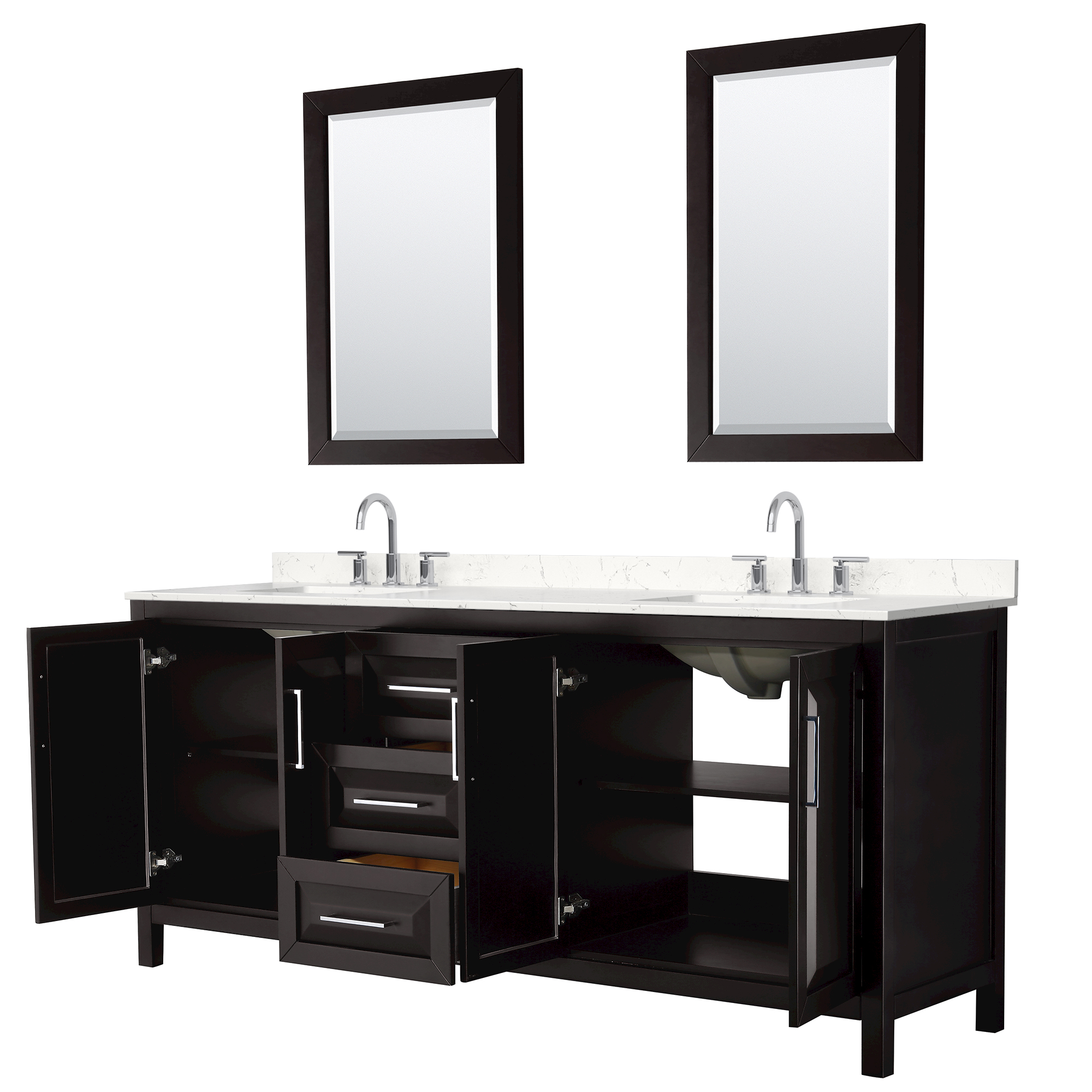 The beautiful Daria collection vanities stand out in any bathroom with strong, clean lines, raised panels and elegant counters with square sinks. There's plenty of cabinet space, the fully extending drawers are dovetail construction, and matte black or polished chrome finish detailing completes the look. Daria vanities deftly combine the function of today with a nod to the elegance of the past. It's the new modern - classic styling with a contemporary twist.
