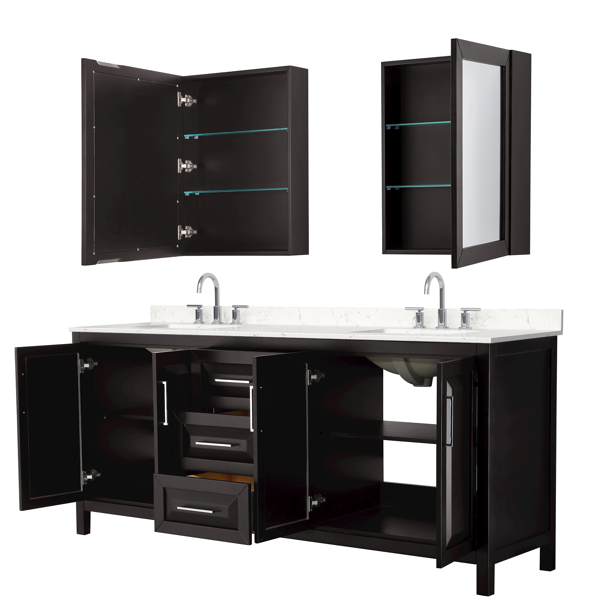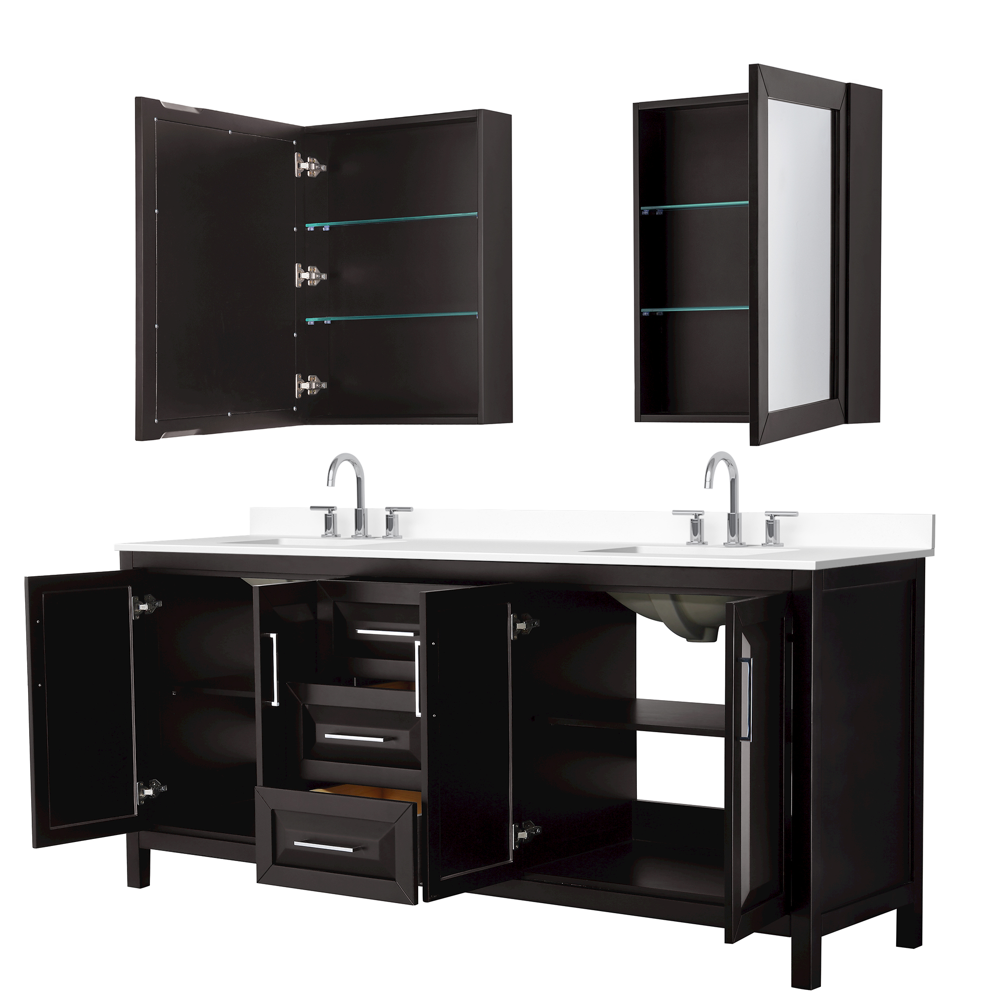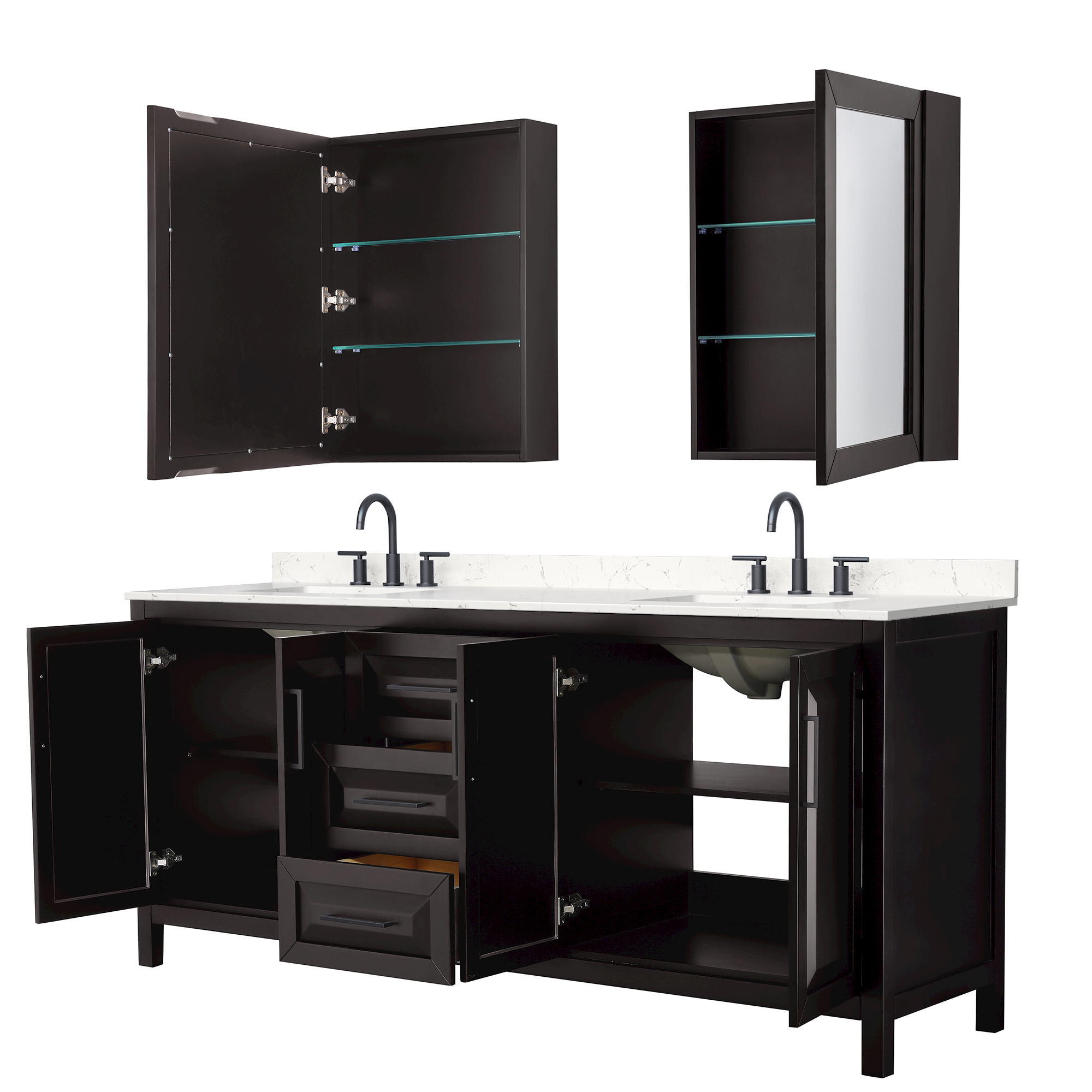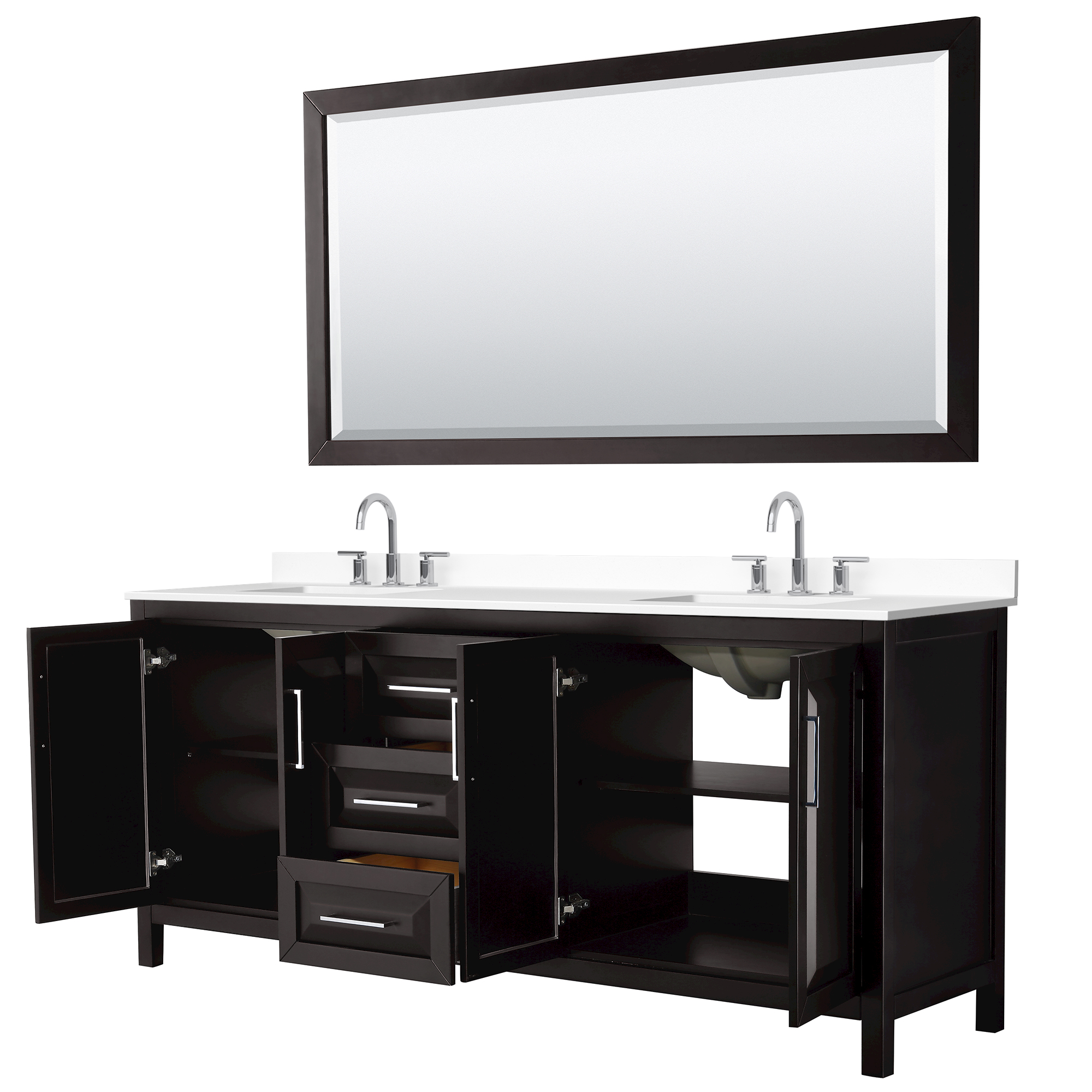 The beautiful Daria collection vanities stand out in any bathroom with strong, clean lines, raised panels and elegant counters with square sinks. There's plenty of cabinet space, the fully extending drawers are dovetail construction, and matte black or polished chrome finish detailing completes the look. Daria vanities deftly combine the function of today with a nod to the elegance of the past. It's the new modern - classic styling with a contemporary twist.