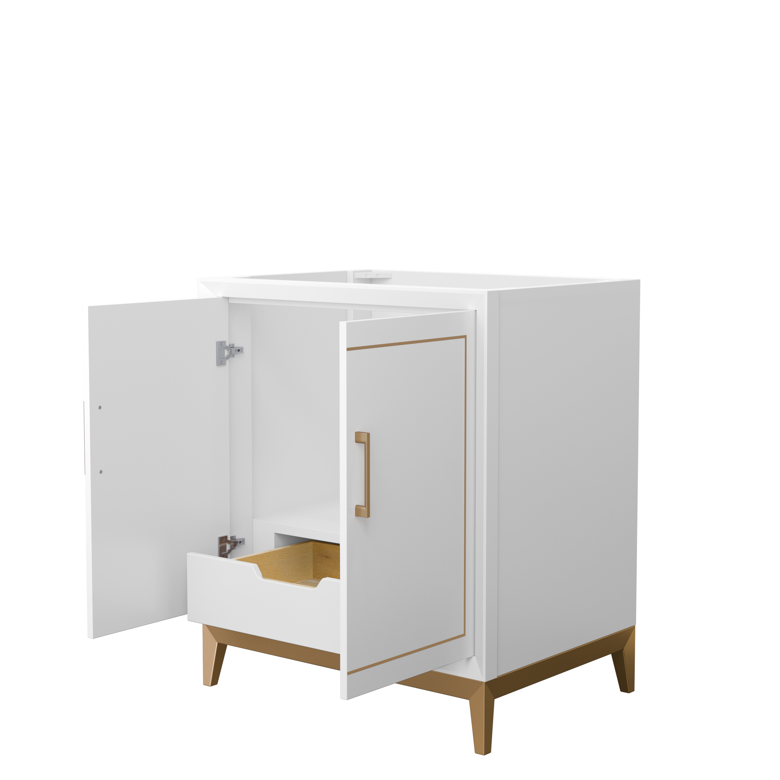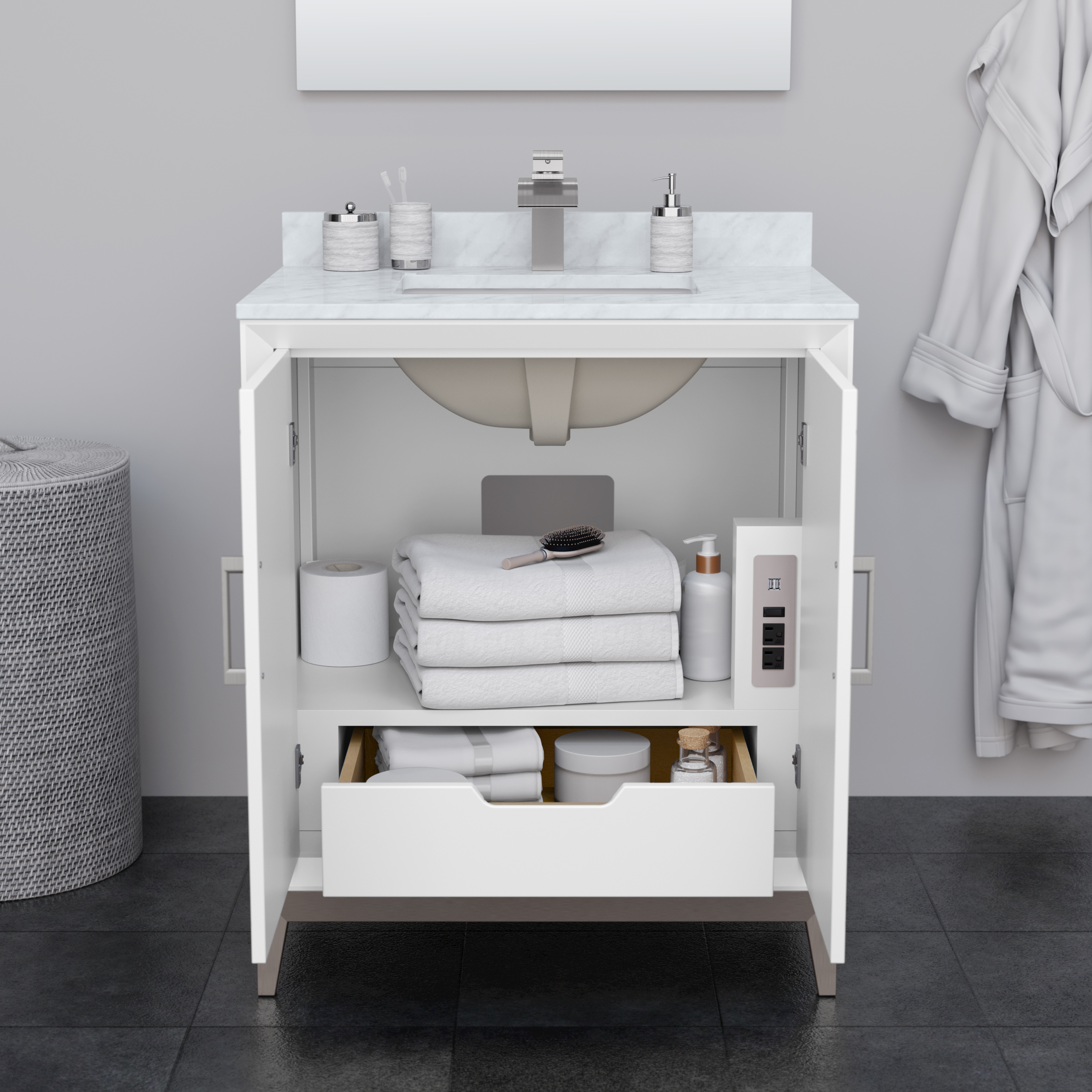 Classic luxurious elegance with clean and contemporary styling are the hallmarks of the beautiful Marlena vanity collection, perfect for most home decors. Offered in a range of sizes, cabinet colors and metal trim colors, you're sure to find the perfect fit. There's plenty of storage space, soft-close doors and drawers, internal drawers and the convenience of a 110v outlet and USB charger just inside the door. Offered with available Quartz, Carrara Marble, or Cultured Stone counters.