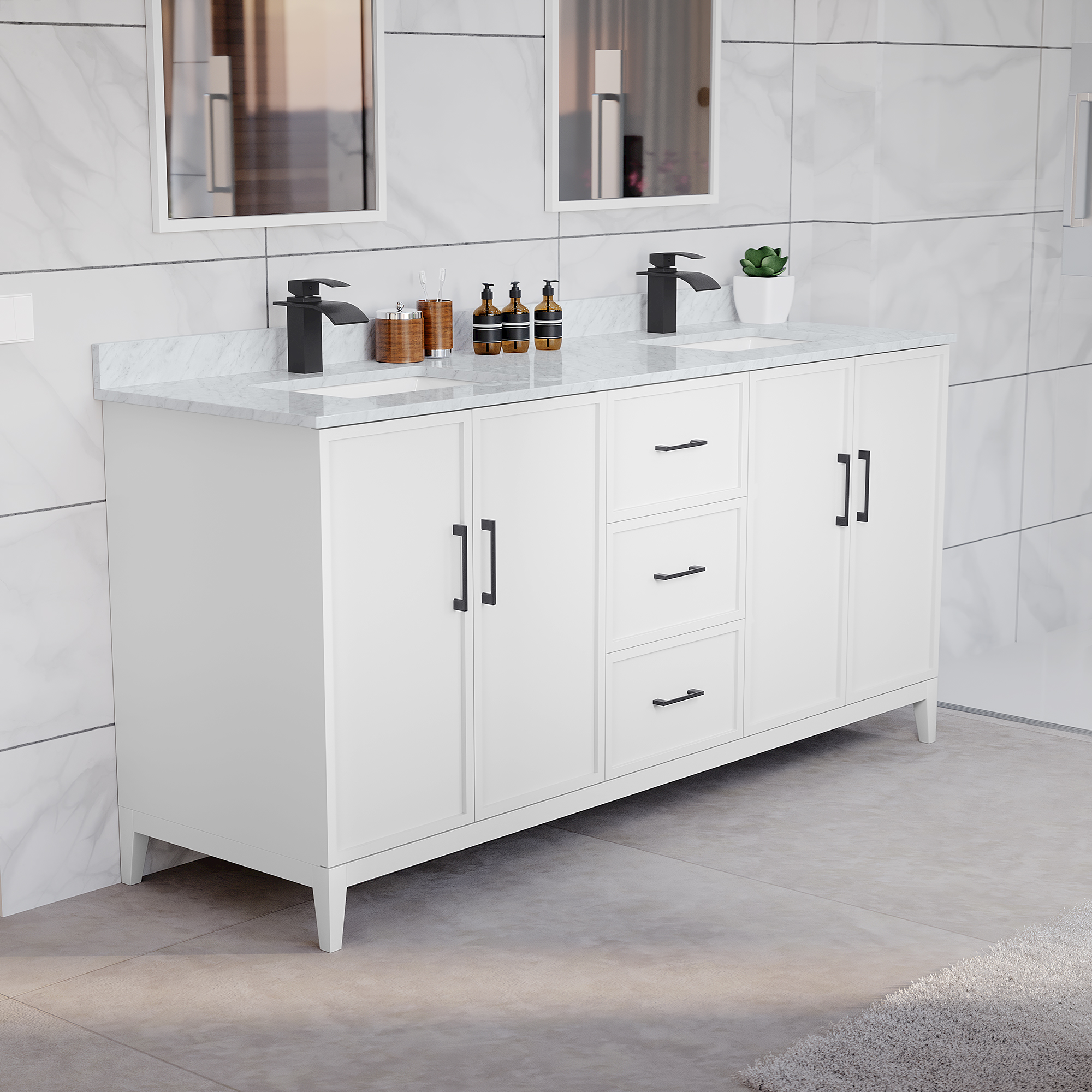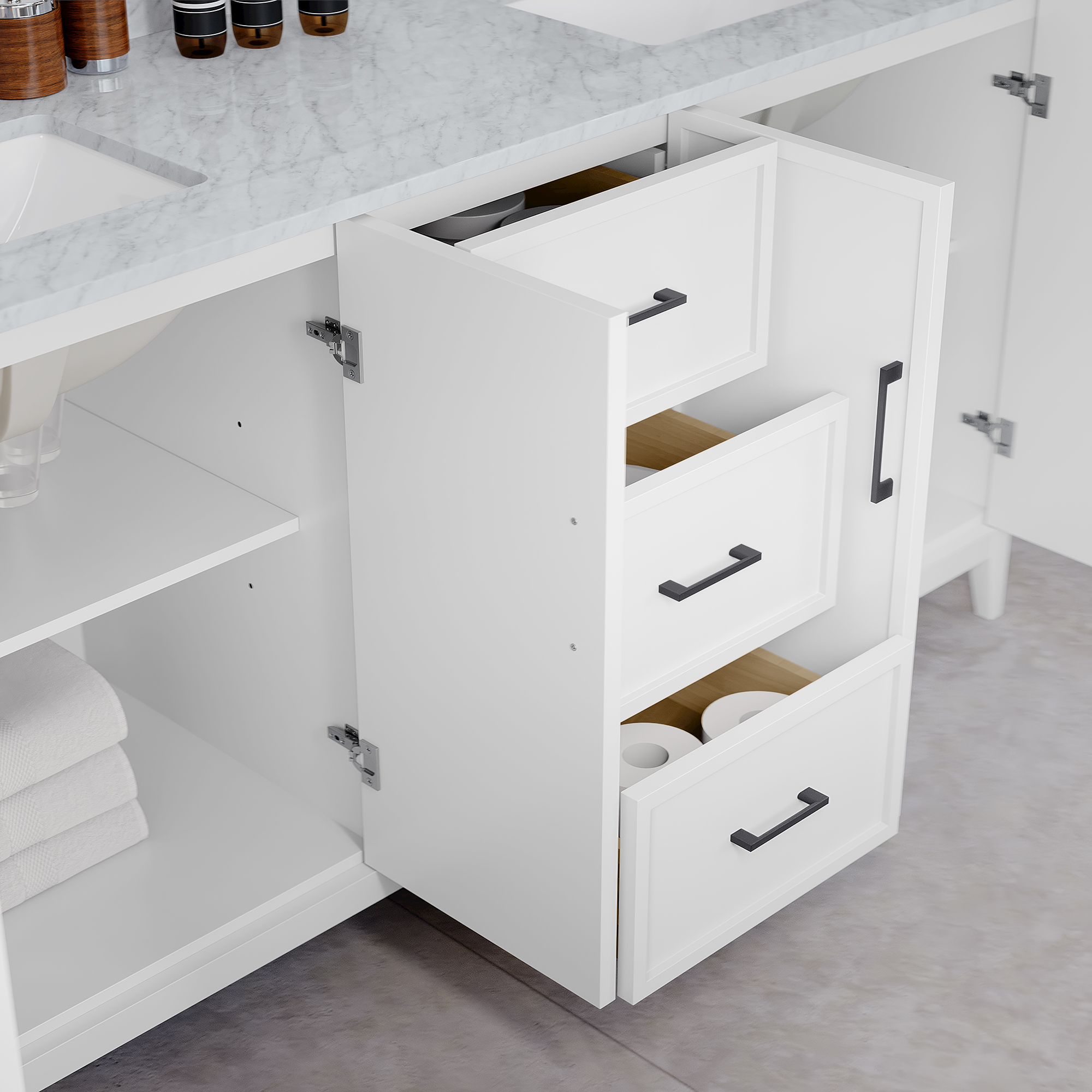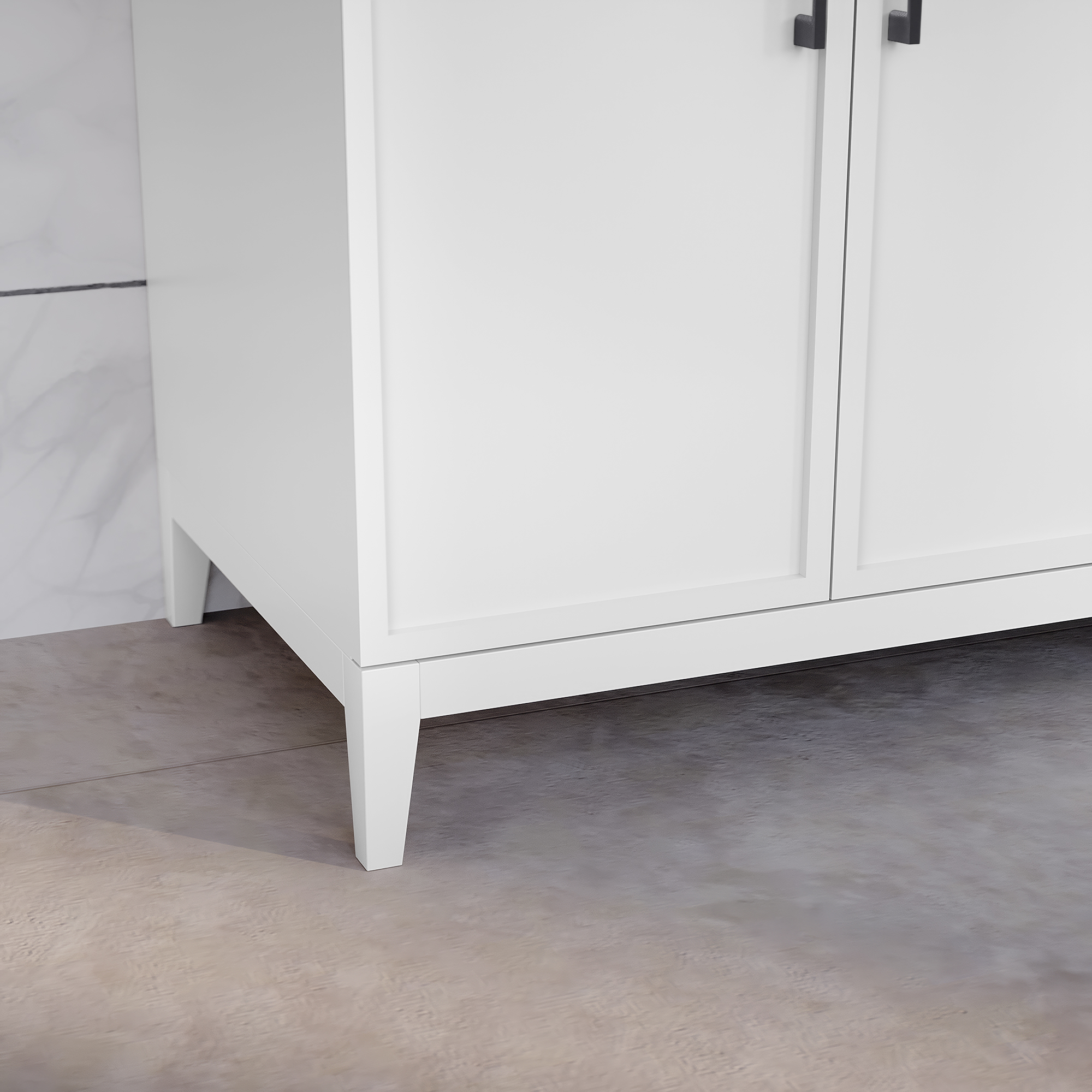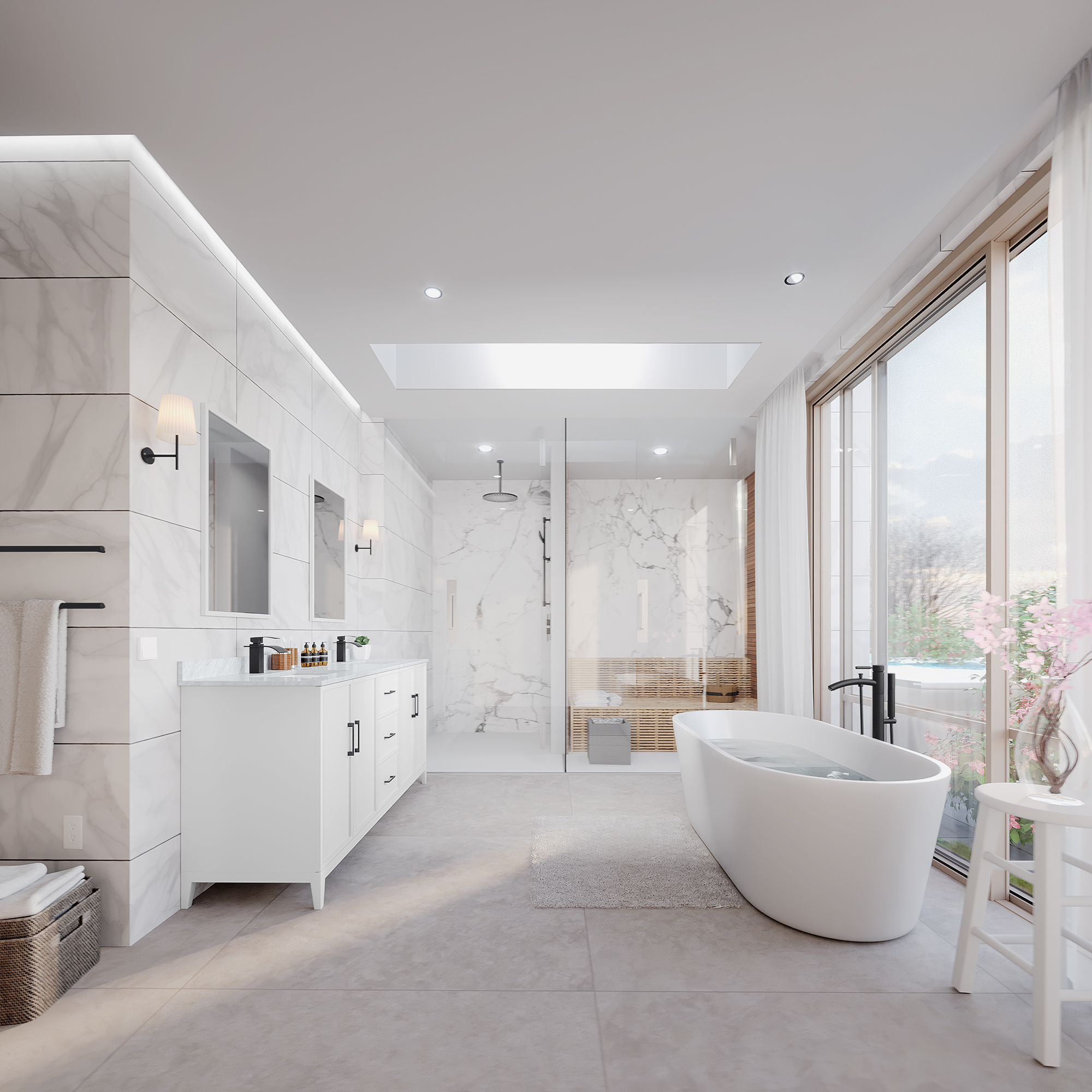This transitional bathroom vanity exudes sleek sophistication with its clean lines and minimalist slim shaker design. The Elan vanity is crafted from high-quality materials like solid wood and plywood, with counters in multiple material options. Quartz and cultured stone counters include a back-and side-splash. Finished painted or in rift-cut white oak veneer, it seamlessly combines beauty and real-life usefulness. Its integrated, soft-closing drawers (featuring 3D adjustable glides) and doors offer ample storage space for toiletries, towels, and other essentials, keeping the space clutter-free. The sleek, angular hardware contributes to the overall aesthetic, creating a stylish focal point in the bathroom. Elevate your bathroom haven without compromising form or function.