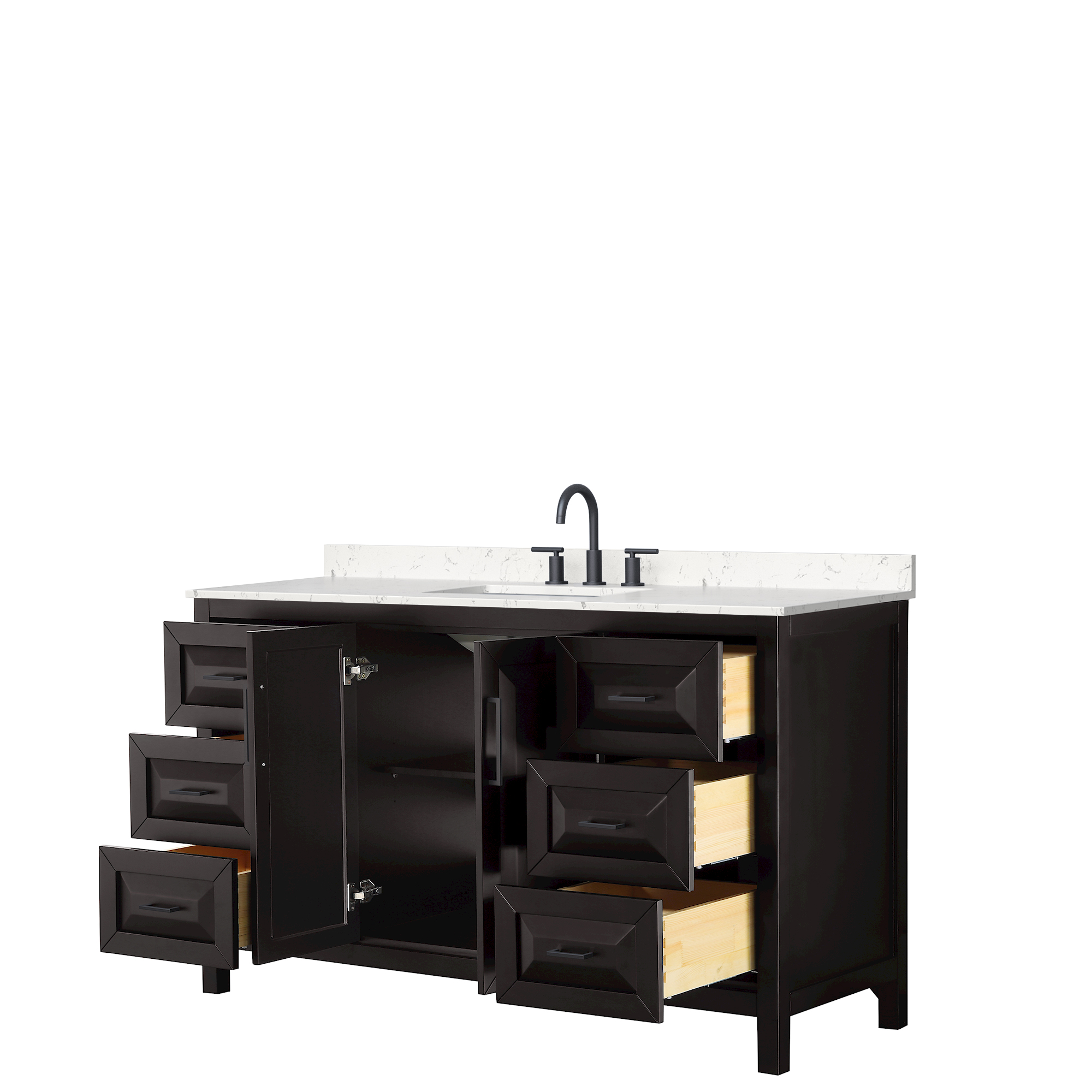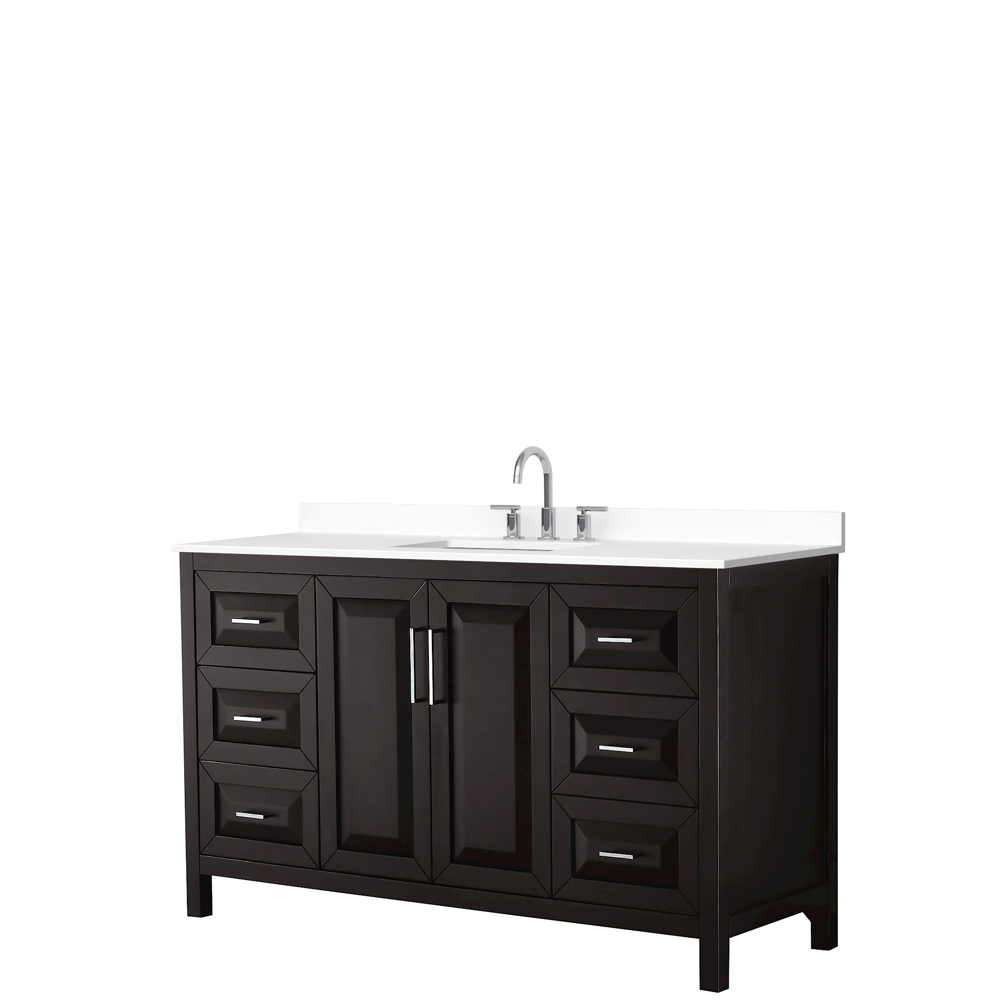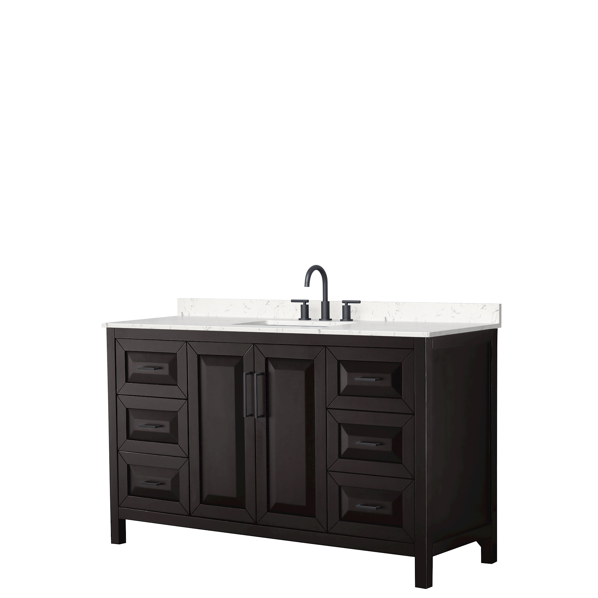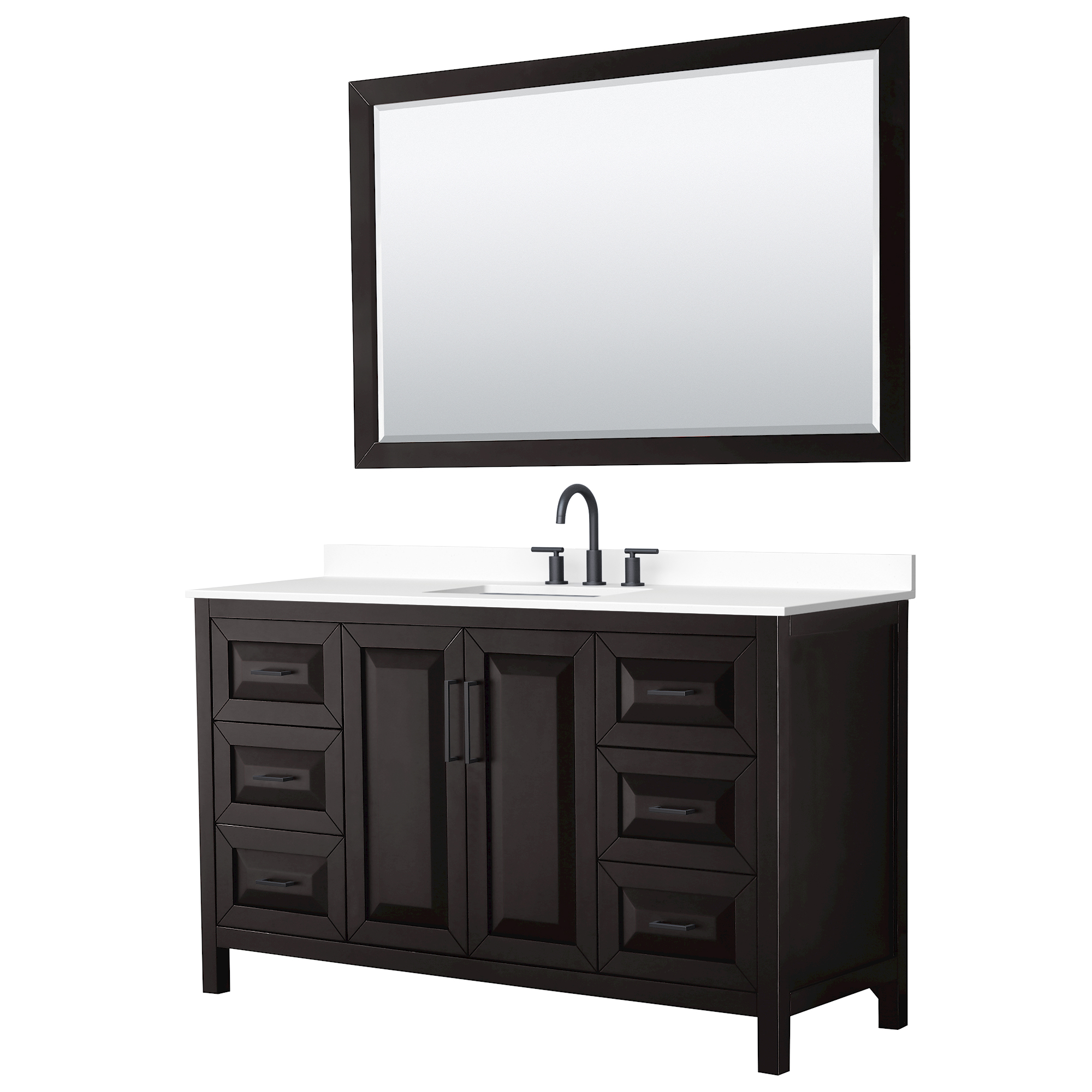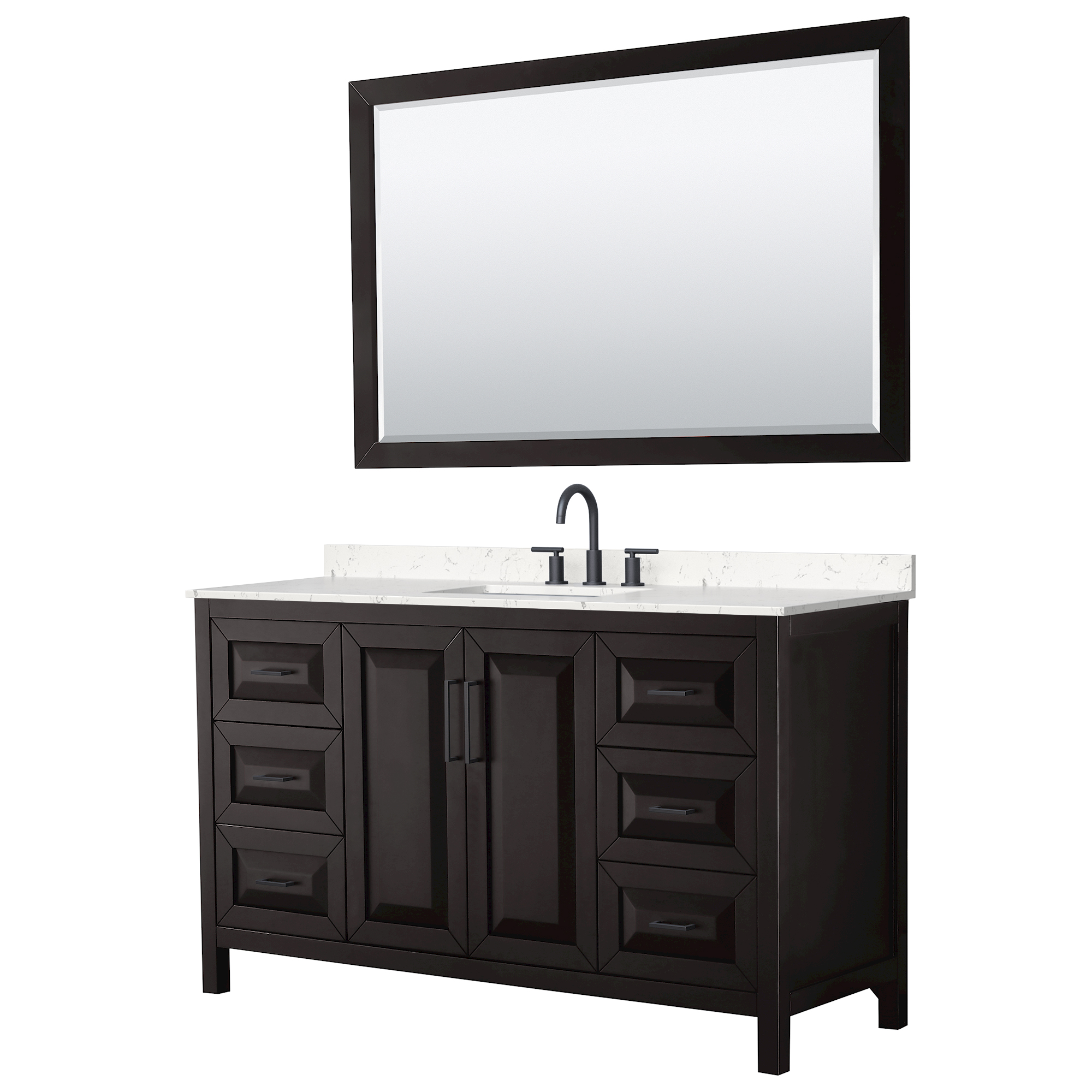 The beautiful Daria collection vanities stand out in any bathroom with strong, clean lines, raised panels and elegant counters with square sinks. There's plenty of cabinet space, the fully extending drawers are dovetail construction, and matte black or polished chrome finish detailing completes the look. Daria vanities deftly combine the function of today with a nod to the elegance of the past. It's the new modern - classic styling with a contemporary twist.
