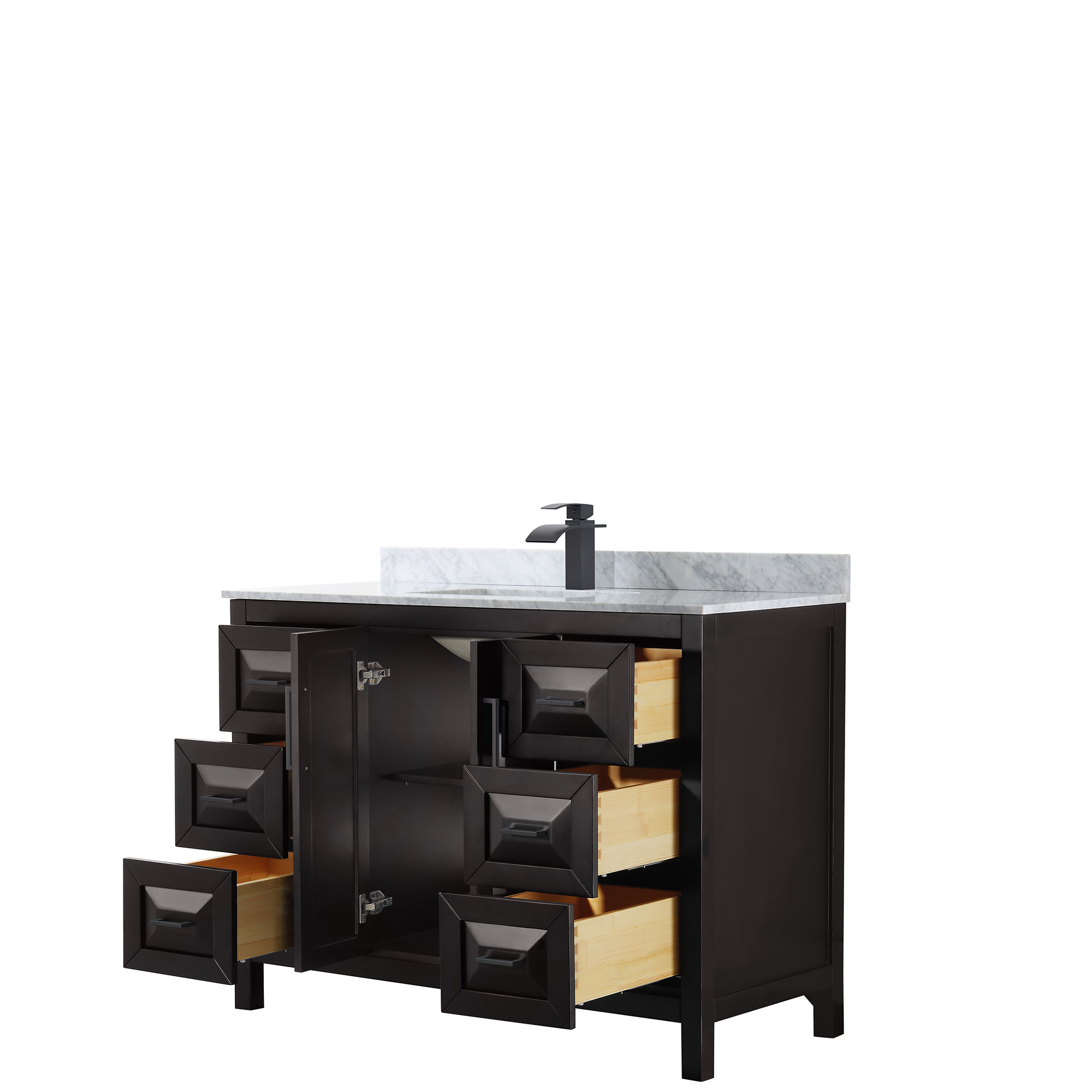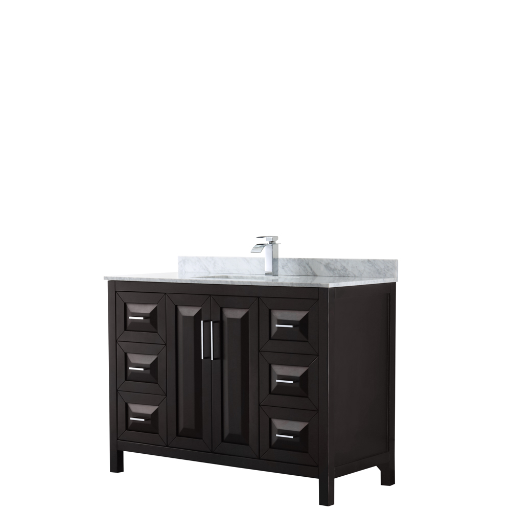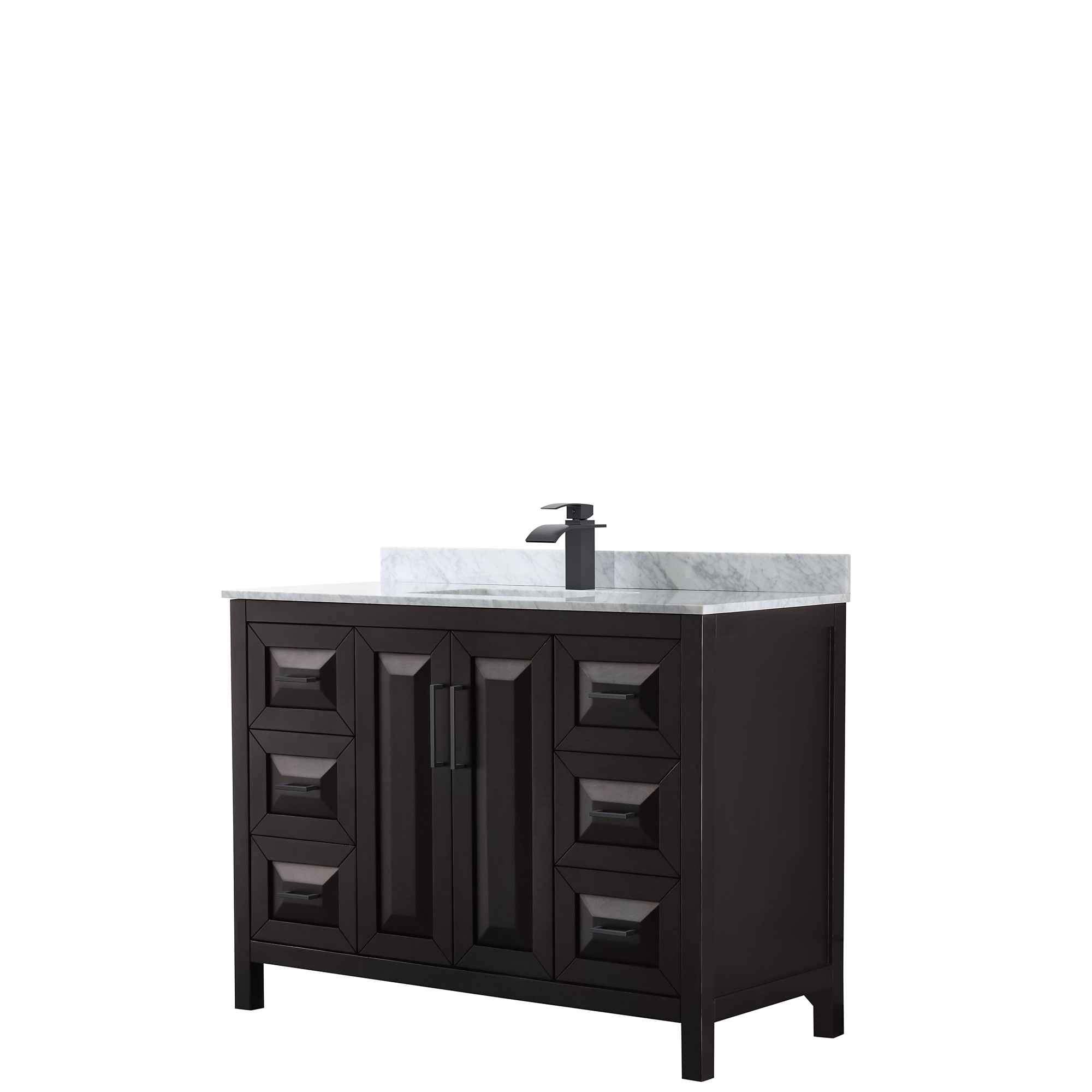 The beautiful Daria collection vanities stand out in any bathroom with strong, clean lines, raised panels and elegant counters with square sinks. There's plenty of cabinet space, the fully extending drawers are dovetail construction, and polished chrome or matte black detailing completes the look. Daria vanities deftly combine the function of today with a nod to the elegance of the past. It's the new modern - classic styling with a contemporary twist.