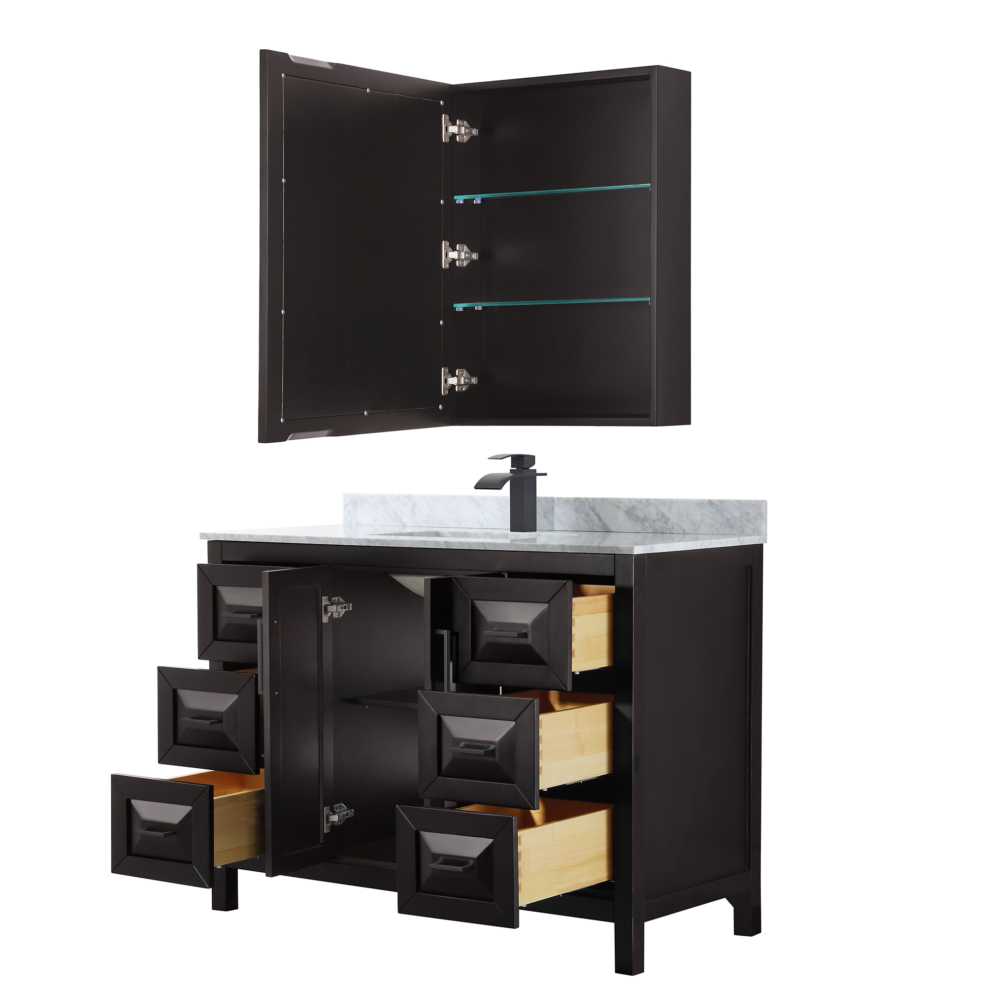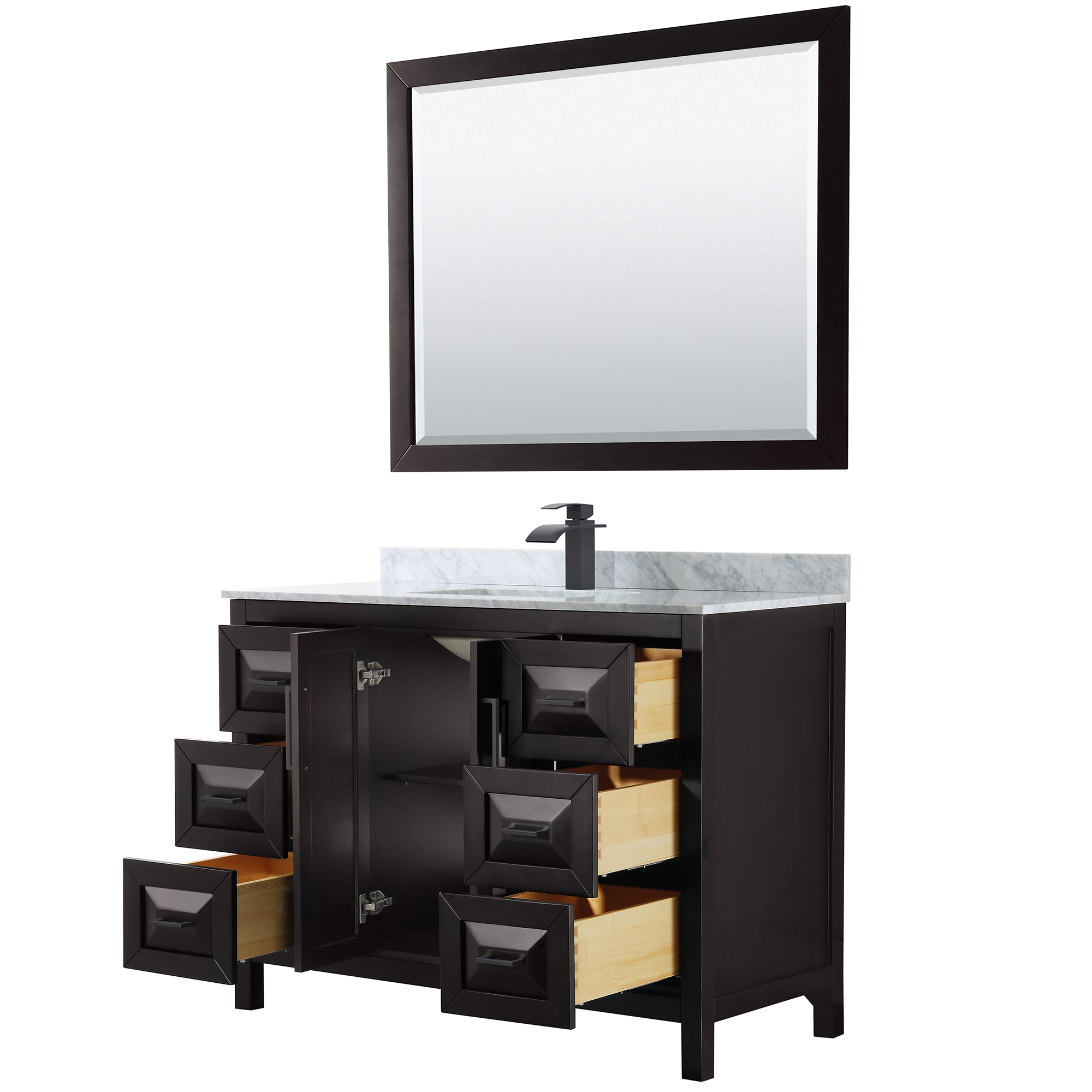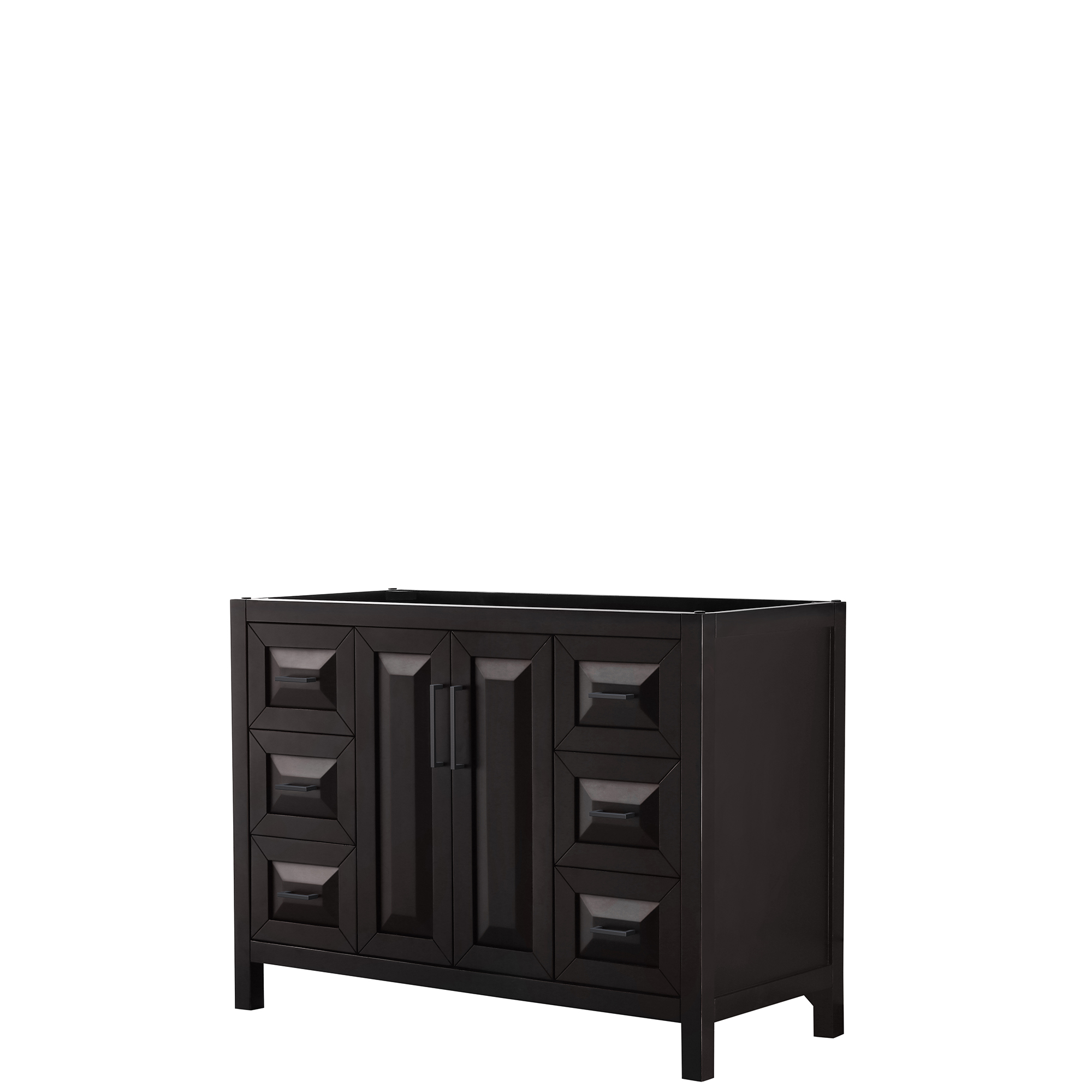 The beautiful Daria collection vanities stand out in any bathroom with strong, clean lines, raised panels and elegant counters with square sinks. There's plenty of cabinet space, the fully extending drawers are dovetail construction, and polished chrome or matte black detailing completes the look. Daria vanities deftly combine the function of today with a nod to the elegance of the past. It's the new modern - classic styling with a contemporary twist.