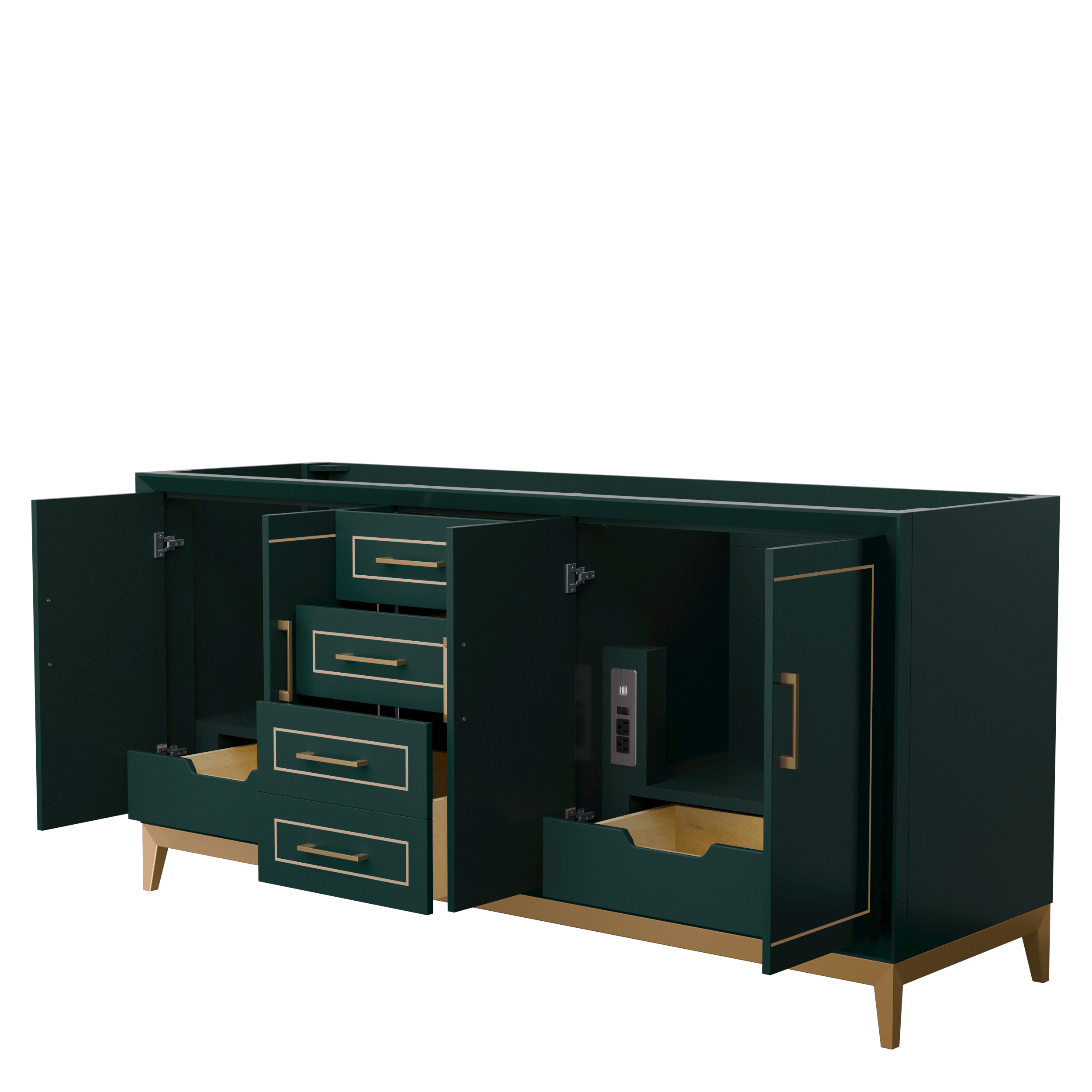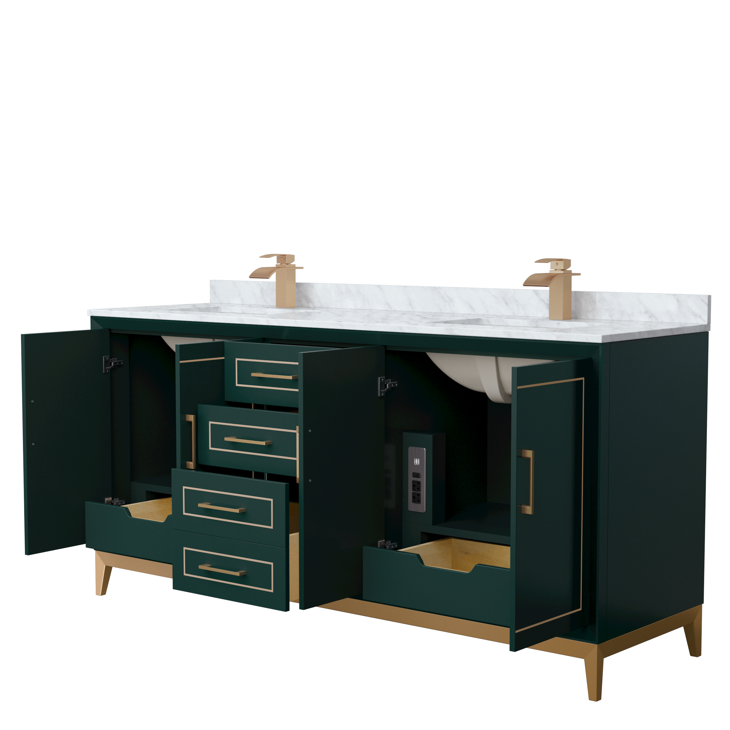 Classic luxurious elegance with clean and contemporary styling are the hallmarks of the beautiful Marlena vanity collection, perfect for most home decors. Offered in a range of sizes, cabinet colors and metal trim colors, you're sure to find the perfect fit. There's plenty of storage space, soft-close doors and drawers, internal drawers and the convenience of a 110v outlet and USB charger just inside the door. Offered with available Quartz, Carrara Marble, or Cultured Stone counters.