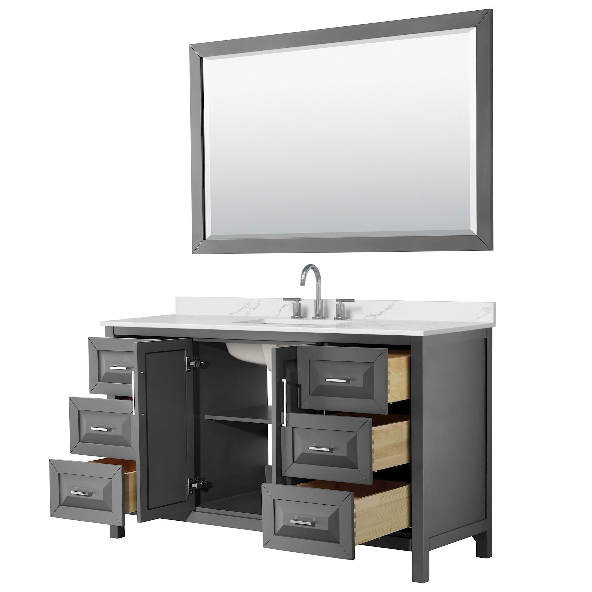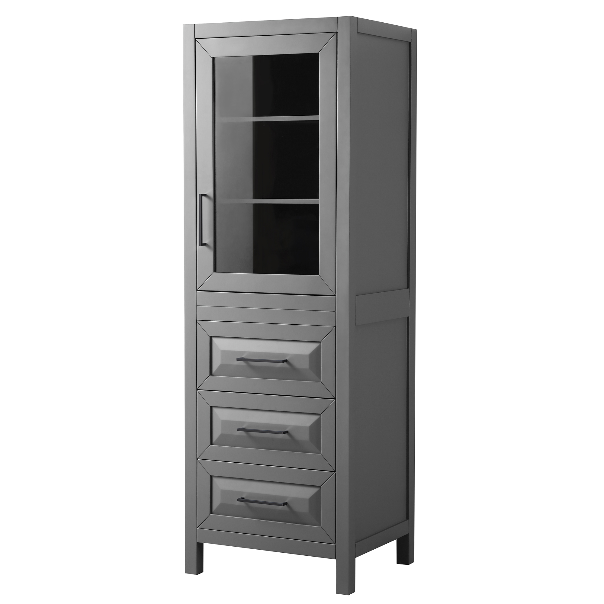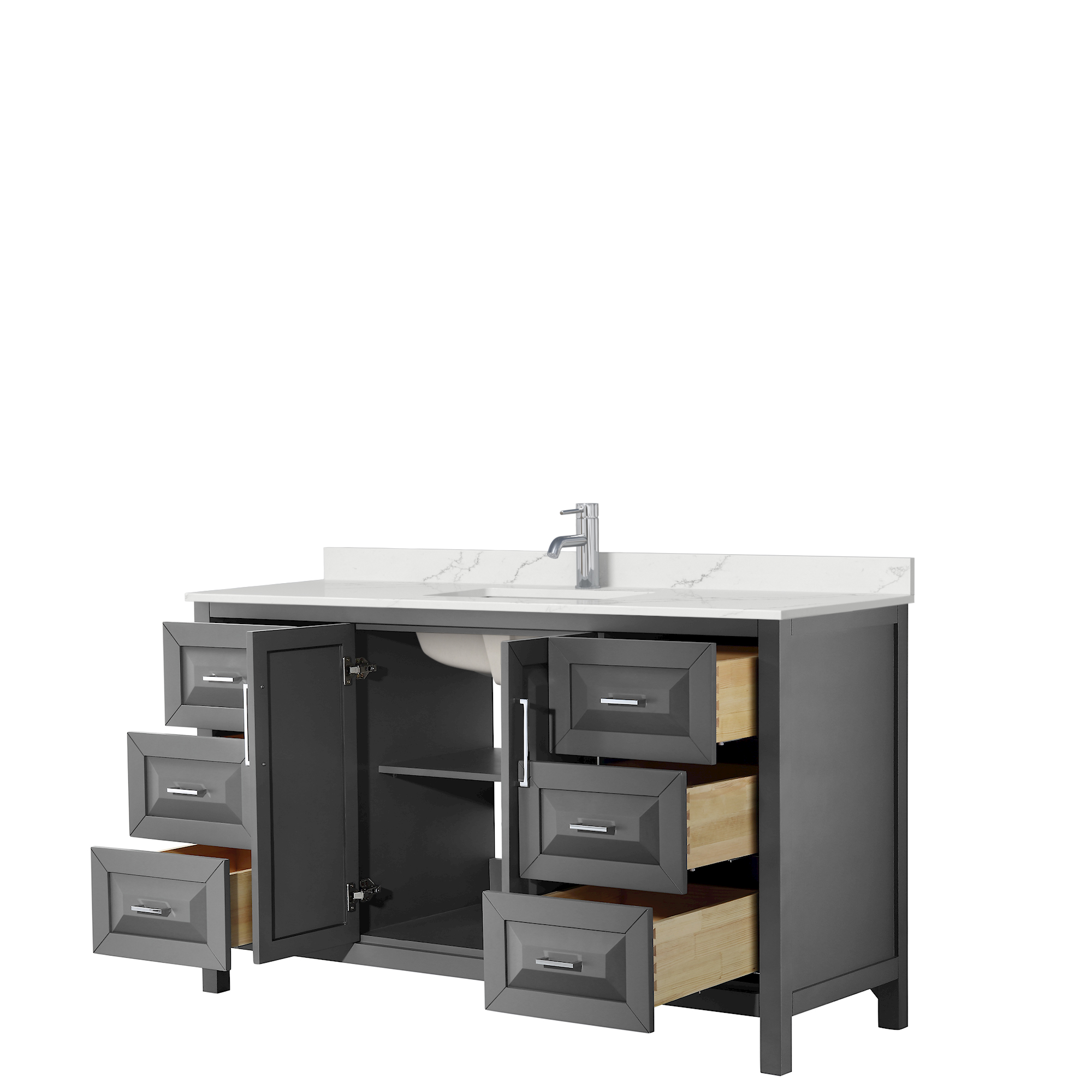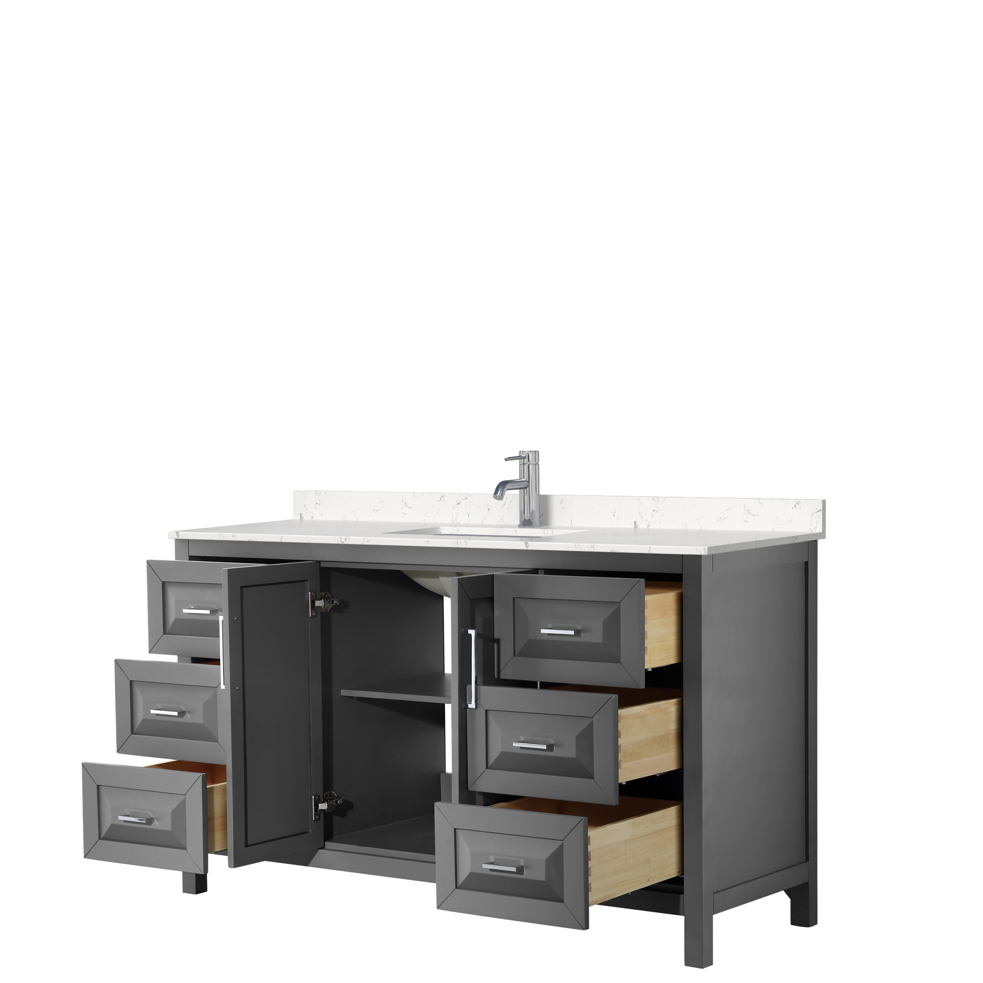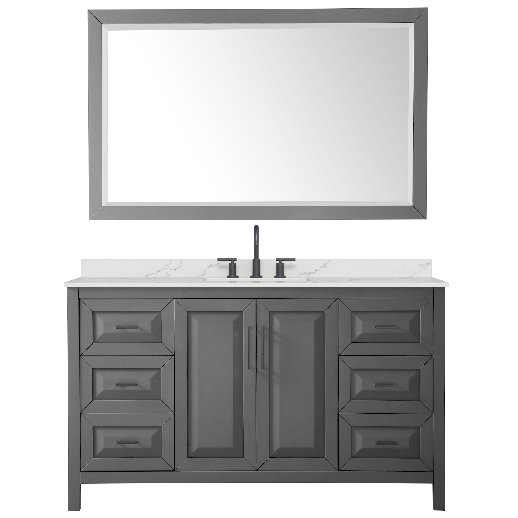 The beautiful Daria collection vanities stand out in any bathroom with strong, clean lines, raised panels and elegant counters with square sinks. There's plenty of cabinet space, the fully extending drawers are dovetail construction, and polished chrome or matte black finish detailing completes the look. Daria vanities deftly combine the function of today with a nod to the elegance of the past. It's the new modern - classic styling with a contemporary twist.