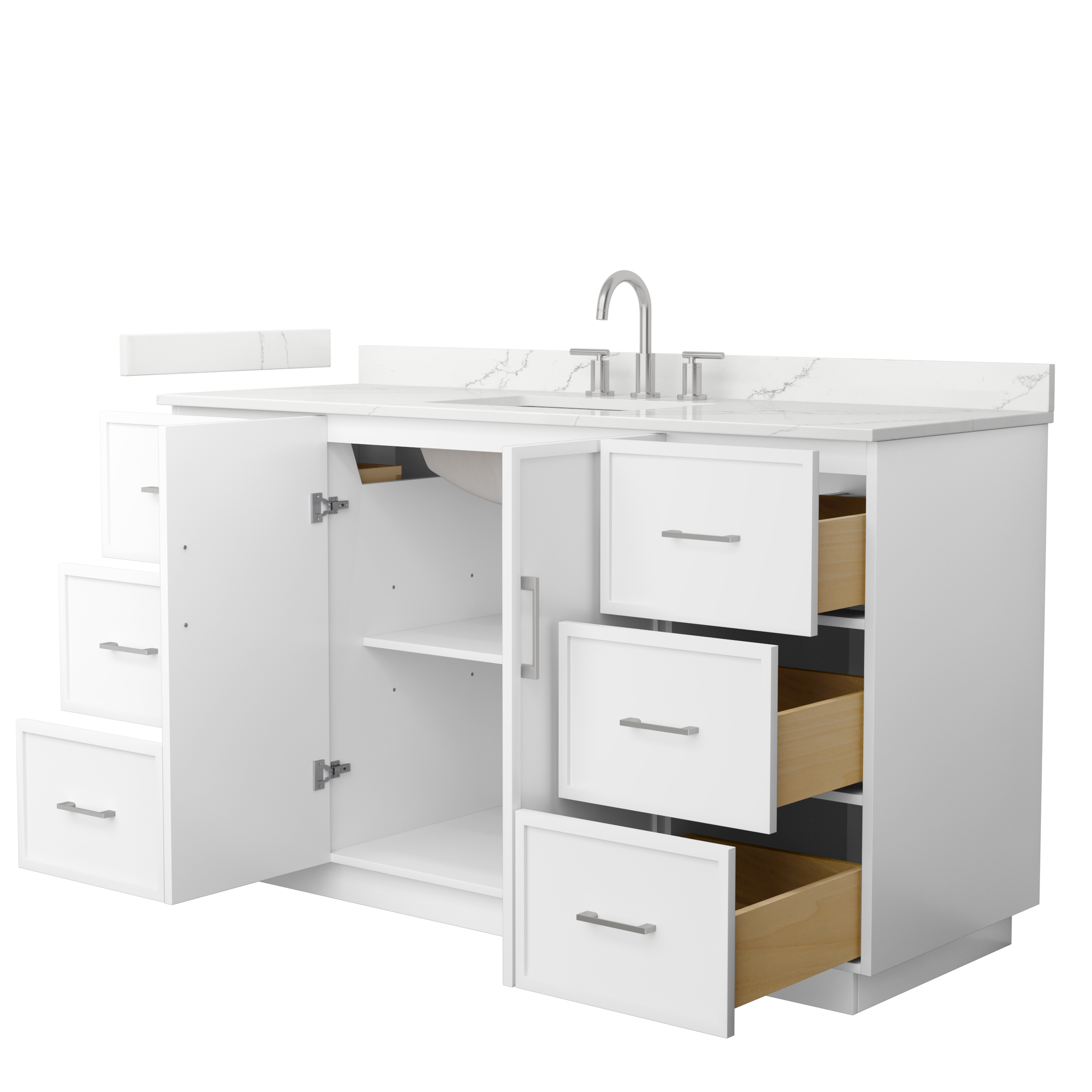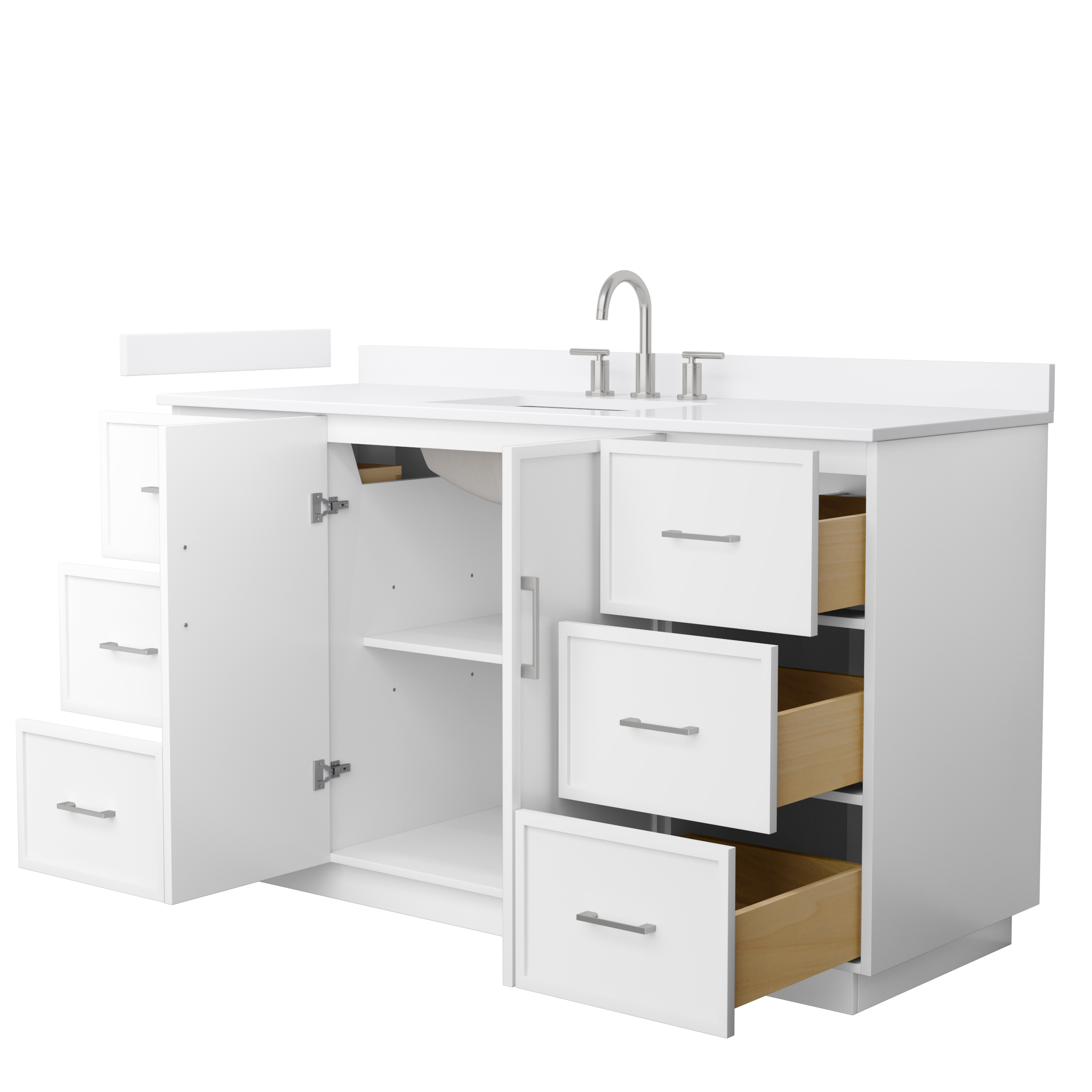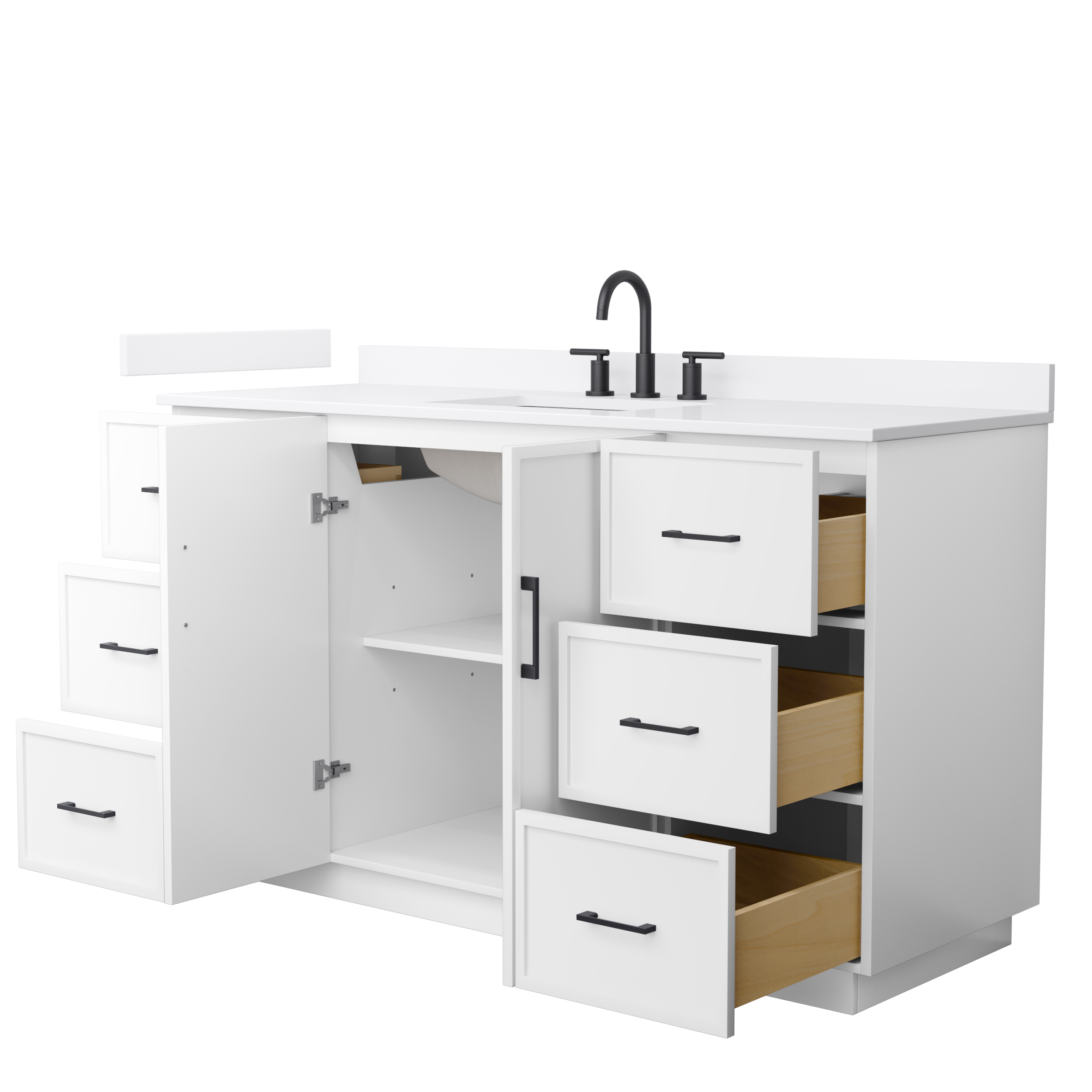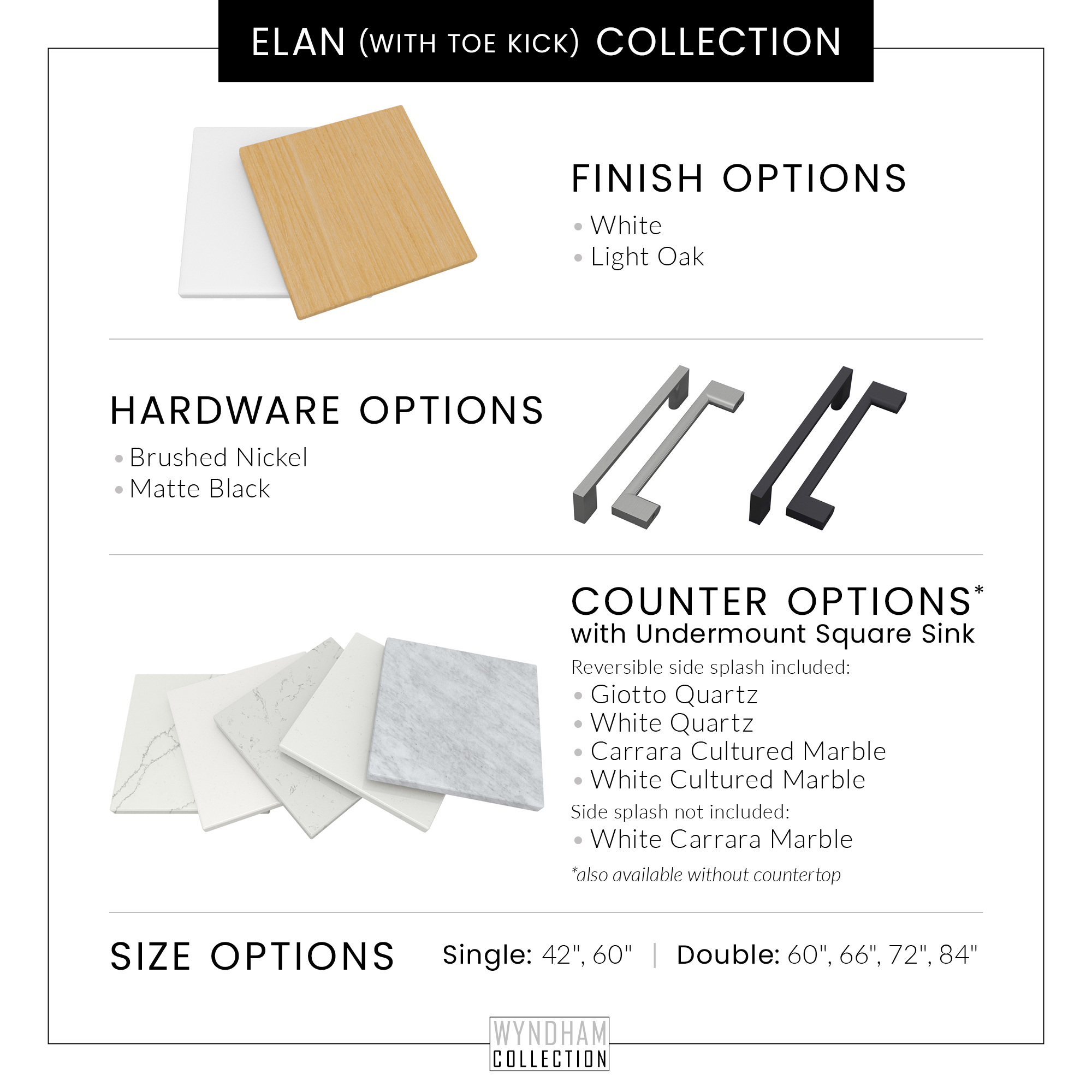 This transitional bathroom vanity exudes sleek sophistication with its clean lines and minimalist slim shaker design. The Elan vanity is crafted from high-quality materials like solid wood, with counters in multiple material options. Quartz and cultured stone counters include a back-and side-splash. Finished painted or in rift-cut light oak veneer, it seamlessly combines beauty and real-life usefulness. Its integrated, soft-closing drawers (featuring 3D adjustable glides) and doors offer ample storage space for toiletries, towels, and other essentials, keeping the space clutter-free. The sleek, angular hardware contributes to the overall aesthetic, creating a stylish focal point in the bathroom. Elevate your bathroom haven without compromising form or function.