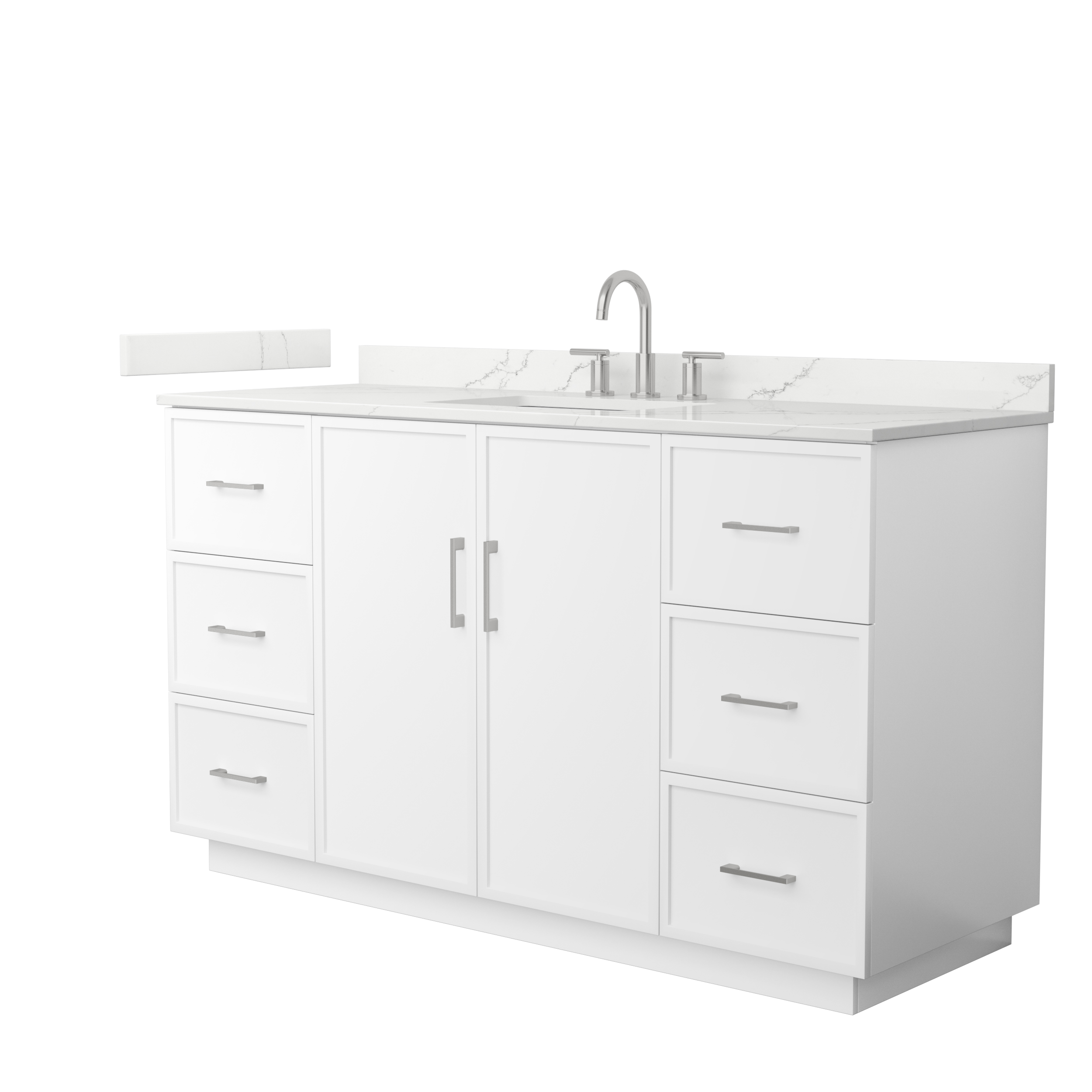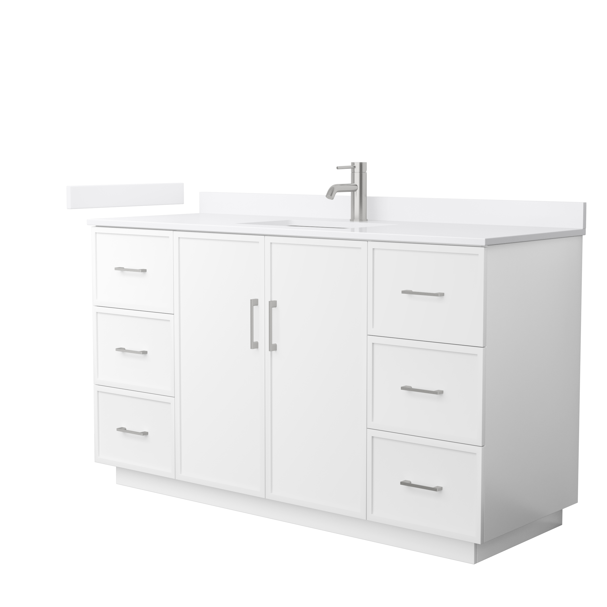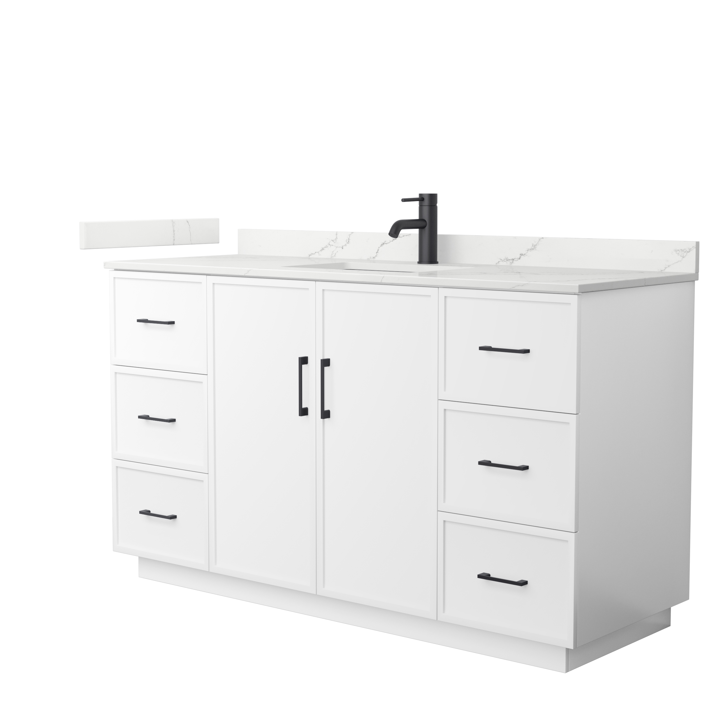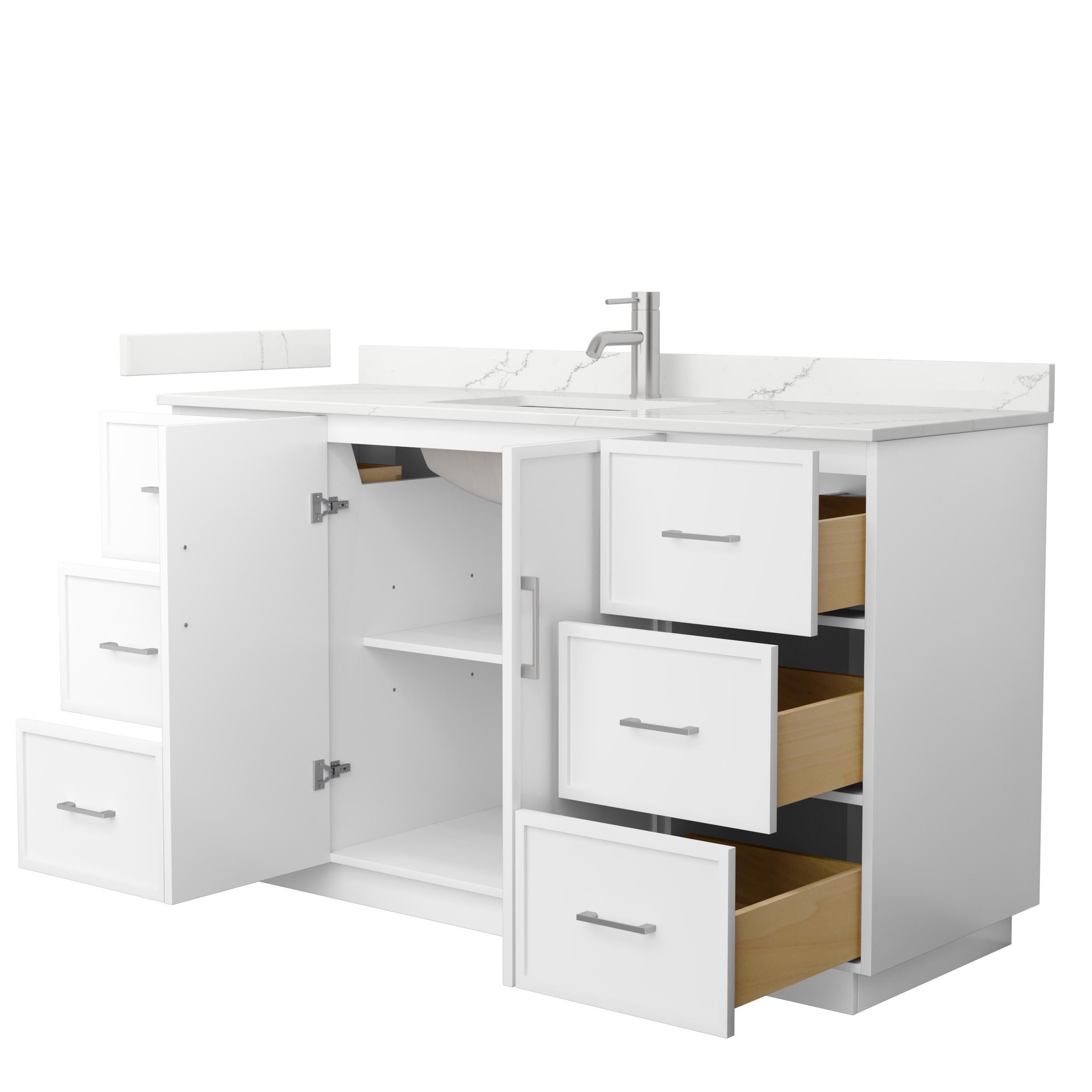 This transitional bathroom vanity exudes sleek sophistication with its clean lines and minimalist slim shaker design. The Elan vanity is crafted from high-quality materials like solid wood, with counters in multiple material options. Quartz and cultured stone counters include a back-and side-splash. Finished painted or in rift-cut light oak veneer, it seamlessly combines beauty and real-life usefulness. Its integrated, soft-closing drawers (featuring 3D adjustable glides) and doors offer ample storage space for toiletries, towels, and other essentials, keeping the space clutter-free. The sleek, angular hardware contributes to the overall aesthetic, creating a stylish focal point in the bathroom. Elevate your bathroom haven without compromising form or function.