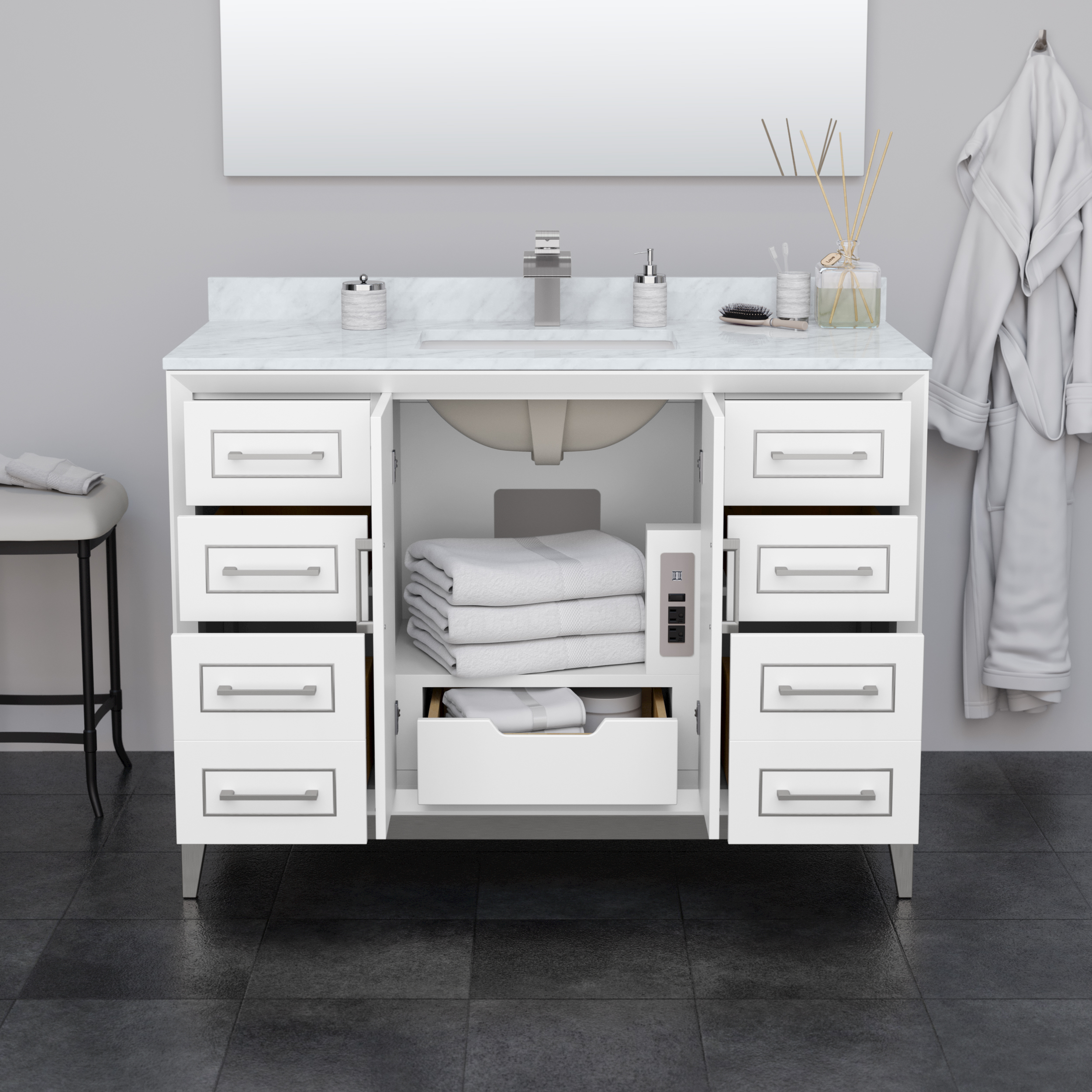 Classic luxurious elegance with clean and contemporary styling are the hallmarks of the beautiful Marlena vanity collection, perfect for most home decors. Offered in a range of sizes, cabinet colors and metal trim colors, you're sure to find the perfect fit. There's plenty of storage space, soft-close doors and drawers, internal drawers and the convenience of a 110v outlet and USB charger just inside the door. Offered with available Quartz, Carrara Marble, or Cultured Stone counters.