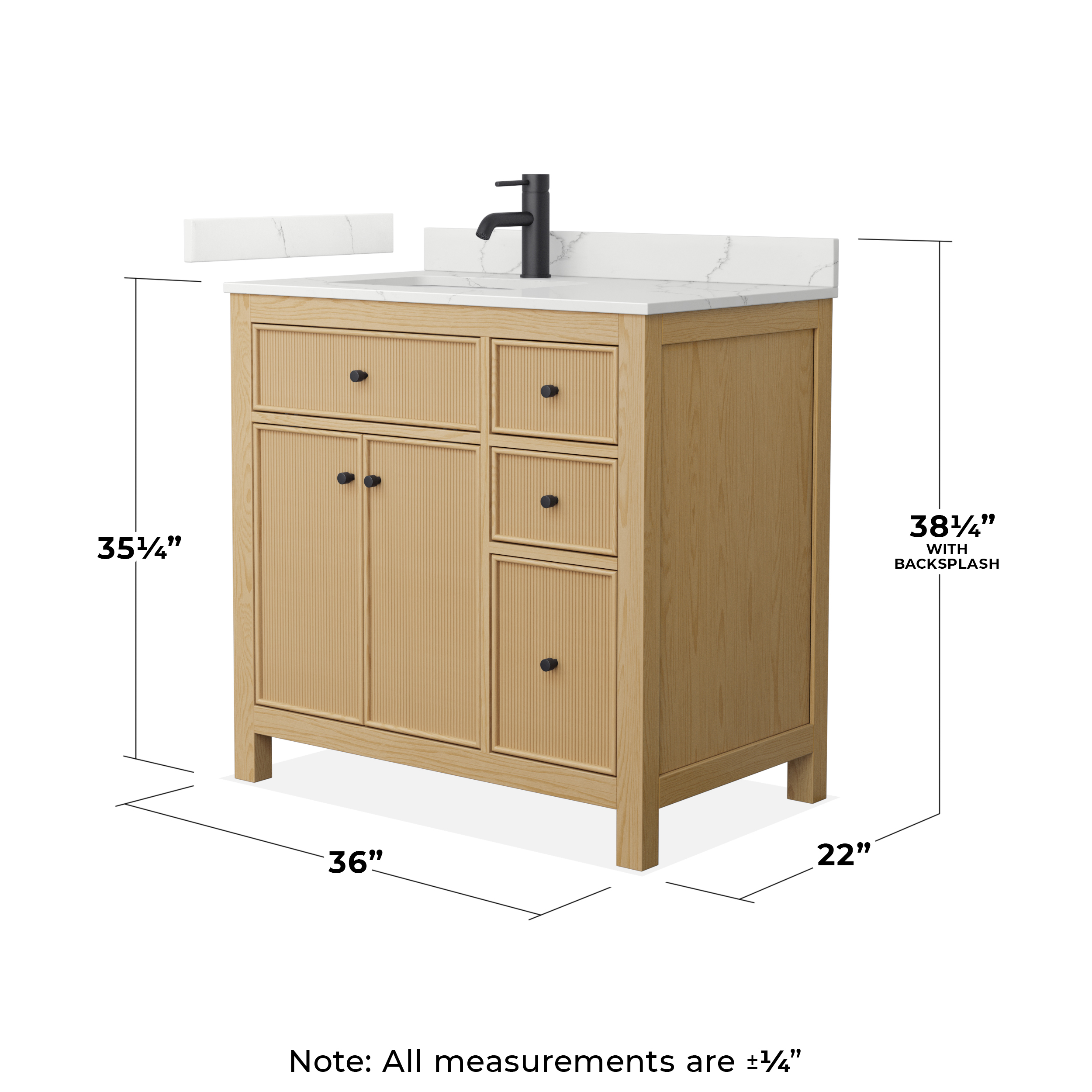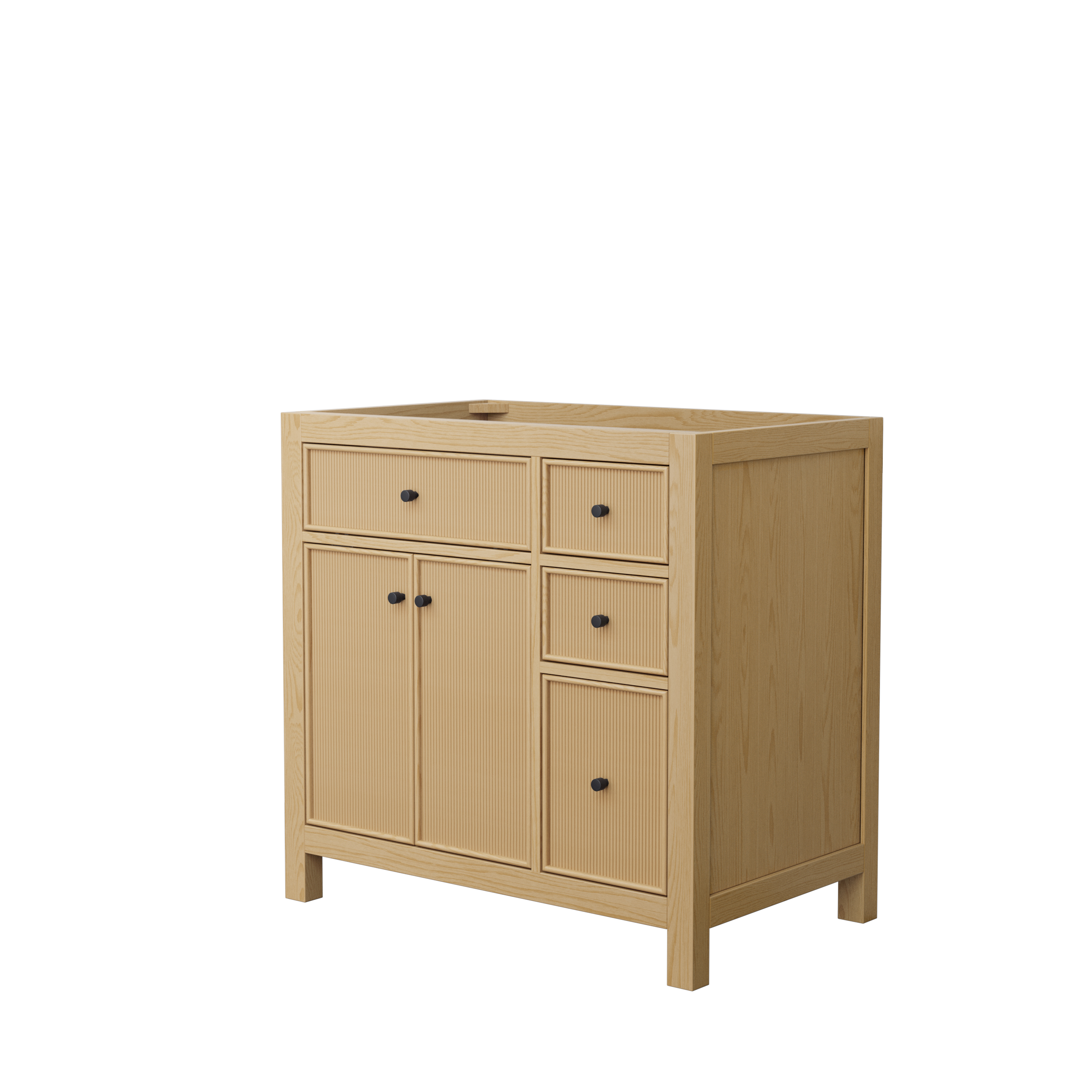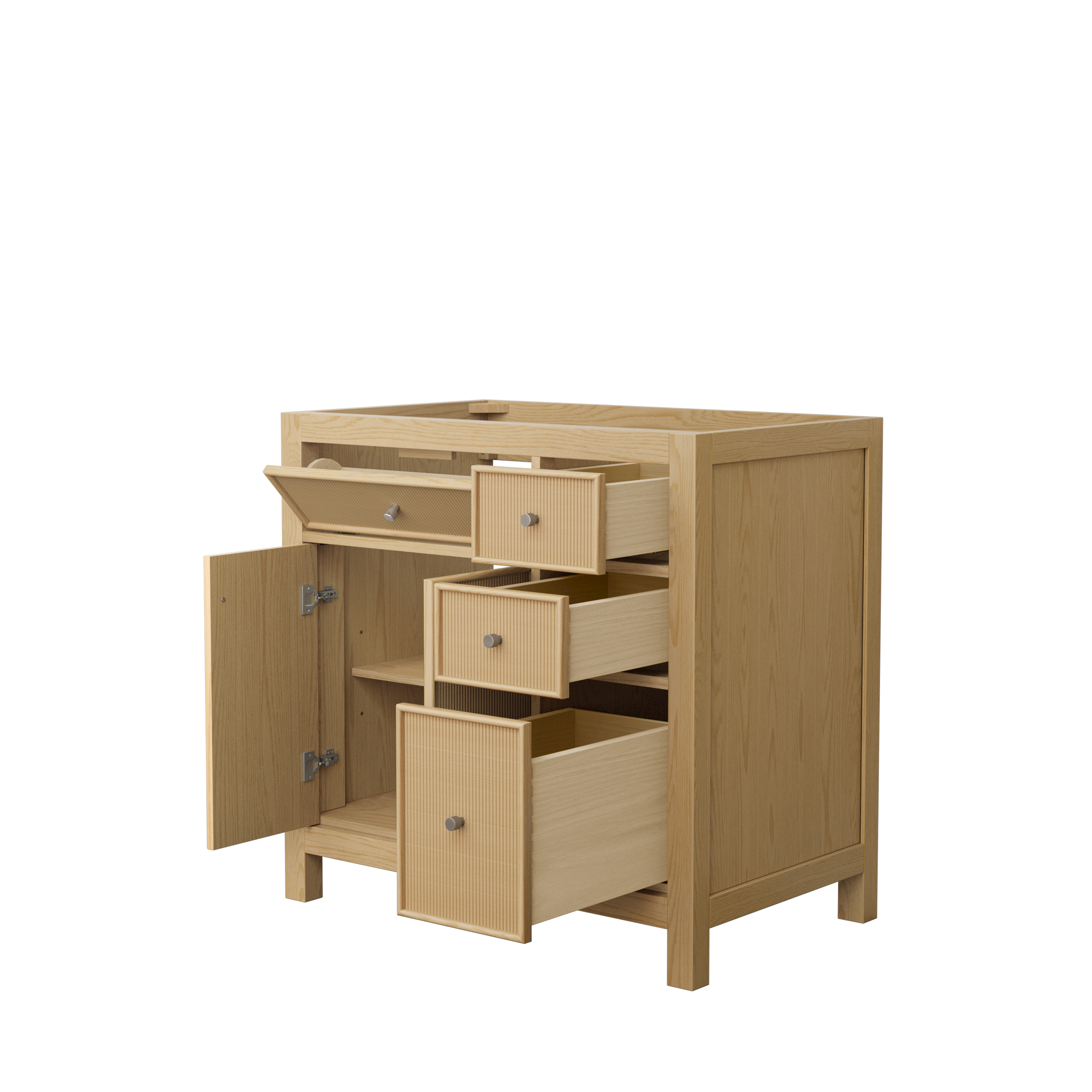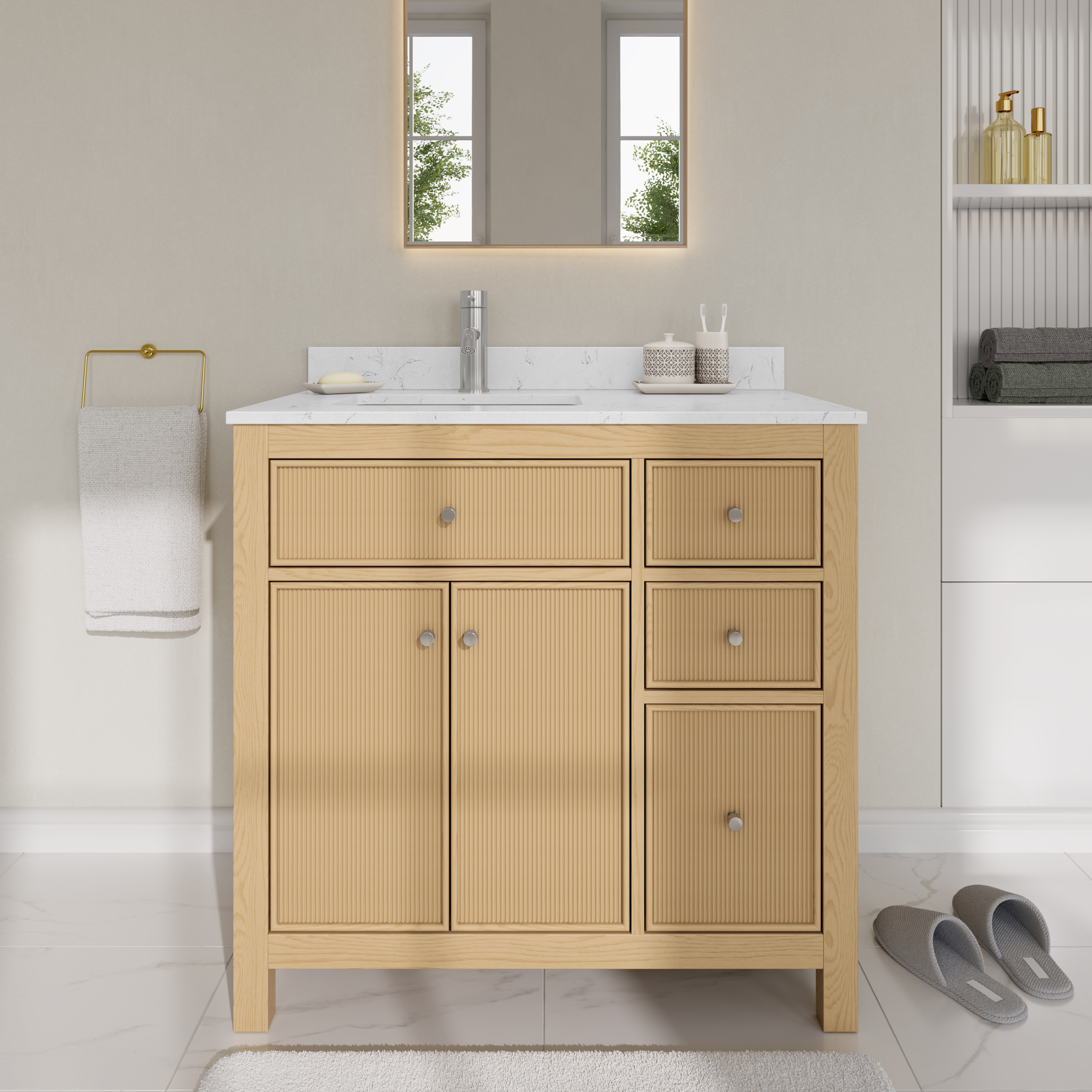 The Pendry wood veneered bathroom vanity collection beautifully blends natural country warmth with contemporary sophistication, creating a perfect centerpiece for any bathroom. Crafted from rich, natural wood veneers, it boasts a warm finish that highlights its organic grain and adds a cozy, inviting touch. Clean lines and minimalist hardware lend it a modern edge, while the soft-close drawers and doors ensure a quiet, seamless experience. Thoughtfully designed with ample counter and storage space to keep essentials neatly organized. This vanity is a harmonious mix of practicality and style, perfect for enhancing the character and functionality of your bathroom.