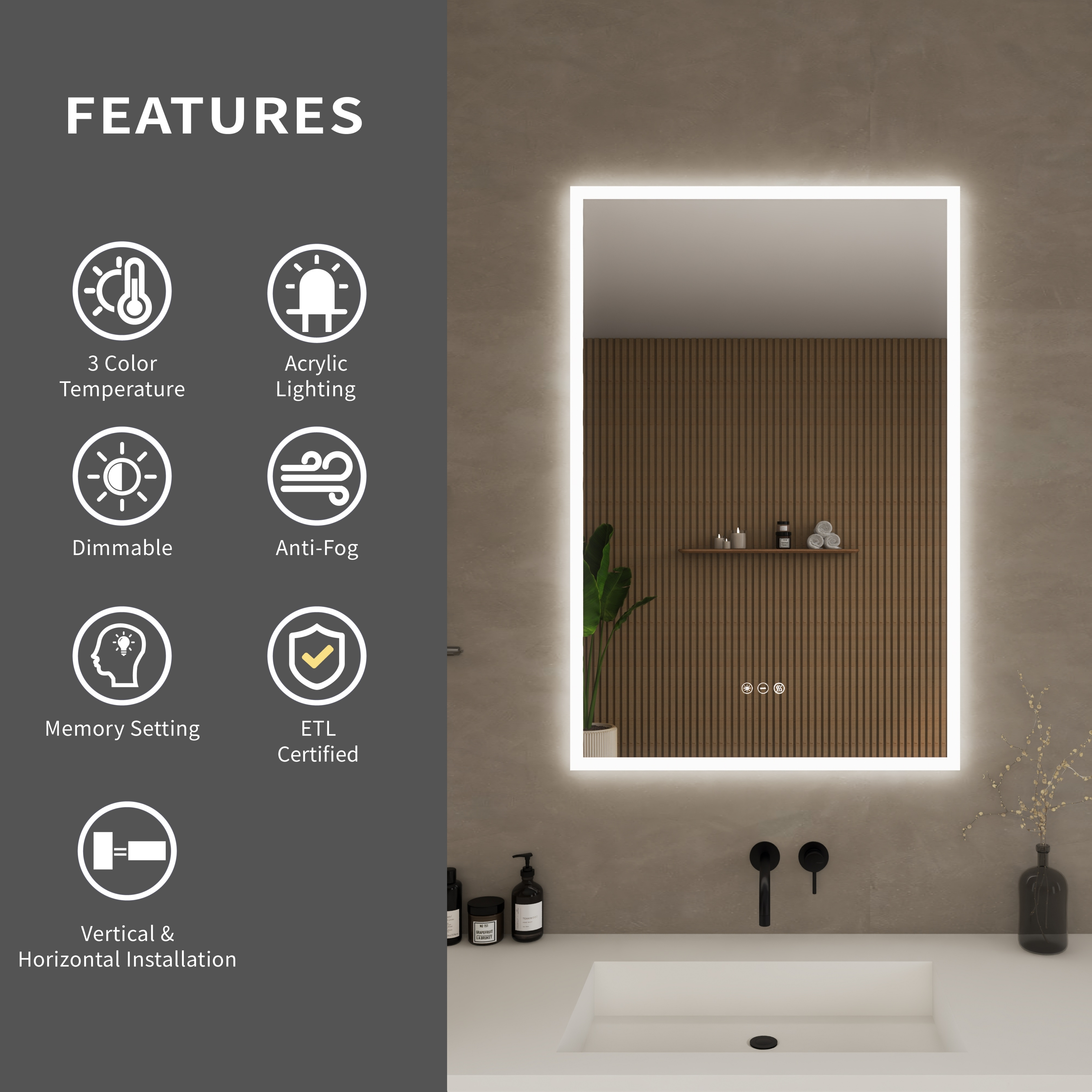 The Element LED Mirror Collection by Wyndham Collection elevates bathroom design with a perfect balance of function and style. Included in all sizes of the Element collection are adjustable color temperature ranging from 3000K to 5500K, allowing users to create the ideal lighting for any task or mood. Built-in dimming capabilities provide further control over brightness, while the integrated defogger ensures a clear reflection even after the hottest showers. Designed with a sleek all-around acrylic frame, the Element Collection not only enhances modern aesthetics but also maximizes light output and distribution, producing an optimal glow that transforms any bathroom into a well-lit space.