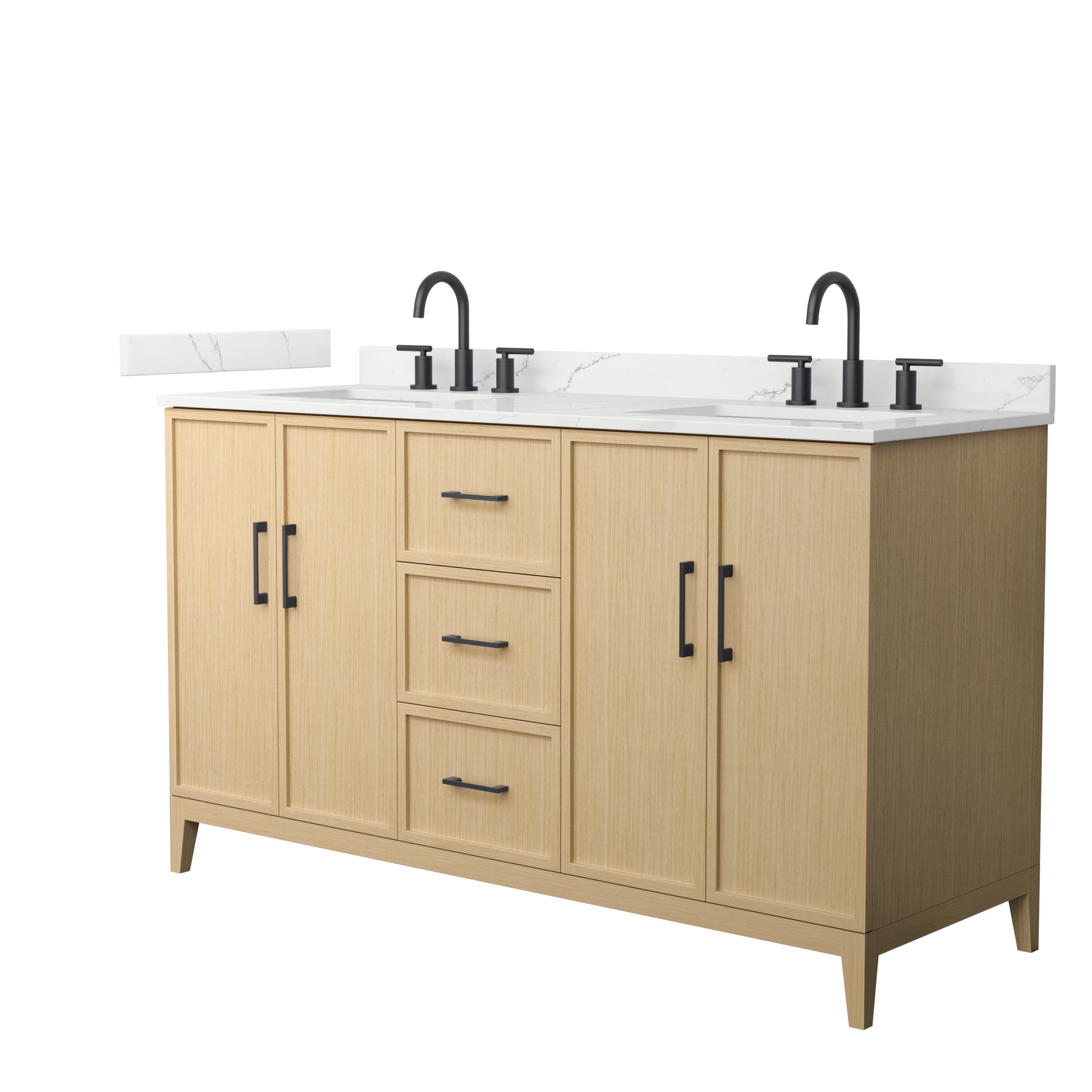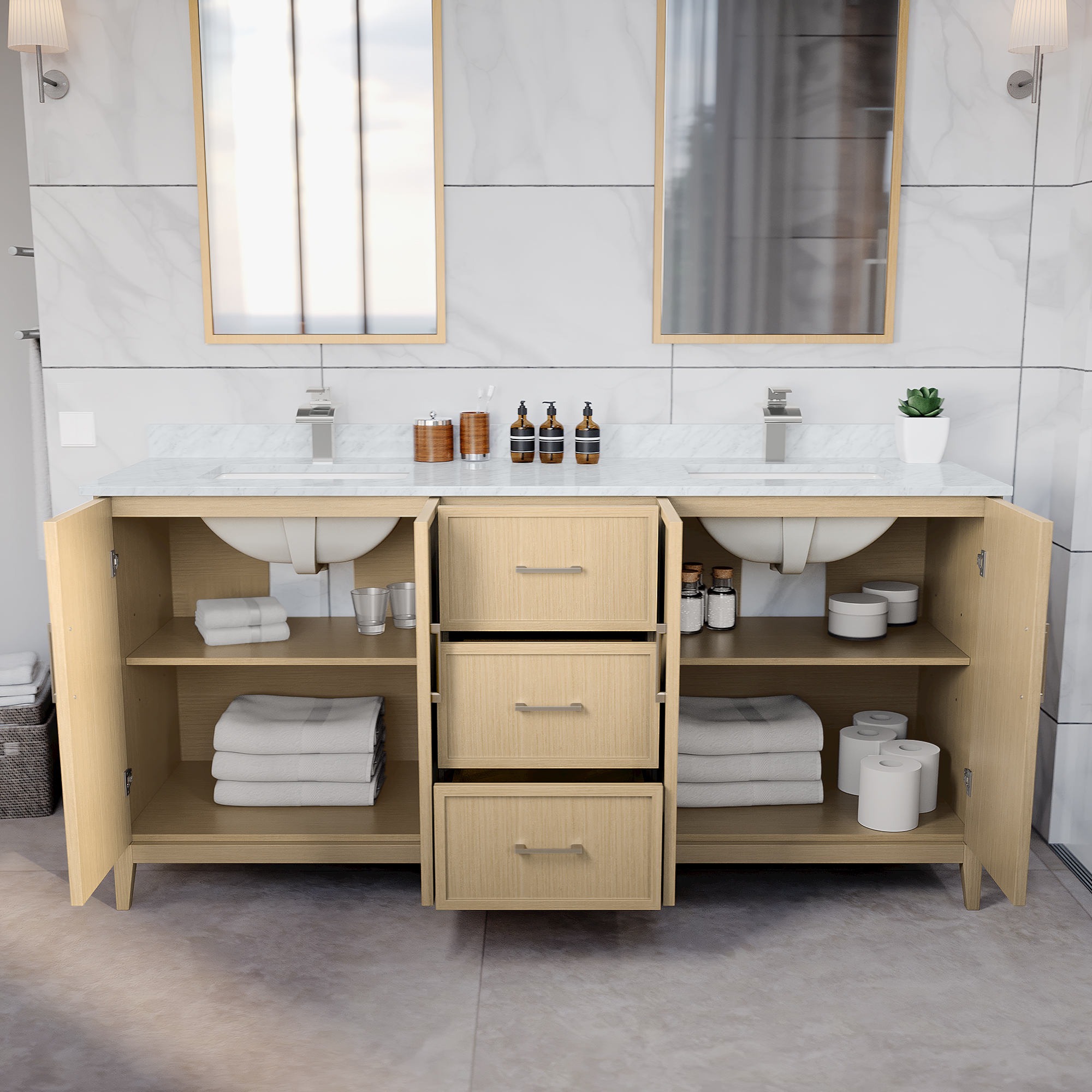 This transitional bathroom vanity exudes sleek sophistication with its clean lines and minimalist slim shaker design. The Elan vanity is crafted from high-quality materials like solid wood and plywood, with counters in multiple material options. Quartz and cultured stone counters include a back-and side-splash. Finished painted or in rift-cut white oak veneer, it seamlessly combines beauty and real-life usefulness. Its integrated, soft-closing drawers (featuring 3D adjustable glides) and doors offer ample storage space for toiletries, towels, and other essentials, keeping the space clutter-free. The sleek, angular hardware contributes to the overall aesthetic, creating a stylish focal point in the bathroom. Elevate your bathroom haven without compromising form or function.