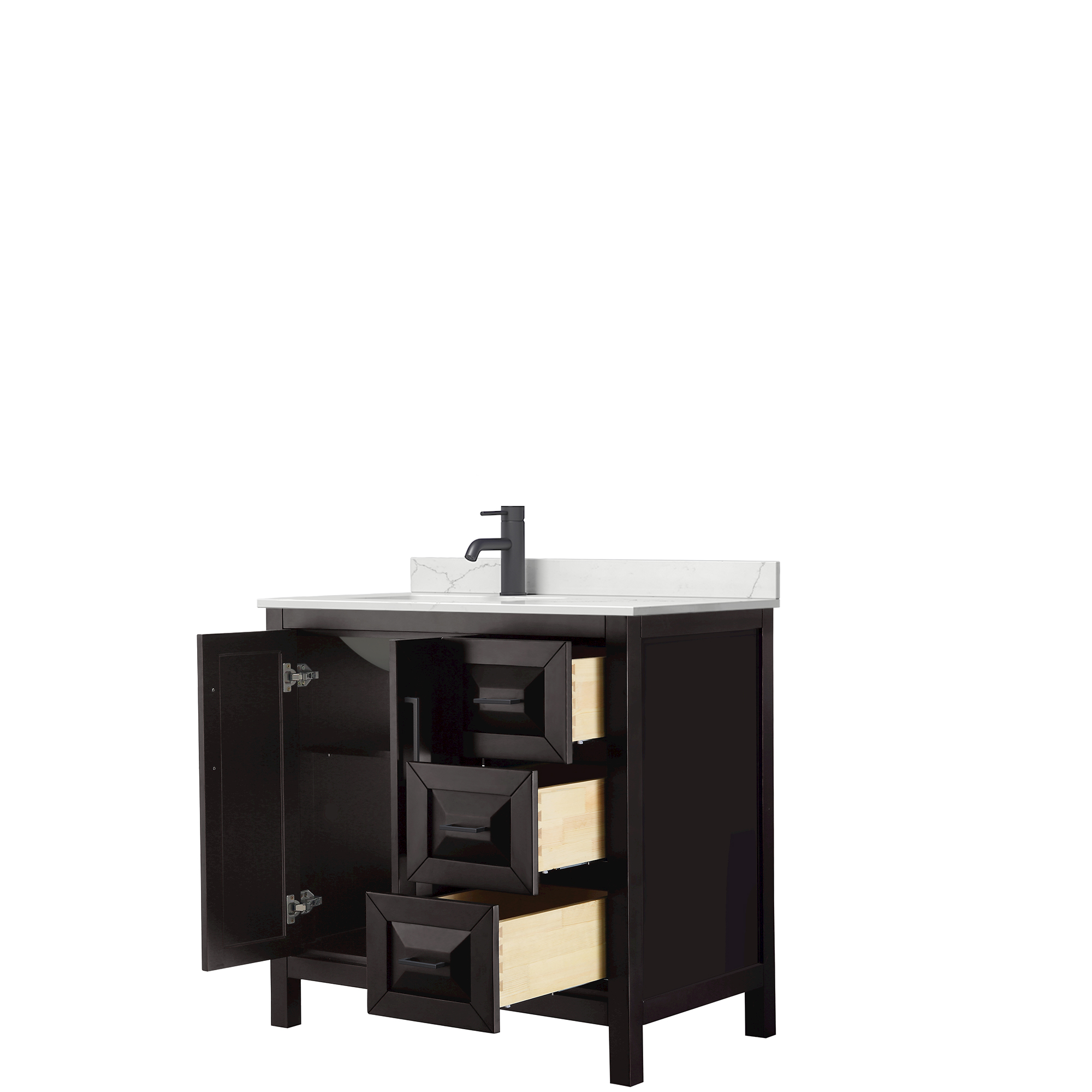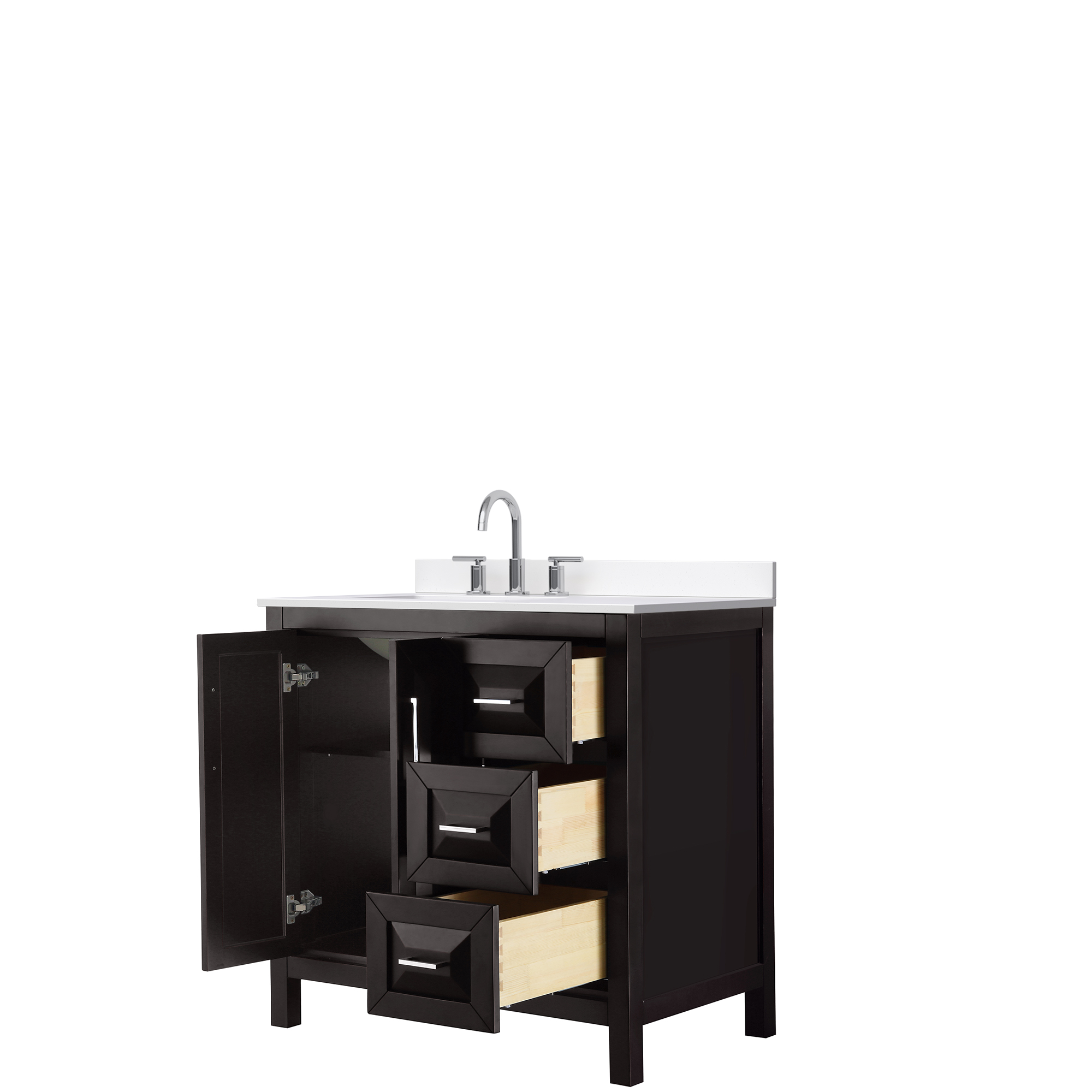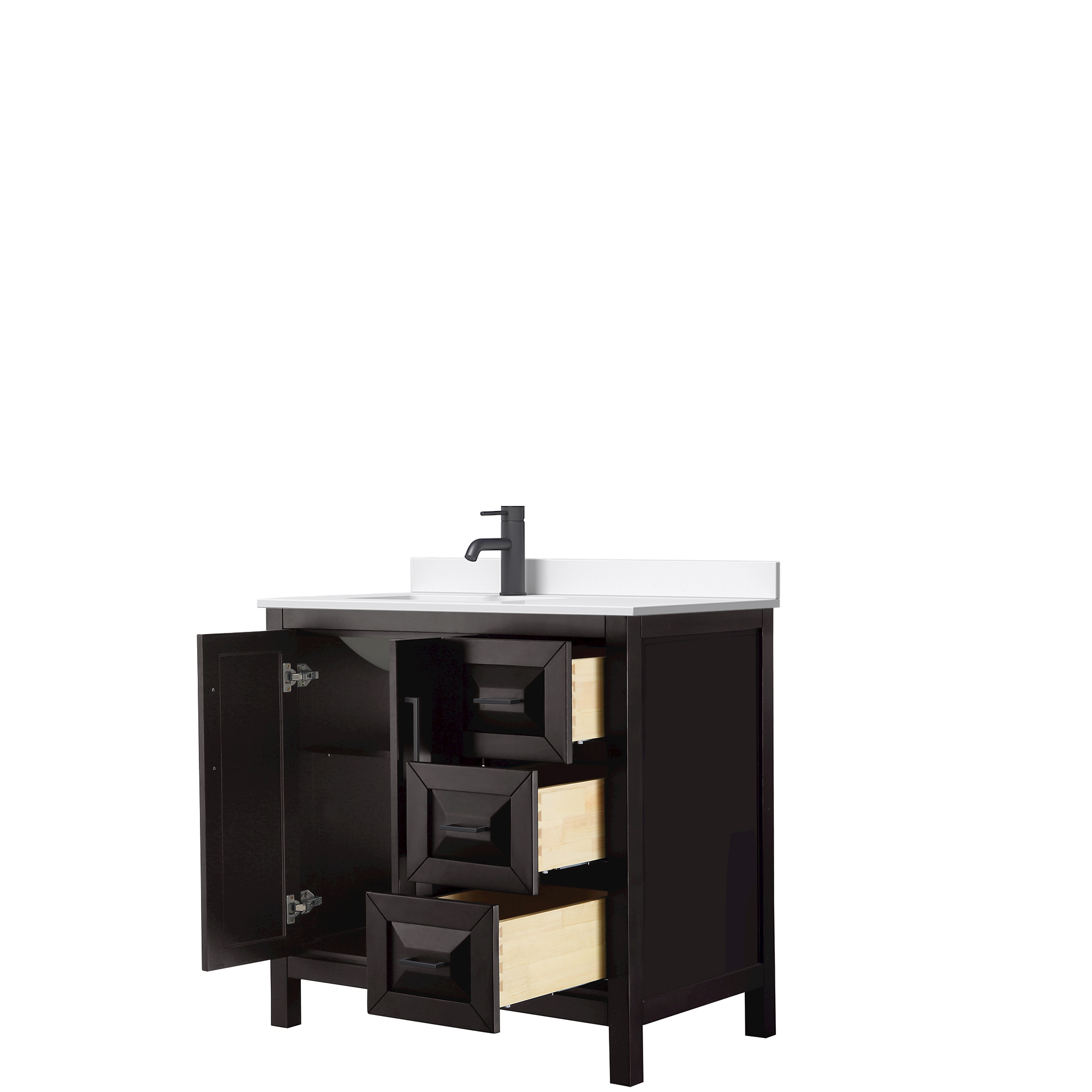 The beautiful Daria collection vanities stand out in any bathroom with strong, clean lines, raised panels and elegant counters with square sinks. There's plenty of cabinet space, the fully extending drawers are dovetail construction, and matte black or polished chrome finish detailing completes the look. Daria vanities deftly combine the function of today with a nod to the elegance of the past. It's the new modern - classic styling with a contemporary twist.
